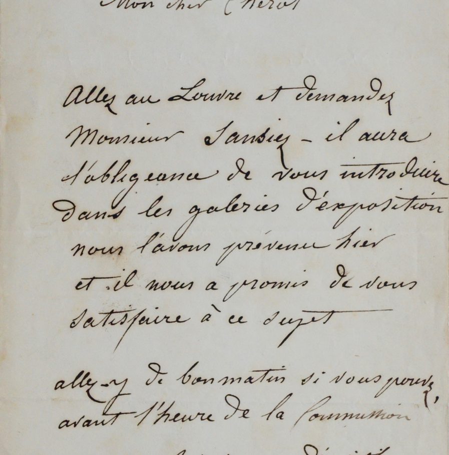 "Allez au Louvre et demandez Monsieur Sensier [Alfred Sensier], il aura l’obligeance de vous introduire dans les galeries d’exposition nous l’avons prévenu hier et il nous a promis de vous satisfaire à ce sujet. Allez-y de bon matin si vous pouvez avant l'heure de la commission [...]".