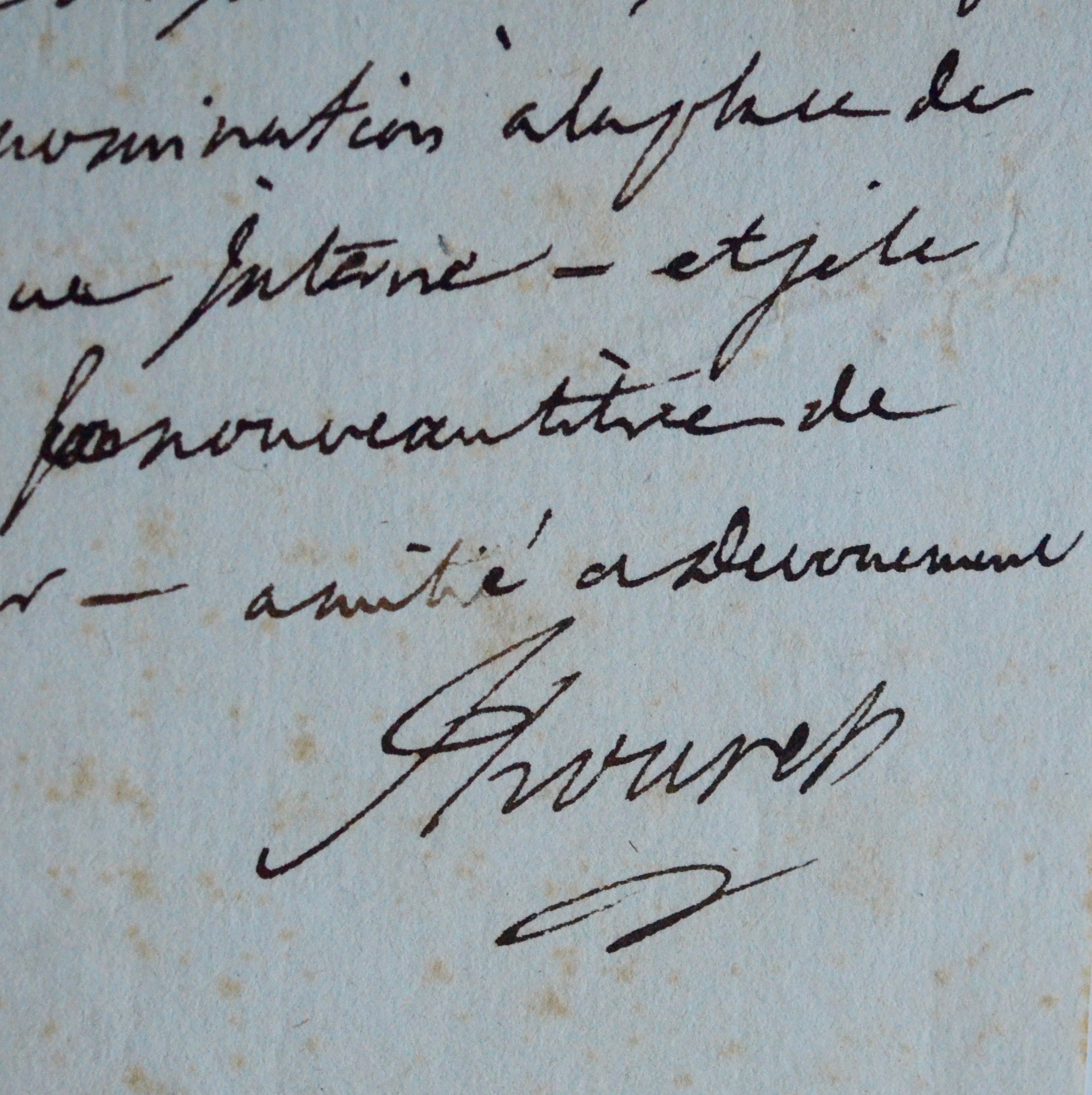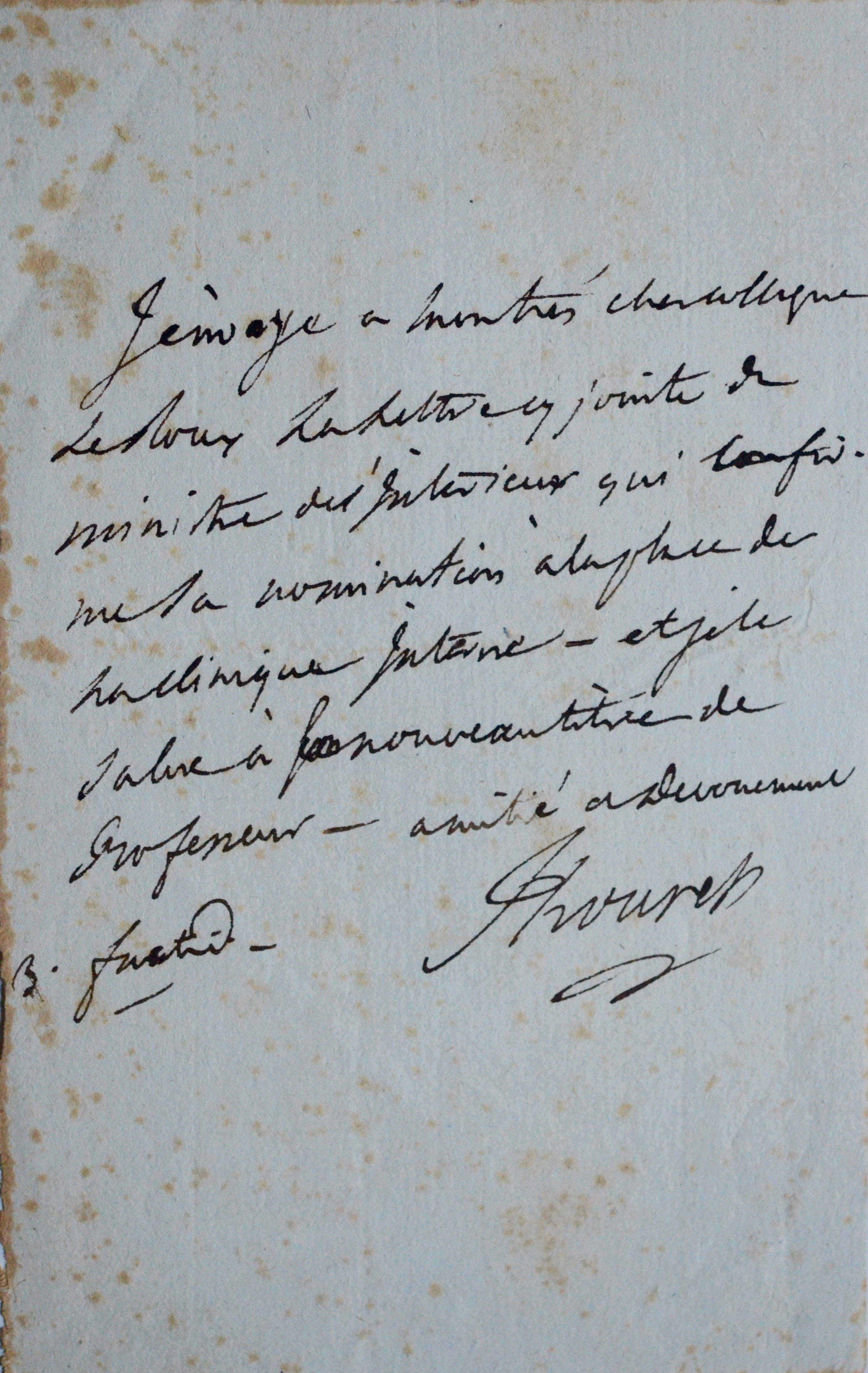 Lettre du médecin Michel Augustin Thouret "J'envoye à mon très cher collègue Le Roux la lettre cy-jointe du ministre de l'Intérieur qui confirme sa nomination à la place de la clinique interne, et je le salue à son nouveau titre de Professeur. Amitié & dévouement".
