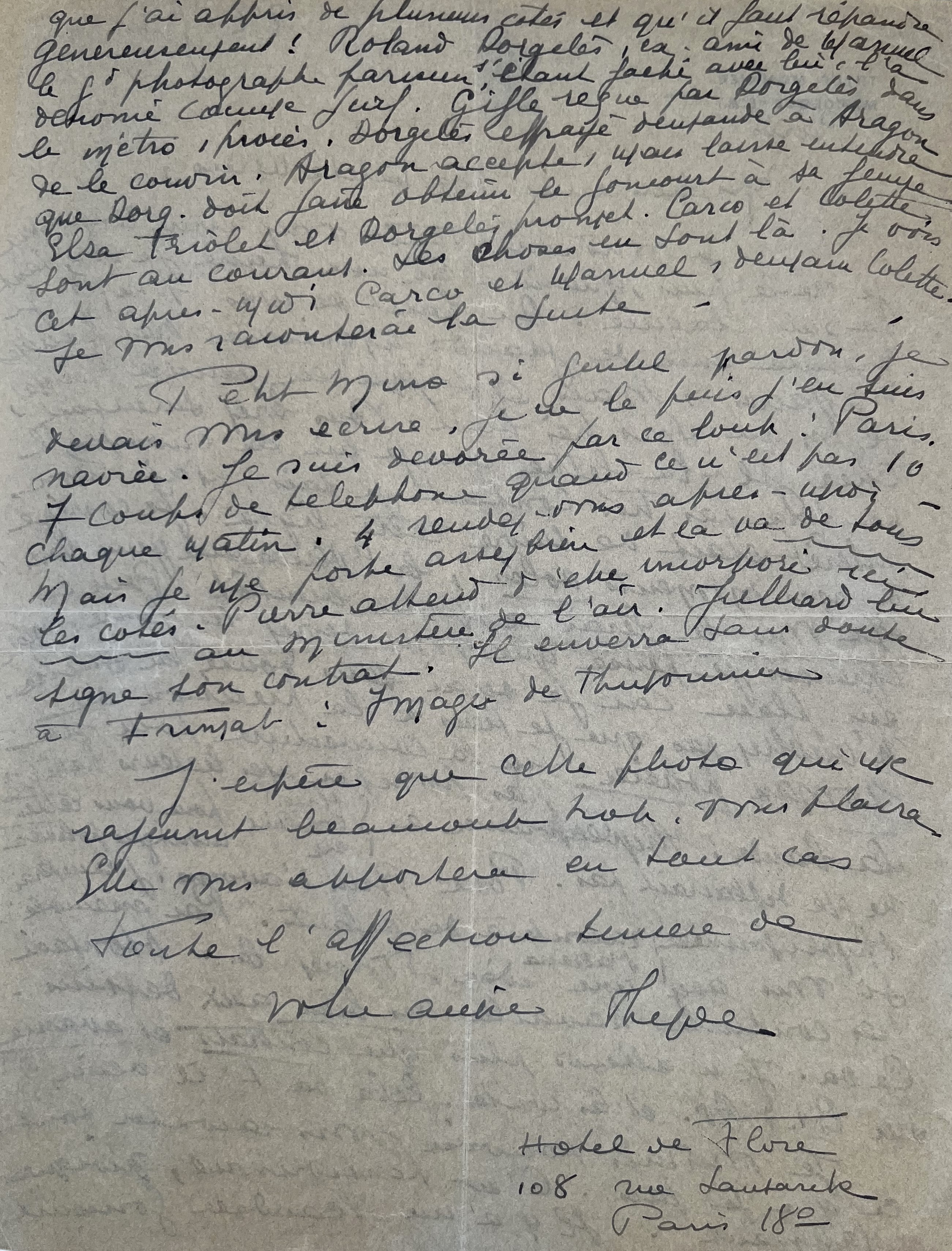 "Il y a un scandale Goncourt que j'ai appris de plusieurs côtés et qu'il faut répandre généreusement. Roland Dorgelès, ex-ami de Manuel le gd photographe parisien, s'étant fâché avec lui, l'a dénoncé comme juif. Gifle reçue par Dorgelès dans le métro, procès. Dorgelès effrayé demande à Aragon de le couvrir. Aragon accepte, mais laisse entendre que Dorg. doit faire obtenir le Goncourt à sa femme Elsa Triolet et Dorgelès promet. Carco et Colette sont au courant. Les choses en sont là. Je vois cet après-midi Carco et Manuel, demain Colette. Je vous raconterai la suite [...]".