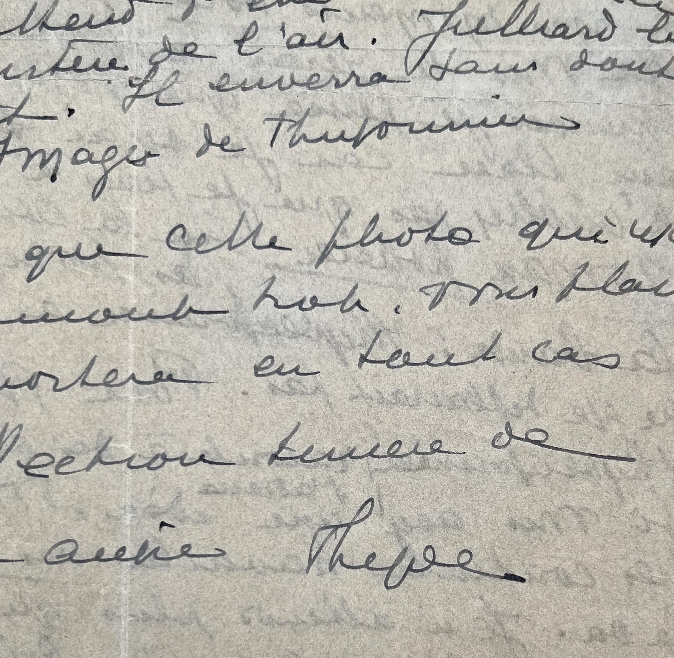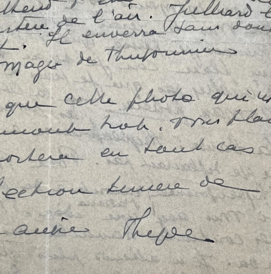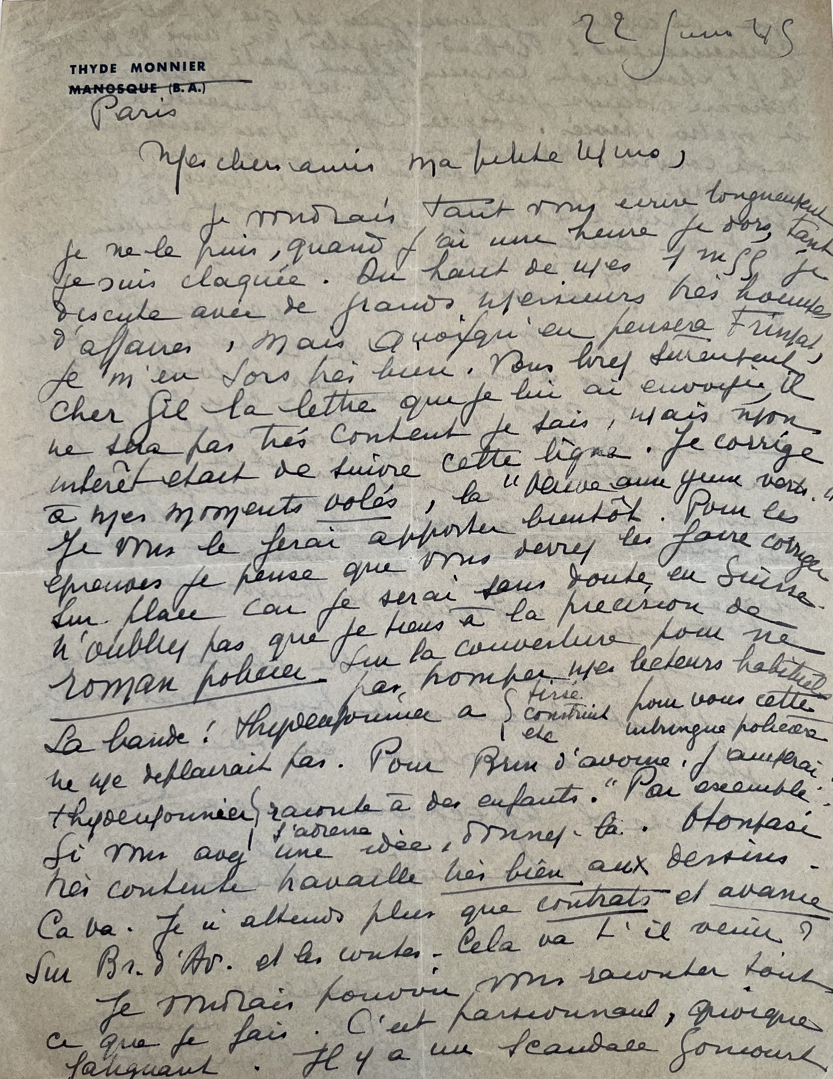 Elle termine la correction "à mes moments volés" de son dernier roman La Veuve aux yeux verts [Gutenberg, 1945]. Et demande à ce qu'on termine les dernières corrections à sa place, car elle doit se rendre en Suisse. "N'oubliez que je tiens à la précision de roman policier sur la couverture pour ne pas tromper mes lecteurs habituels. La bande : Thyde Monnier a tiré/construite/etc. pour vous cette intrigue policière, ne me déplairait pas [...]".