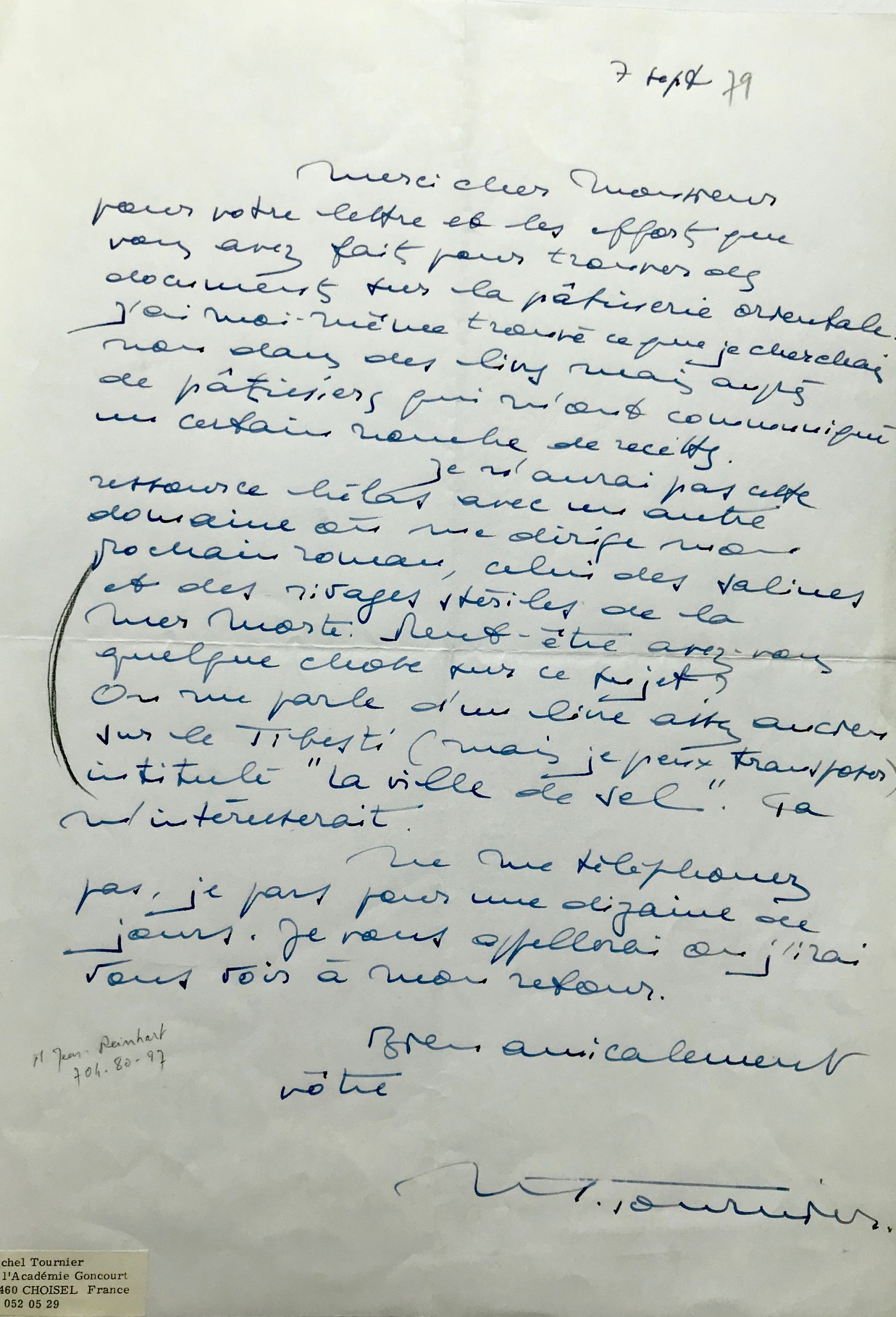 Il remercie chaudement son correspondant pour ses recherches sur la pâtisserie orientale et les documents qu'il a réunis à ce sujet. Il ajoute : "J'ai moi-même trouvé ce que je cherchais non dans les livres mais auprès des pâtissiers qui m'ont communiqué un certain nombre de recettes. Je n'aurai pas cette ressource hélas avec un autre domaine où me dirige mon prochain roman, celui des salines et des rivages stériles de la mer morte. Peut-être avez vous quelques chose sur ce sujet ? [...]". Il voudrait se procurer un livre sur le Tibesti, massif montagneux du Sahara central, intitulé "La Ville de sel" [Carl et Petit, Julliard, 1954].