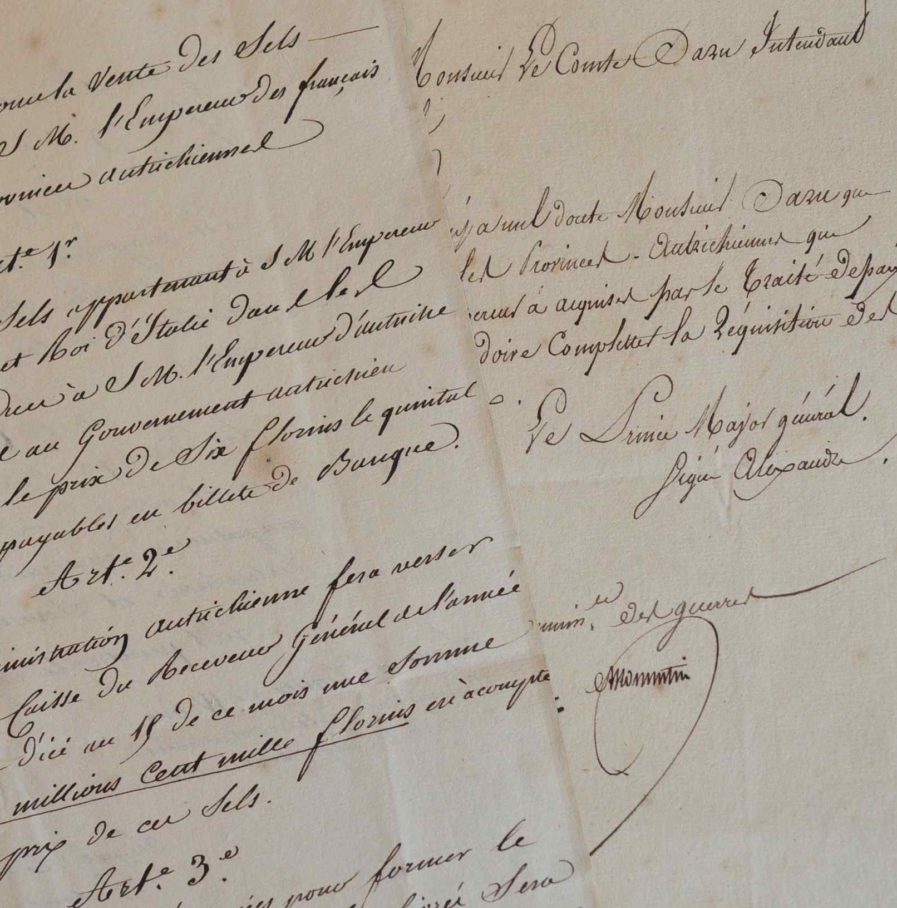 Traité en 6 articles pour la vente des sels appartenant à Sa Majesté l'Empereur des français [Napoléon] dans les provinces autrichiennes, signé par l'intendant général des Pays conquis, Pierre Daru. Il prévoit, notamment, un prix de six florins le quintal payable en billets de banque et le versement d'un acompte de 2 600 000 florins. On joint : la traduction en français du règlement de la prise des provisions de sels par une compagnie autrichienne, 2 pp. in-folio («le sel leur sera remis d'après la consignation et la révision faite de chaque magasin») et la copie d'une lettre du Prince Major général Alexandre Berthier (Schönbrunn, 31 oct. 1809, 1 p. in-folio), à l'intendant général des Pays conquis, Pierre Daru, portant la signature autographe du Commissaire des guerres, demandant la réquisition des chevaux des provinces autrichiennes.