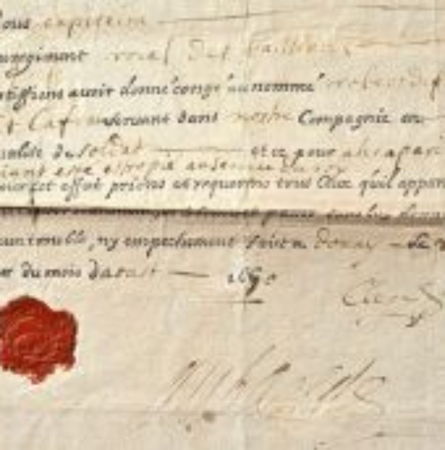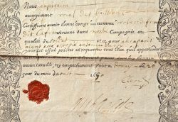 Beau document, orné d'un large encadrement gravé. Congé accordé à un soldat du régiment Royal des Vaisseaux, "Robert de France, dit La France", estropié au service du roy. Signé par deux capitaines en pie du régiment, D'Aubarède et Desprez-Cléry.