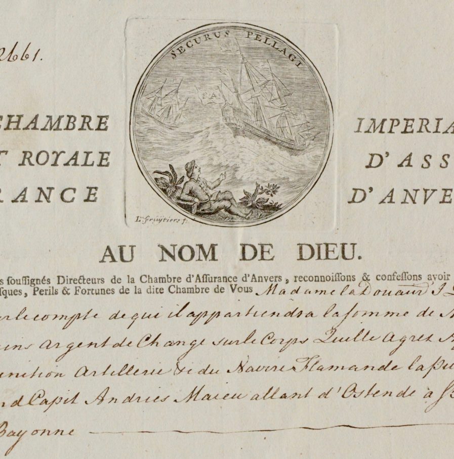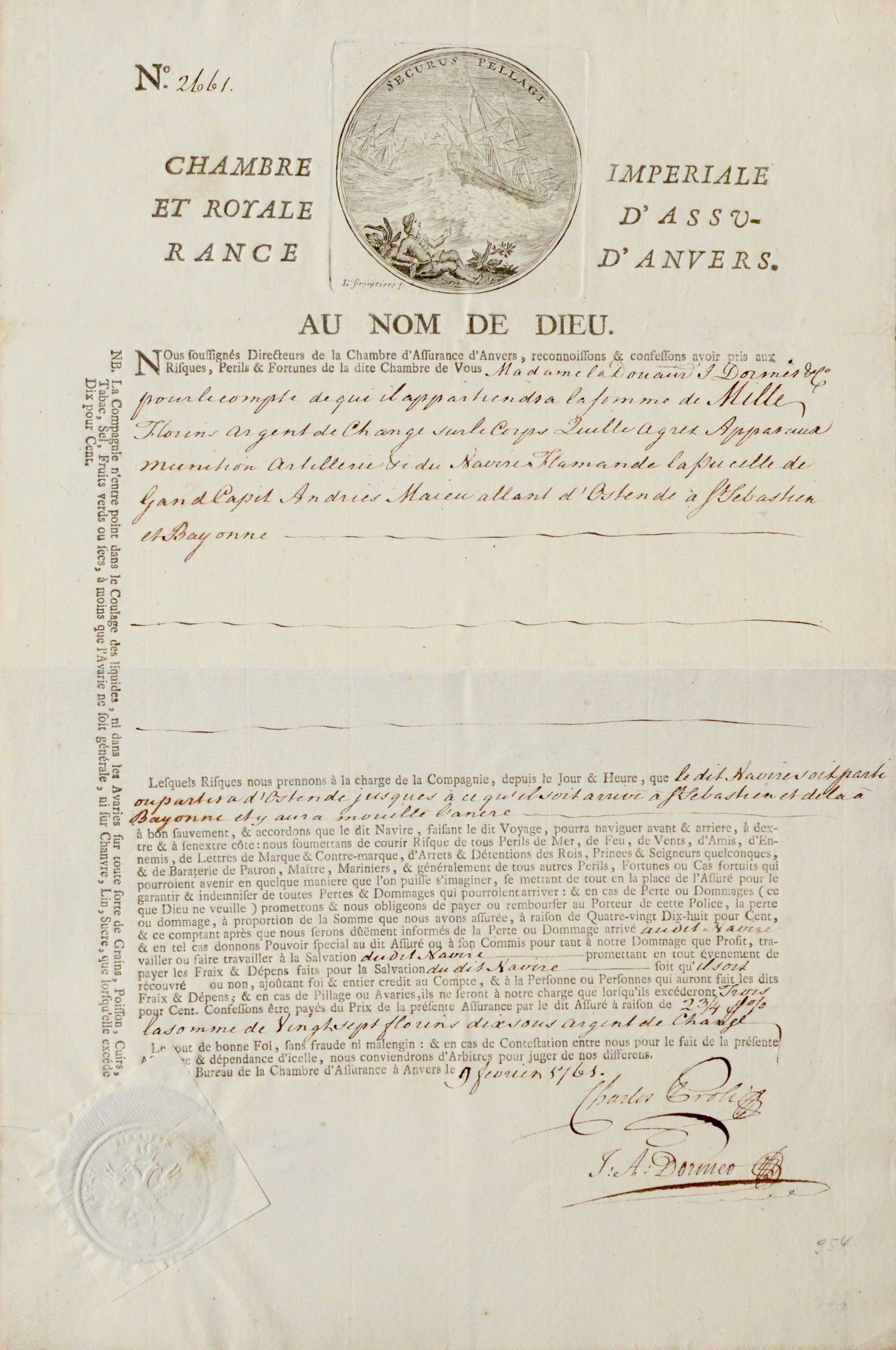 Grand et beau document, en parti imprimé, avec vignette gravée en tête (représentant des navires dans la tourmente), signée L. Fruytiers [le graveur Lodewyk Joseph Fruytiers (Malines 1713-1782)] avec devise "Securus Pellagi" de la Chambre impériale et royale d'assurance d'Anvers. Sceau sous papier.