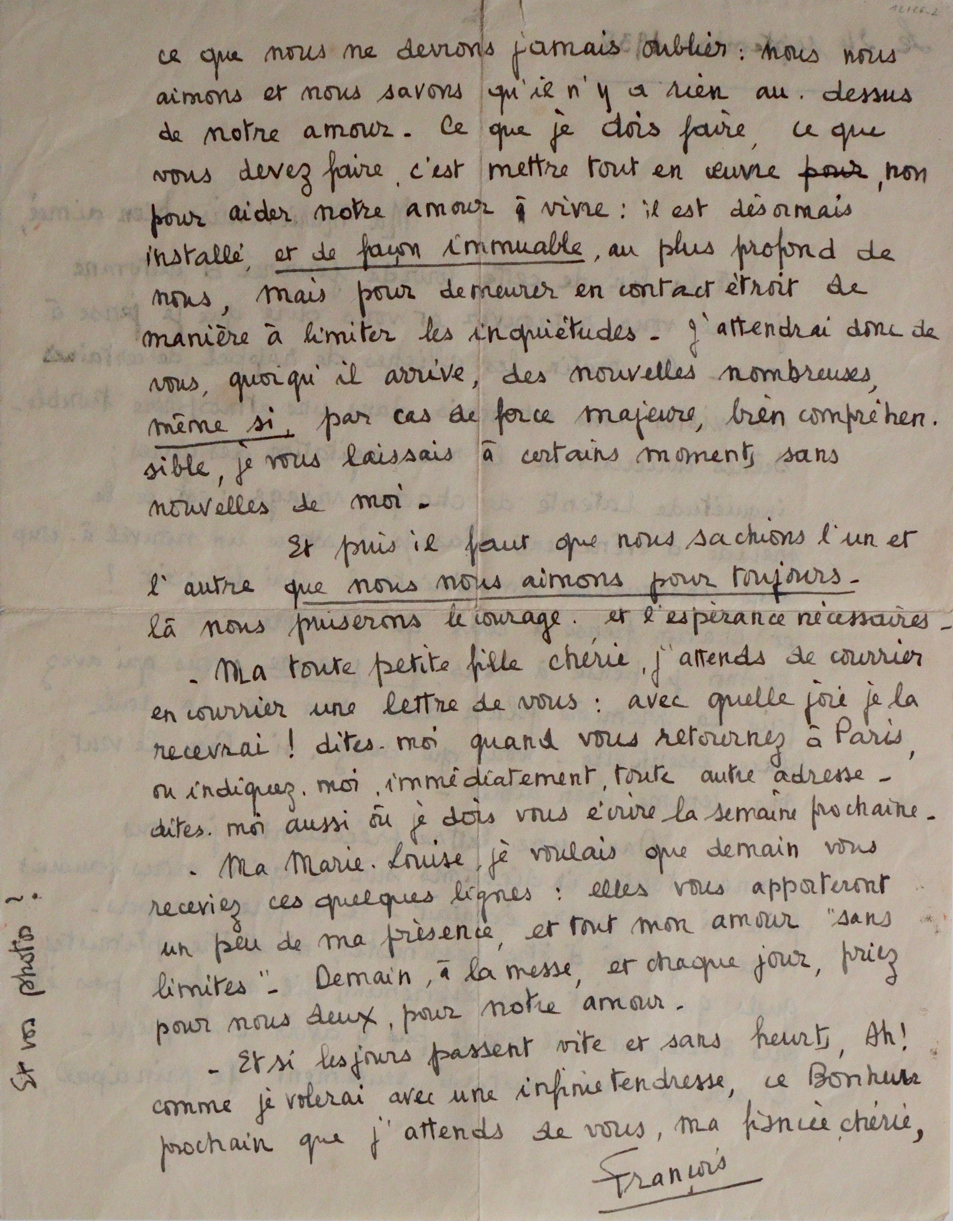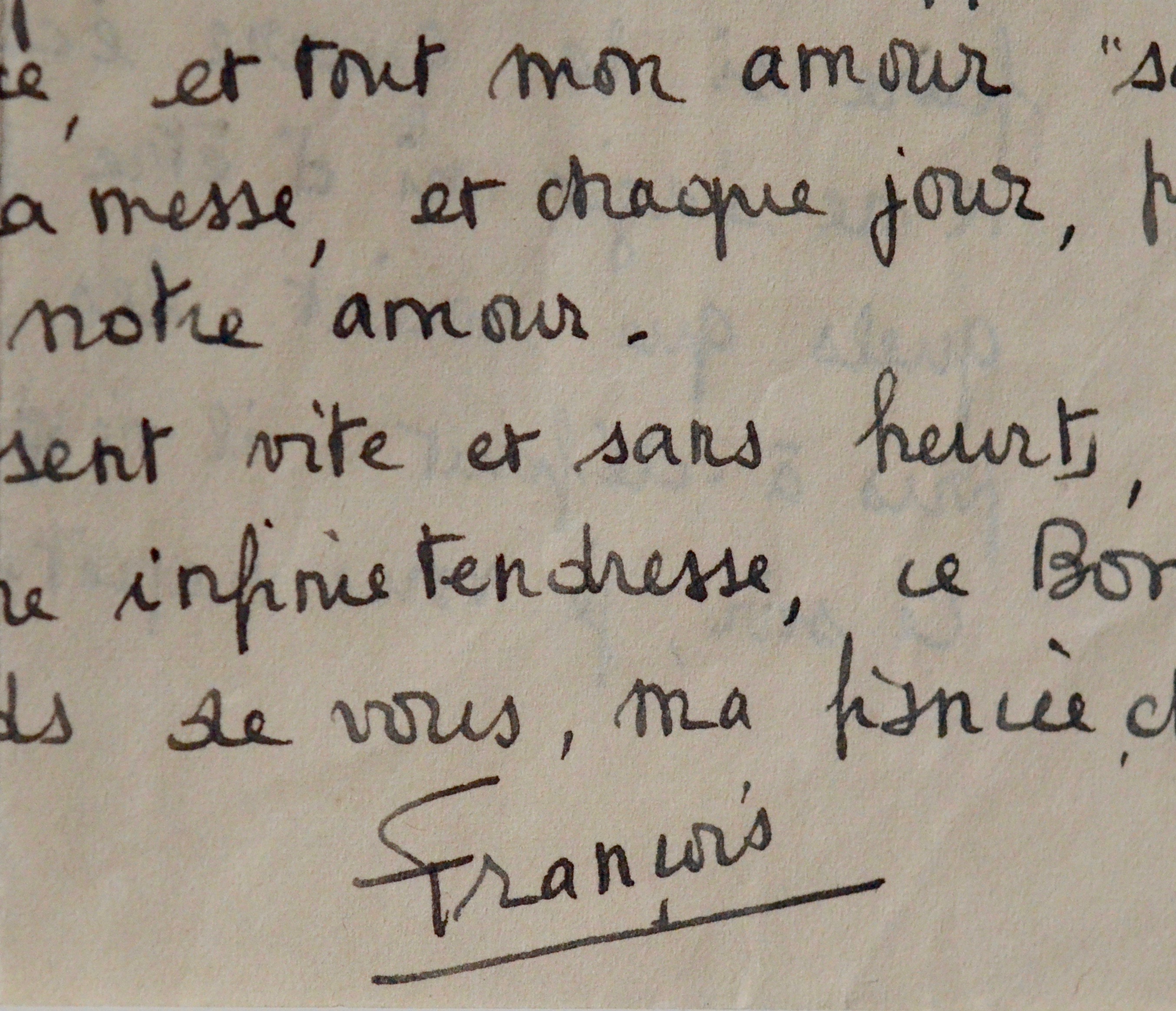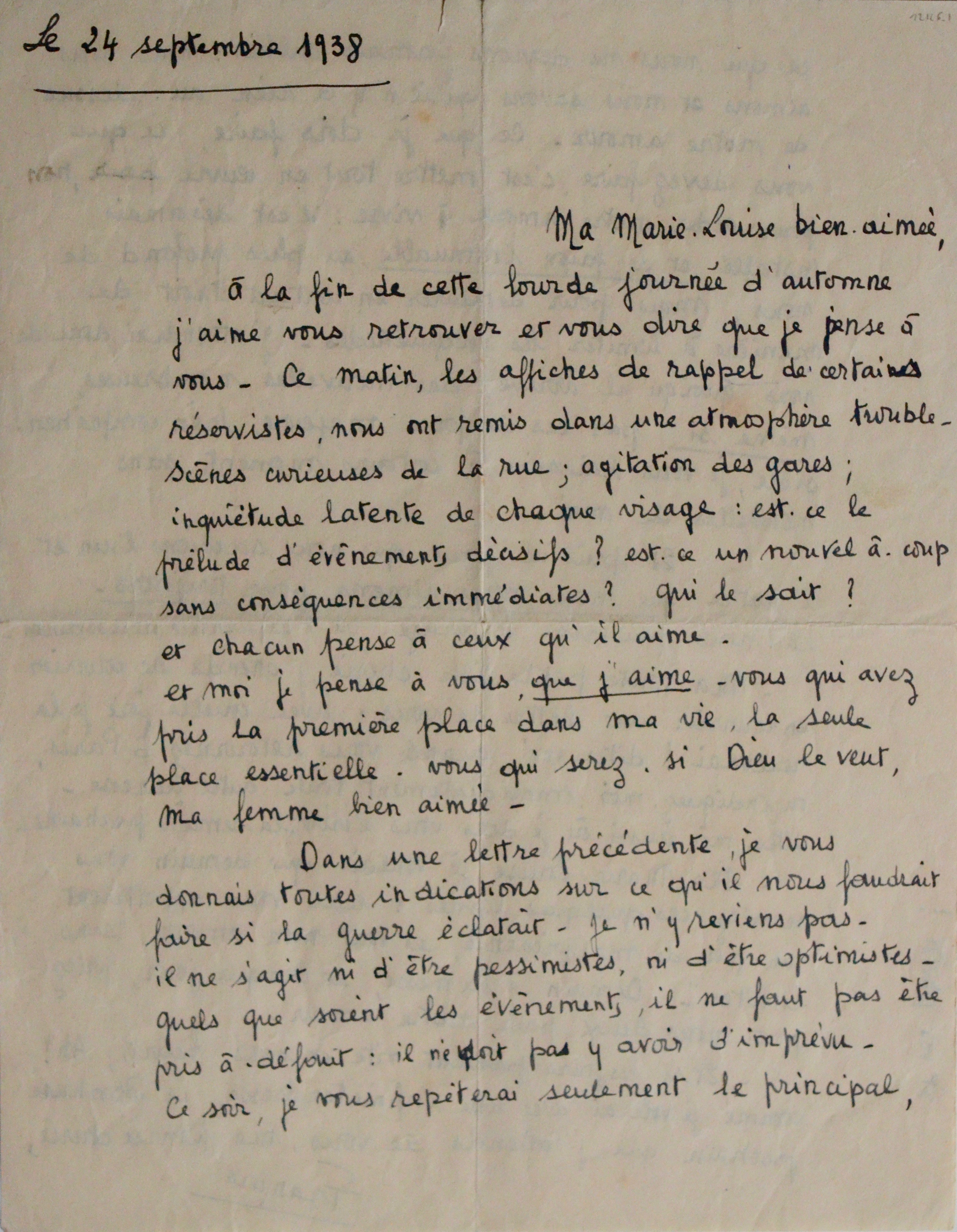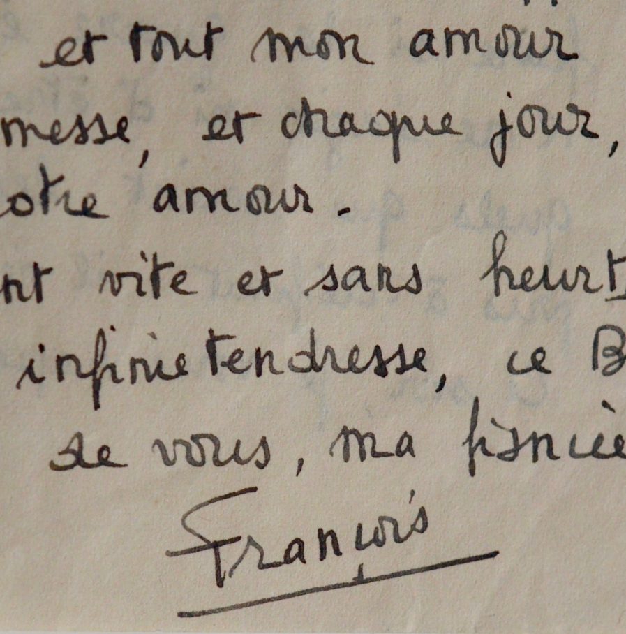 Tendre lettre d’amour de François Mitterrand adressée à sa future fiancée, Catherine Langeais : « Ma Marie-Louise bien aimée […]. Ce matin, les affiches de rappel de certains réservistes, nous ont remis dans une atmosphère trouble-scènes curieuses de la rue ; agitation des gares ; inquiétudes latentes de chaque visage : est-ce le prélude d’évènements décisifs ? Est-ce un nouvel à-coup sans conséquences immédiates ? […] et moi je pense à vous, que j’aime - vous qui avez pris la première place dans ma vie, la seule place essentielle - vous qui serez, si Dieu le veut, ma femme bien aimée ».