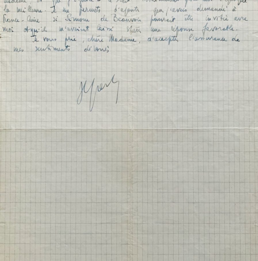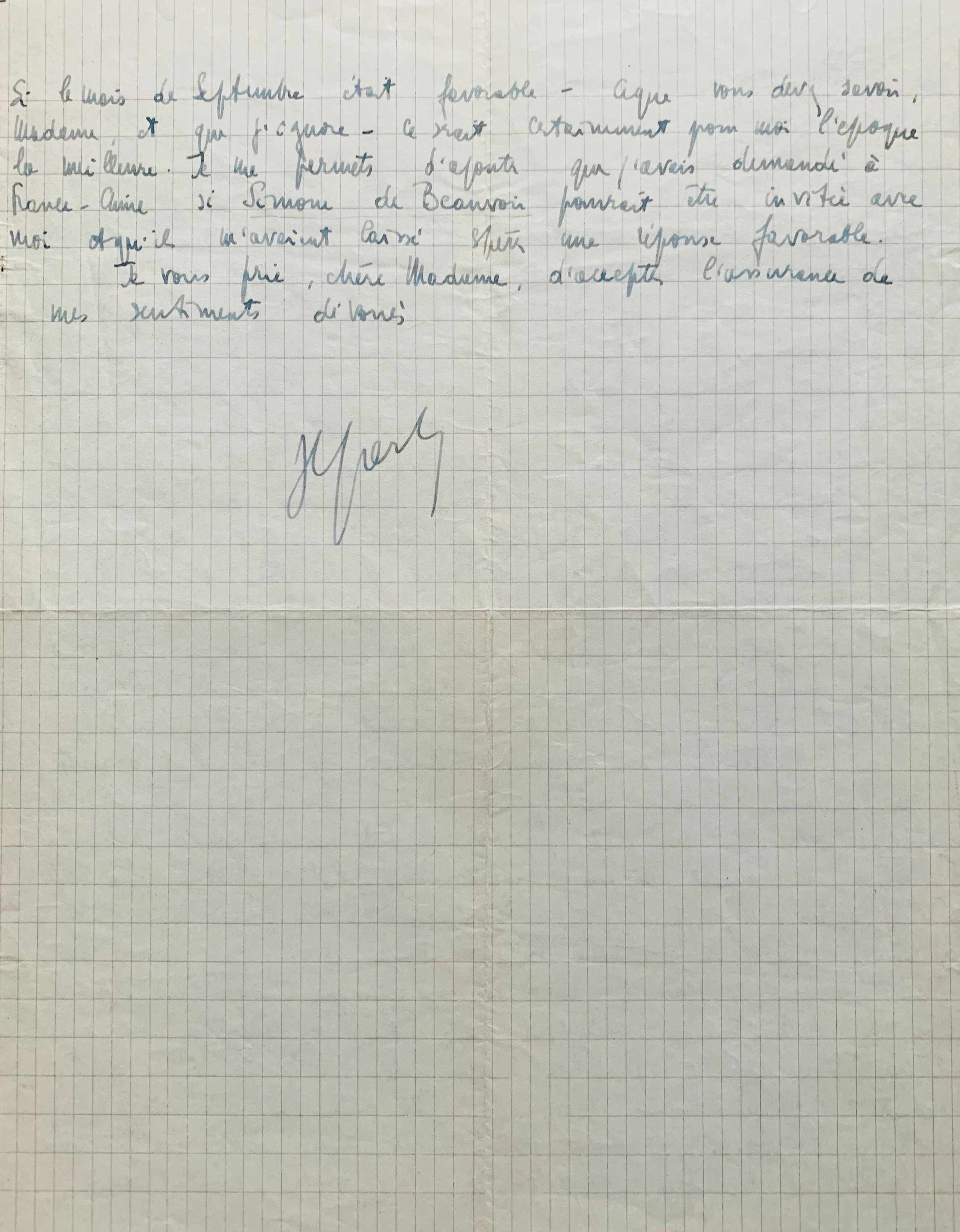 Pour ce qui est du voyage en Chine, voici les faits : l'Association France Chine dont je fais partie m'avait invité l'an dernier. J'ai dû décliner l'invitation à cause de mon état de santé et j'ai demandé aux dirigeants si je pouvais espérer qu'elle serait reportée à une date ultérieure. Ils ont bien voulu accepter. Les choses en étaient là, à ma connaissance, et c'est votre lettre (celle d'hier) qui m'a appris que le Mouvement de la Paix voulait bien, lui aussi, s'intéresser à mon voyage. Il va de soi que j'en suis fort heureux et que je remercie ceux de ses dirigeants qui ont pris cette initiative. Je m'étonne seulement que vous me reprochiez mon silence : personne ne m'avait jusqu'ici demandé de proposer une date ; comment et à qui l'aurais je donnée? Cette date, il reste difficile de la fixer. Le voyage est long, sans doute assez pénible, et j'aurais bien voulu me rétablir tout à fait avant de l'entreprendre. Si le mois de septembre était favorable - ce que vous devez savoir, madame, et que j'ignore - ce serait certainement pour moi l'époque la meilleure. Je me permets d'ajouter que j'avais demandé à France-Chine si Simone de Beauvoir pourrait être invitée avec moi et qu'ils m'avaient laissé espérer une réponse favorable [...]".