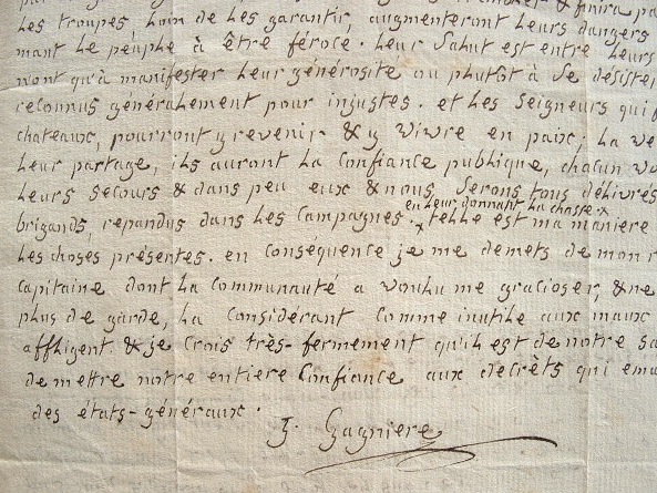 Lettre de Joachim Gagnière, médecin de Saint-Vallier, fervent rousseauiste, devenu un farouche adversaire du philosophe quand celui-ci refusa de le rencontrer. Elle s'inscrit dans les terribles événements qui ensanglantèrent la région de Saint-Vallier [Drôme] au début de la Révolution, des bandes de brigands semant la terreur, tuant et pillant les châteaux. Gagnière, en sage philosophe, propose de déposer les armes et d'inviter les nobles à renoncer à leurs privilèges ; il estime que seule cette solution permettra un retour à la paix civile. «La liberté des hommes civilisés est fondée sur les loix. Nous devons attendre en silence ces loix que faira l'assemblée nationale [...]. Regardons nous comme un peuple heureux. Livrons à la joie, puisque la félicité vient régner au milieu de chaque famille. Quittons les armes, mes chers compatriotes, qu'une terreur panique ne nous les fasse plus prendre. Mais, me direz-vous, on ravage, on démolit, on incendie les châteaux ! C'est un très grand malheur, j'en conviens et je suis le premier à en gémir. Mais faut-il des armes pour repousser ces malfaiteurs ? Moi, je vous assure que non. Voici le seul et véritable moyen pour les faire disparaître : c'est la cession des droits personnels de la part des seigneurs. Par cet abandon ils deviennent citoyens, ils font cause commune. Dès lors, tout parti cesse, la confiance renaît, l'amitié se rétablit. Mais si les seigneurs se montrent plus attachés à leurs intérêts qu'à l'honneur d'être citoyens, le même peuple qui a eu le courage de s'emparer de la Bastille et de disperser une armée commandée par un grand général, les faira toujours trembler et finira par les détruire [...]». Il estime que la troupe ne garantit pas la sécurité mais, au contraire, augmente le danger ; ainsi, sa manière d'appréhender les événements, met la noblesse devant ses responsabilités. «Leur salut est entre leurs mains. Ils n'ont qu'à manifester leur générosité ou plutôt à se désister des droits reconnus généralement pour injustes. Et les seigneurs qui fuient leurs châteaux pourront y revenir et y vivre en paix. La vertu devenant leur partage, ils auront la confiance publique, chacun volera à leurs secours et, dans peu, eux et nous, serons tous délivrés de ces brigands, répandus dans les campagnes [...]». Voulant mettre à exécution ses idées par des actes, il se démet de sa charge de capitaine de la garde. «Je crois qu'il est de notre sagesse de mettre notre entière confiance aux décrets qui émaneront des Etats-généraux».