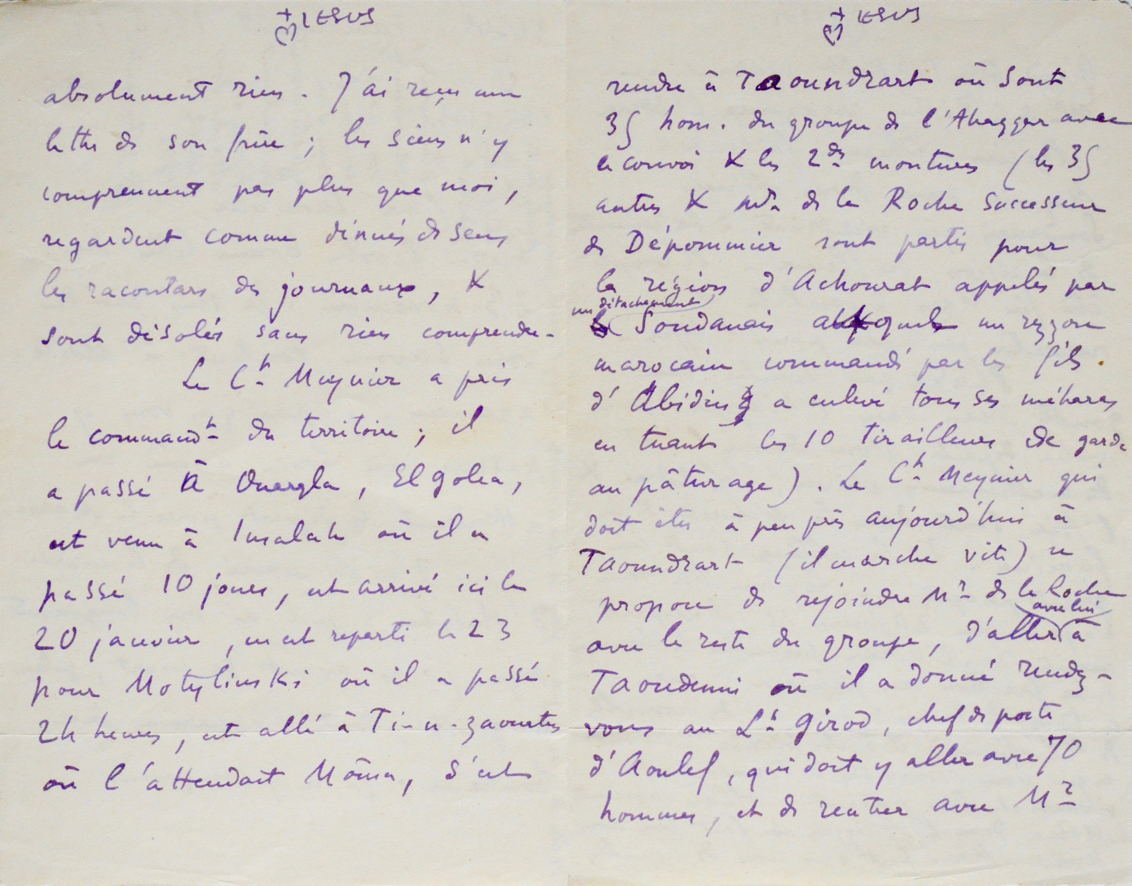 Le commandant Meynier a pris le contrôle du territoire, qu'il a parcouru. Foucault informe longuement le colonel des déplacements déjà effectués et à venir par Meynier, ainsi que ceux du capitaine de La Roche.