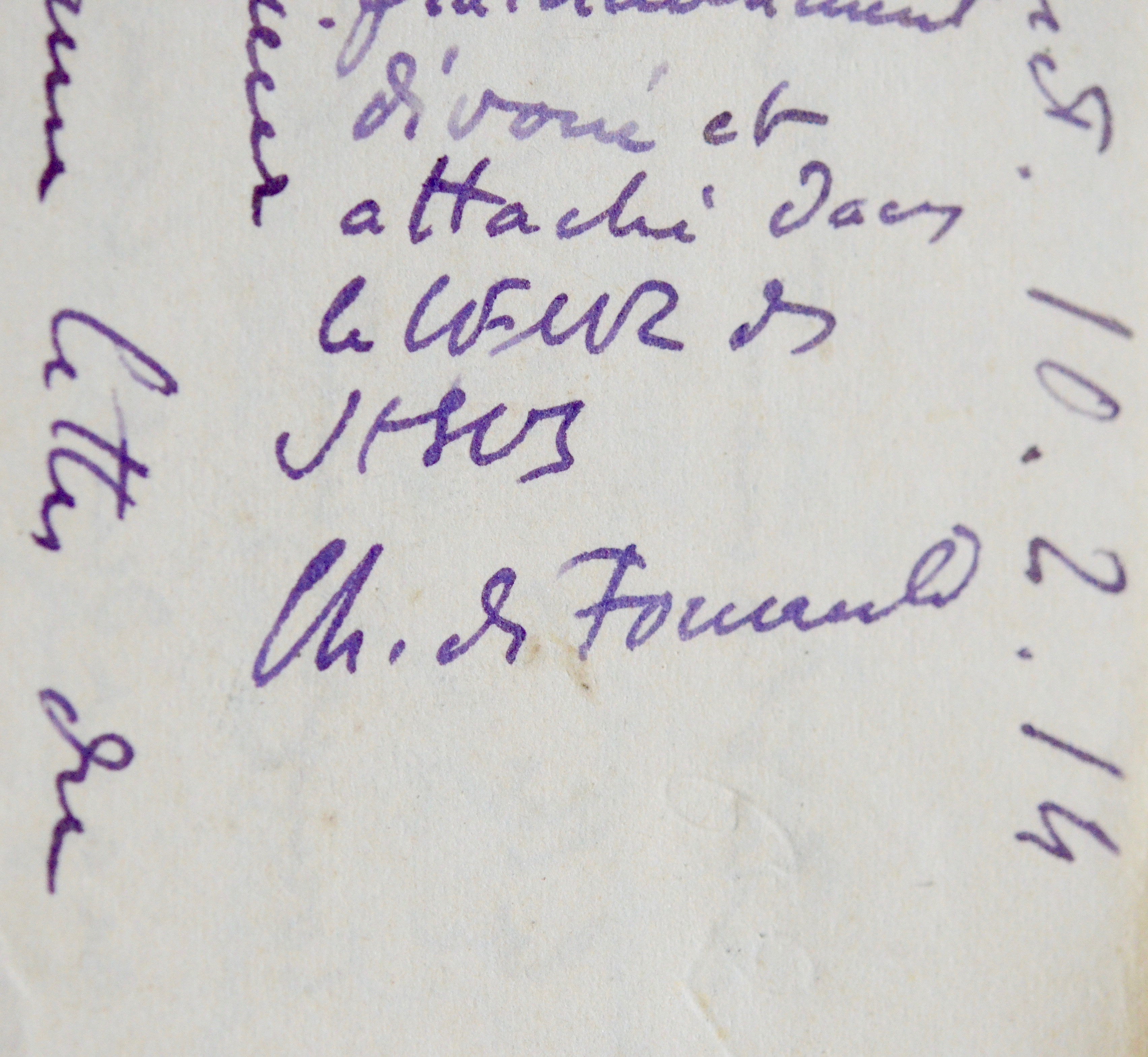 Foucauld a dessiné en-tête de chaque page le “cœur et la croix”, symbole de Jesus Caritas, sa fraternité. Foucauld utilisait ces symboles pour signer ce qui lui appartenait et ce qu’il écrivait, marquant ainsi l’amour de Jésus.