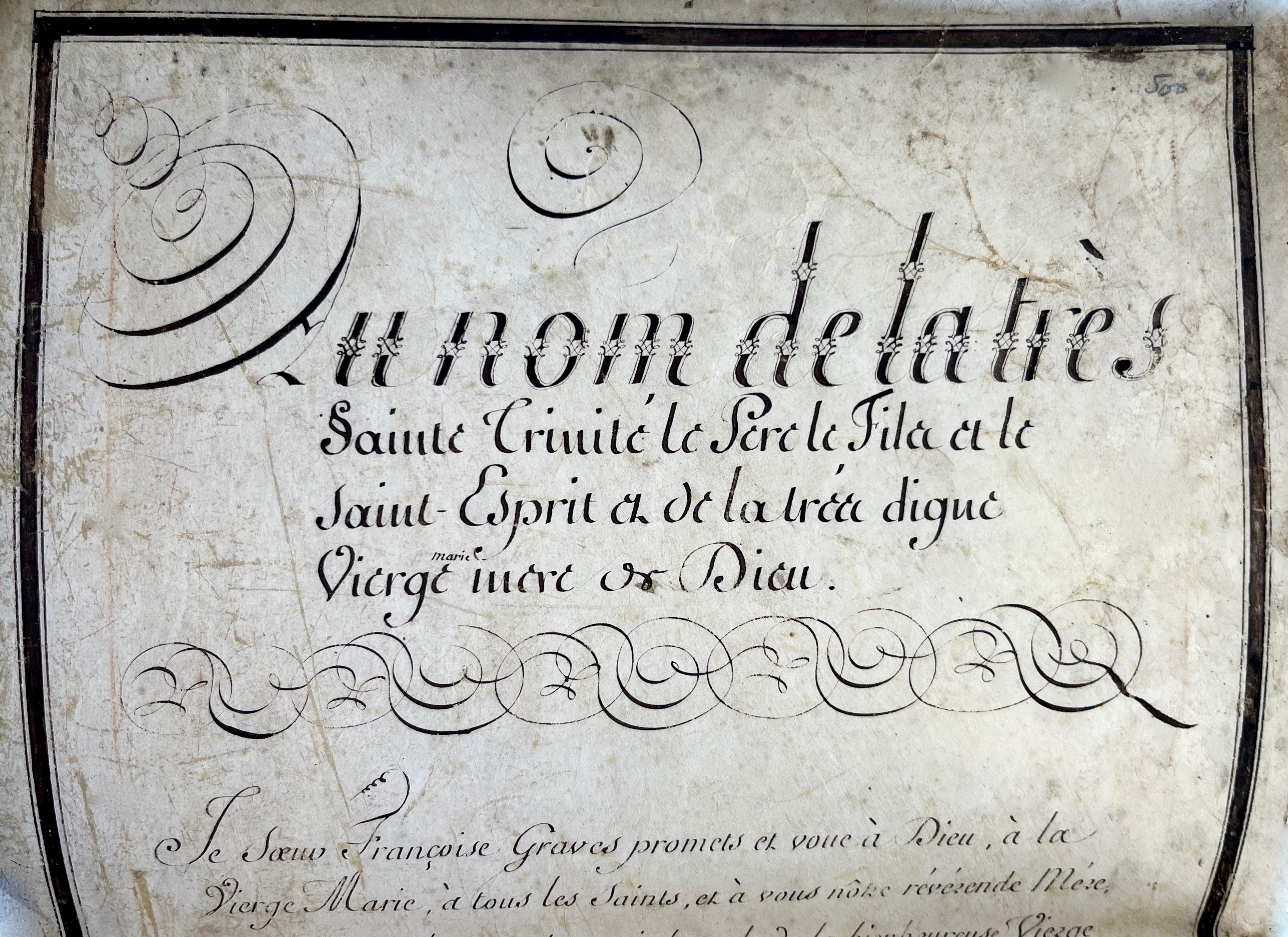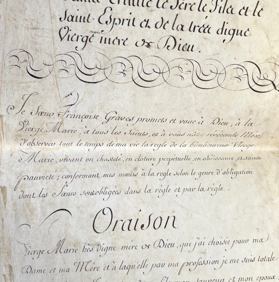 « Je sœur Françoise Graves promets et voue à Dieu, à la Vierge Marie, à tous les saints et à vous notre révérende Mère, d’observer tout le temps de ma vie la règle de la bienheureuse Vierge Marie, vivant en chasteté, en clôture perpétuelle, en obéissance et sainte pauvreté ; conformant mes mœurs à la règle selon le genre d’obligation dont les sœurs sont obligées dans la règle et par la règle […] ». Suit une oraison.