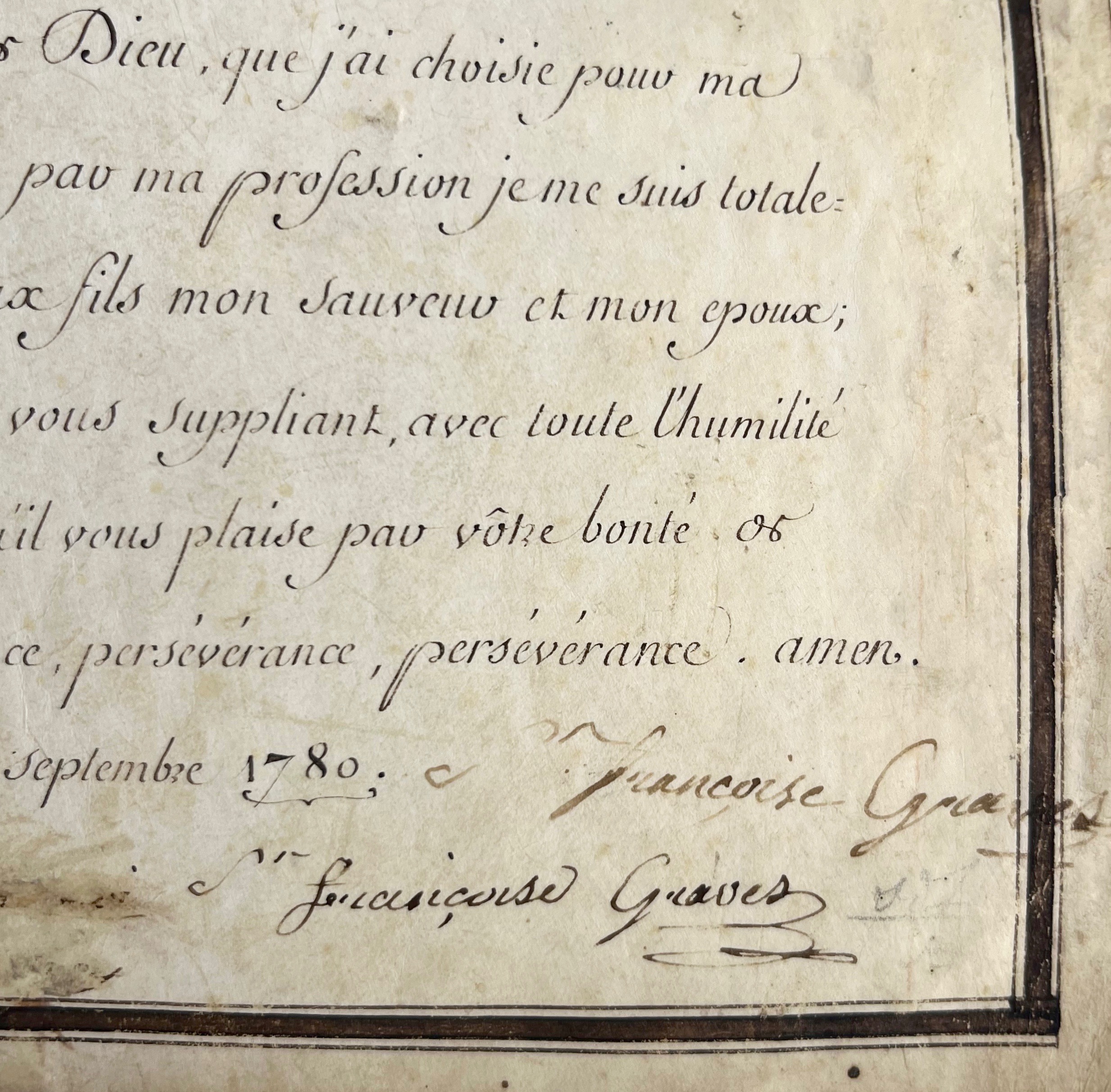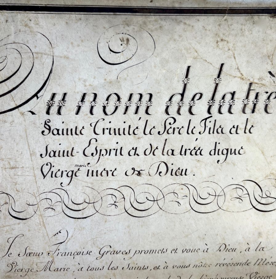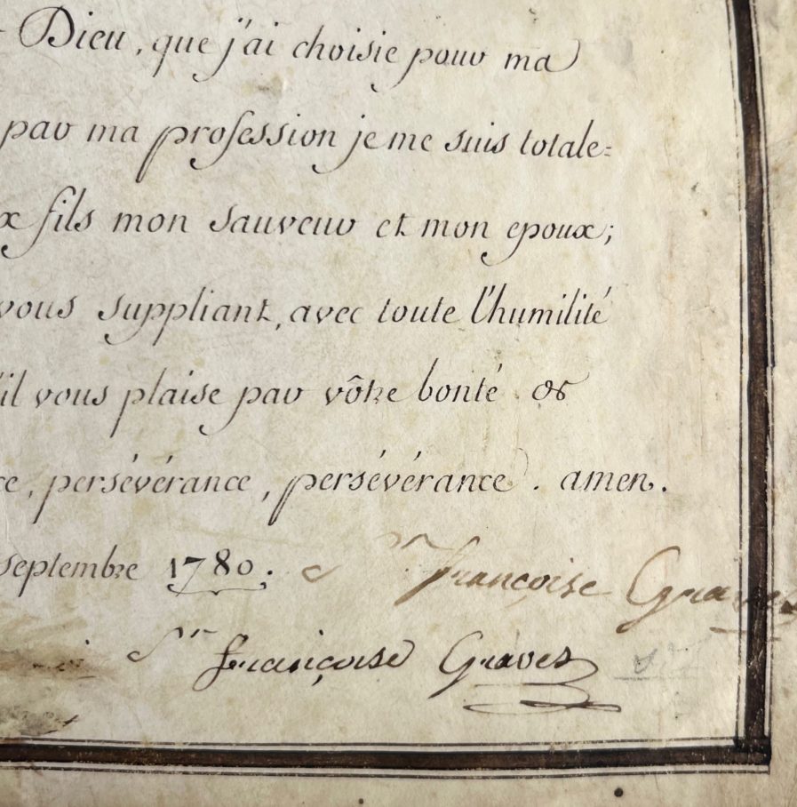 Très belle profession de foi calligraphiée de soeur Françoise Graves pour son entrée dans un cloître bordelais