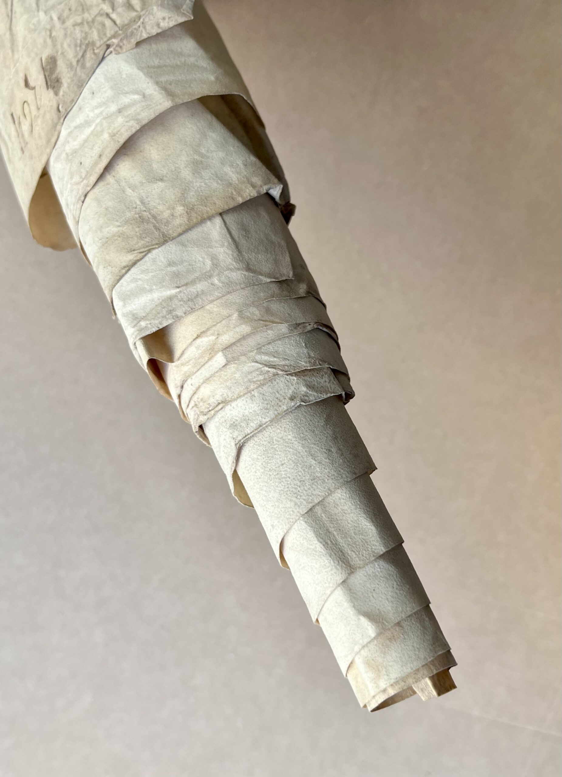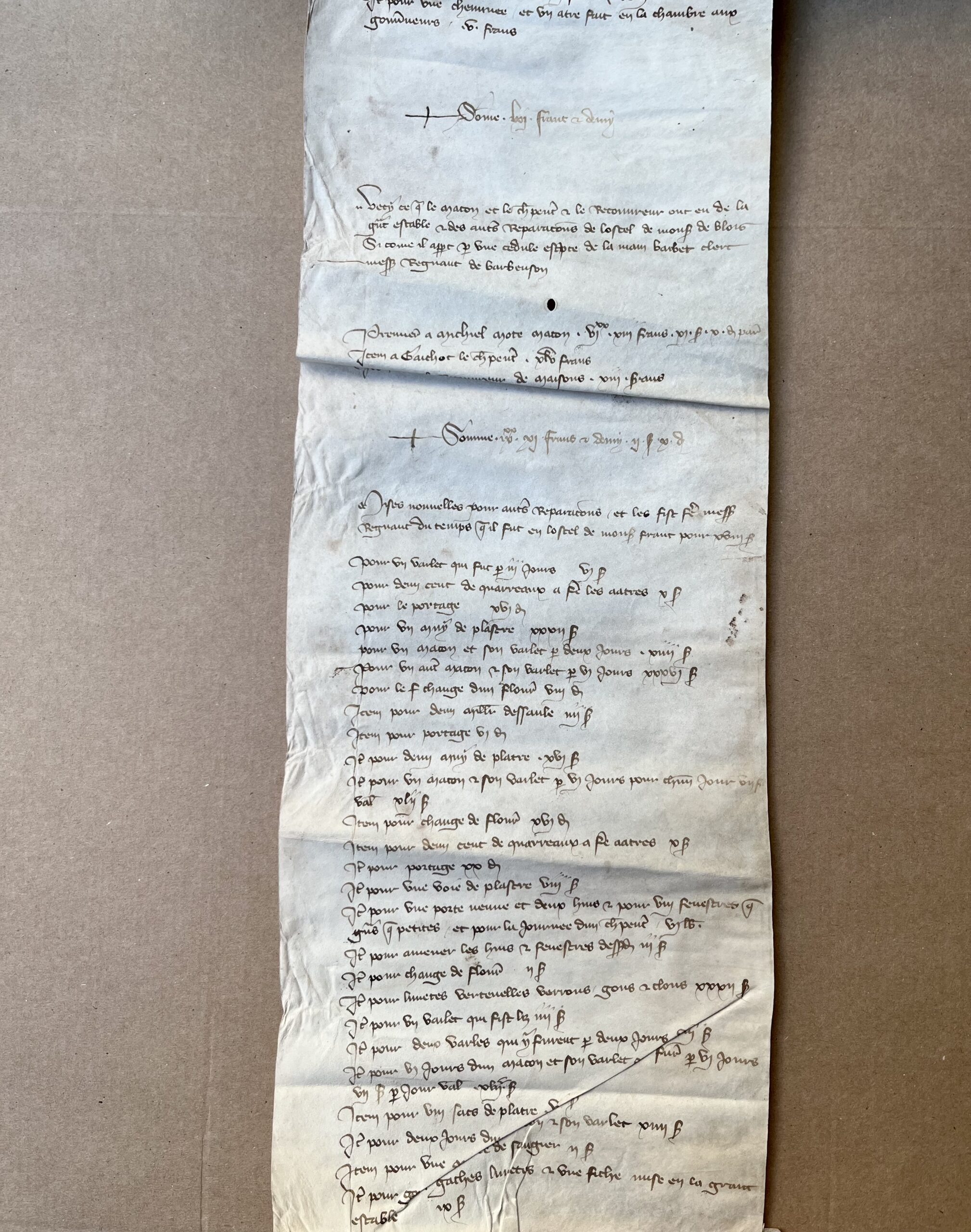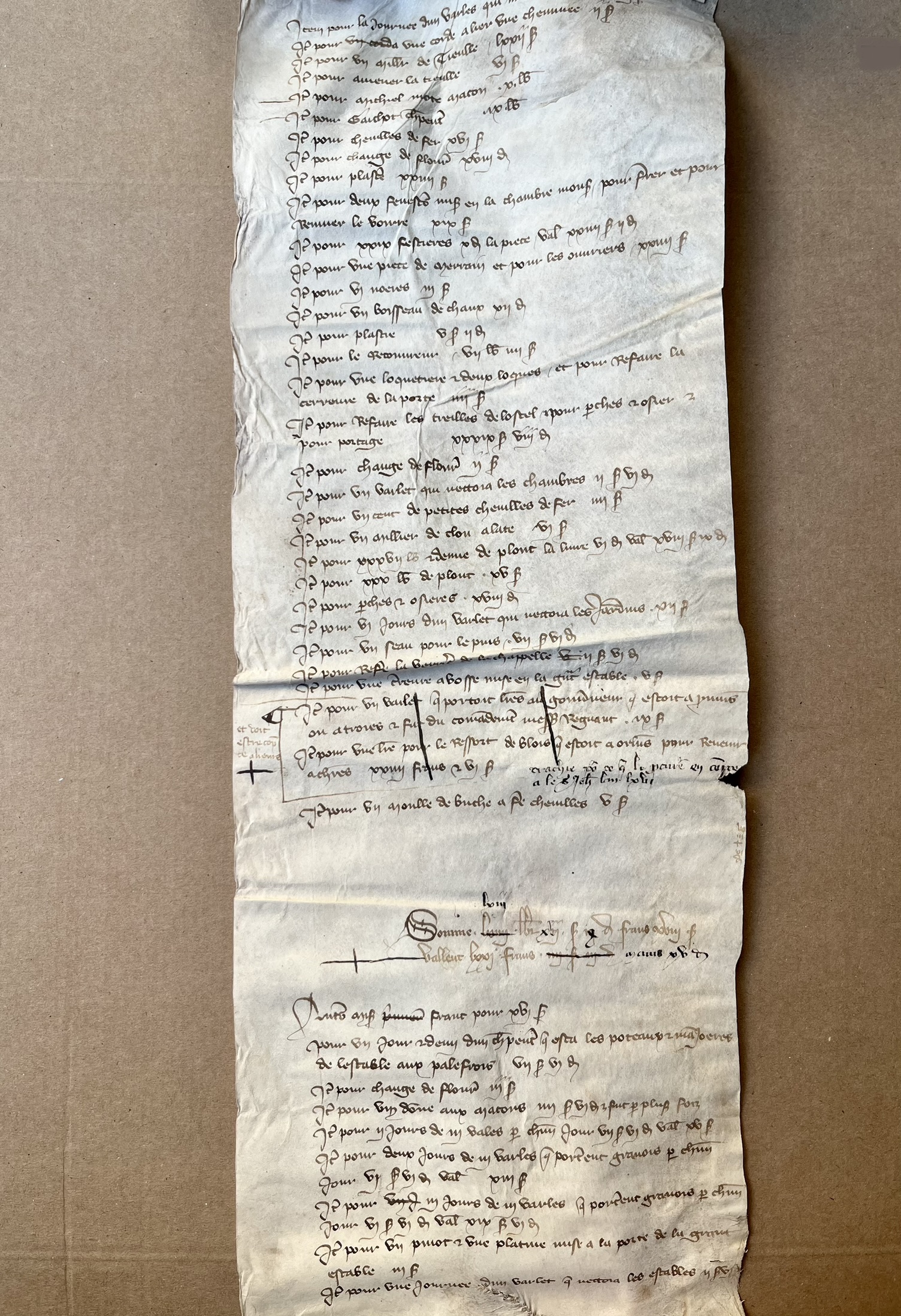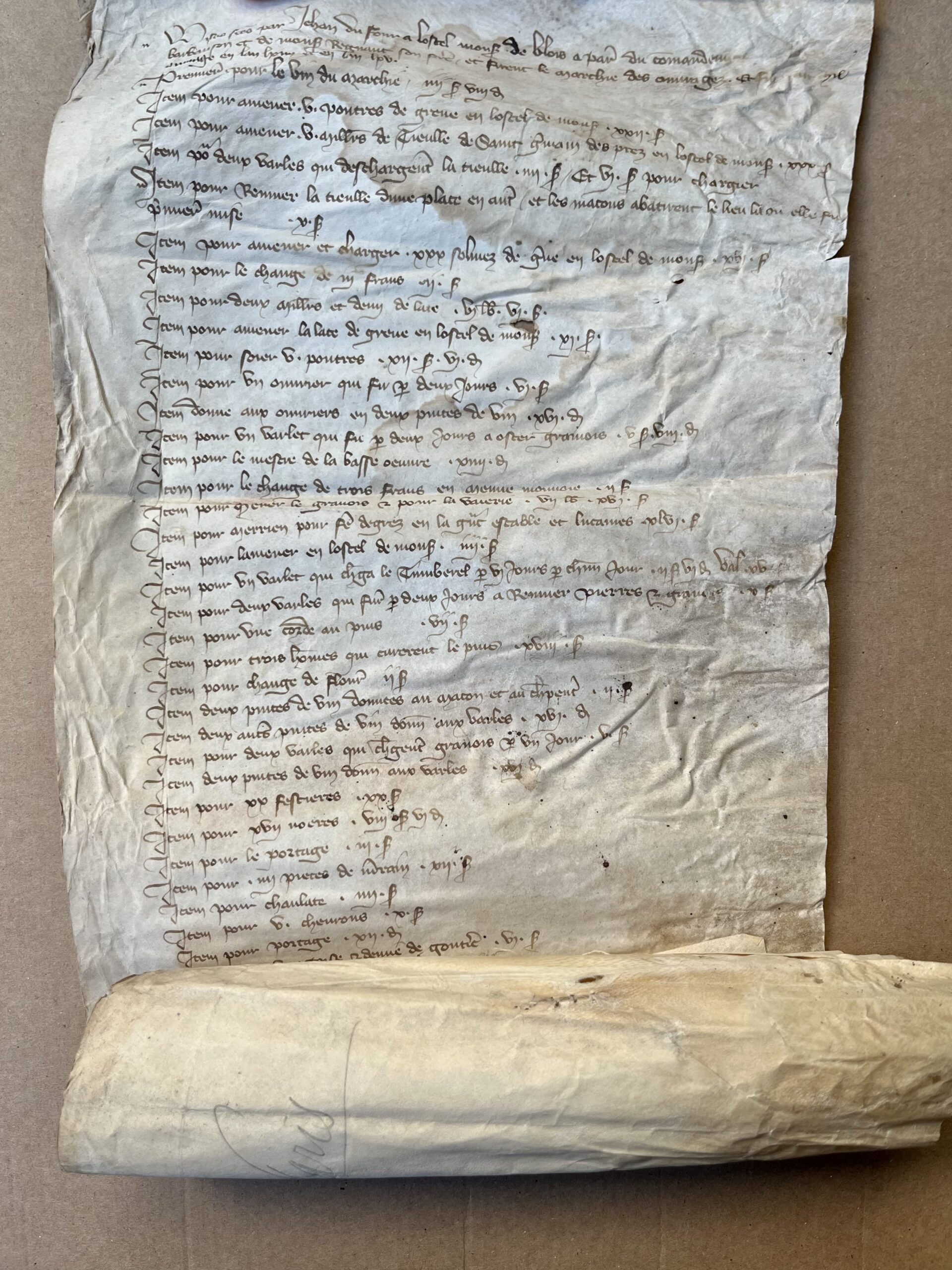 Mises (détail des dépenses) des réparations de l’hôtel du comte de Blois à Paris, de 1364 à 1366. Rôle manuscrit, en français, sur parchemin, encre brun clair (quelques corrections d’une autre encre). Rouleau de 213 cm de long, composé de 4 feuilles de parchemin cousues (la première feuille mesure 23,5 cm de largeur et les suivantes env. 19 cm). Document conservé dans un feuillet imprimé à en-tête de la collection Joursanvault.