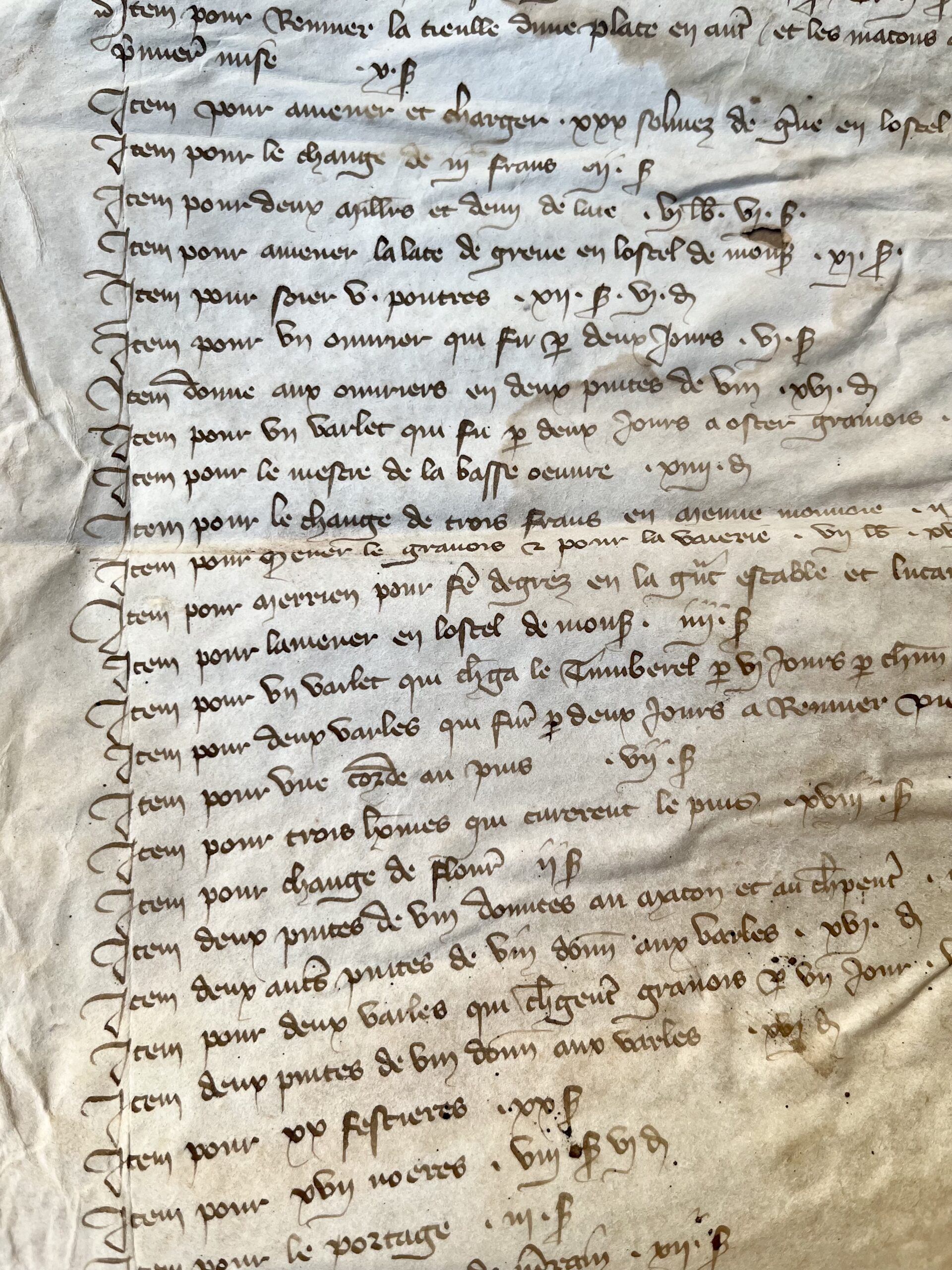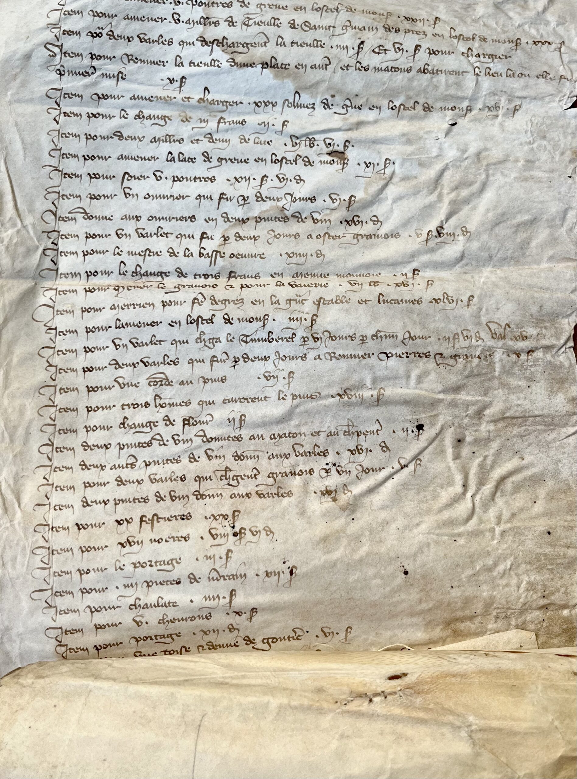 « [...] Item pour amener V poutres de graves en lostel de Mons. XXII s[ols] / Item pour V mylles (= milliers) de tieulle (= tuile) de Saint G[er]main des Prez [...] / Item pour deux varles [un varle ou varlet est un ouvrier] qui deschargent la tieulle [...] » / « pour le change de plomb » « pour deux fenestres en la chambre [...] ».