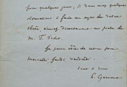 Henri Gomont (Paris, 1815/1890)Longue et très belle correspondance de l'historien Henri Gomont, sur une quinzaine d'années, depuis la publication de ses premiers travaux historiques sur l'histoire intérieure de Rome, correspondance pleine de réflexions historiques et philosophiques, qui est aussi une passionnante chronique du temps. « [...] Pour le moment je fais ce par quoi j'ai débuté, j'écris pour le public. Oui, j'ai repris ma plume, mais cela ne me coûte pas un sol, et je suis lu, amélioration sensible, autrefois je déboursais de l'argent et je n'avais pas de lecteur. Quant à mon public, il se compose des sommités de l'ordre social, le Roi d'abord et avant tout, ensuite messieurs les ministres et leurs familles, puis MM. les préfets, sous-préfets, maires et adjoints. C'est assez vous dire que j'écris dans le Moniteur [...]. Mes ennemis! Chenilles orgueilleuses venant avec envie me barrer le sentier, que j'abats sans sentir leurs morsures haineuses à travers le cuir de mon puissant soulier ; puis quand je me retourne au bout de ma carrière, je m'étonne en voyant ces cadavres vaincus que mon pied écrasa sans haine et sans colère, et je suis si chrétien que je pleure dessus [...] ».