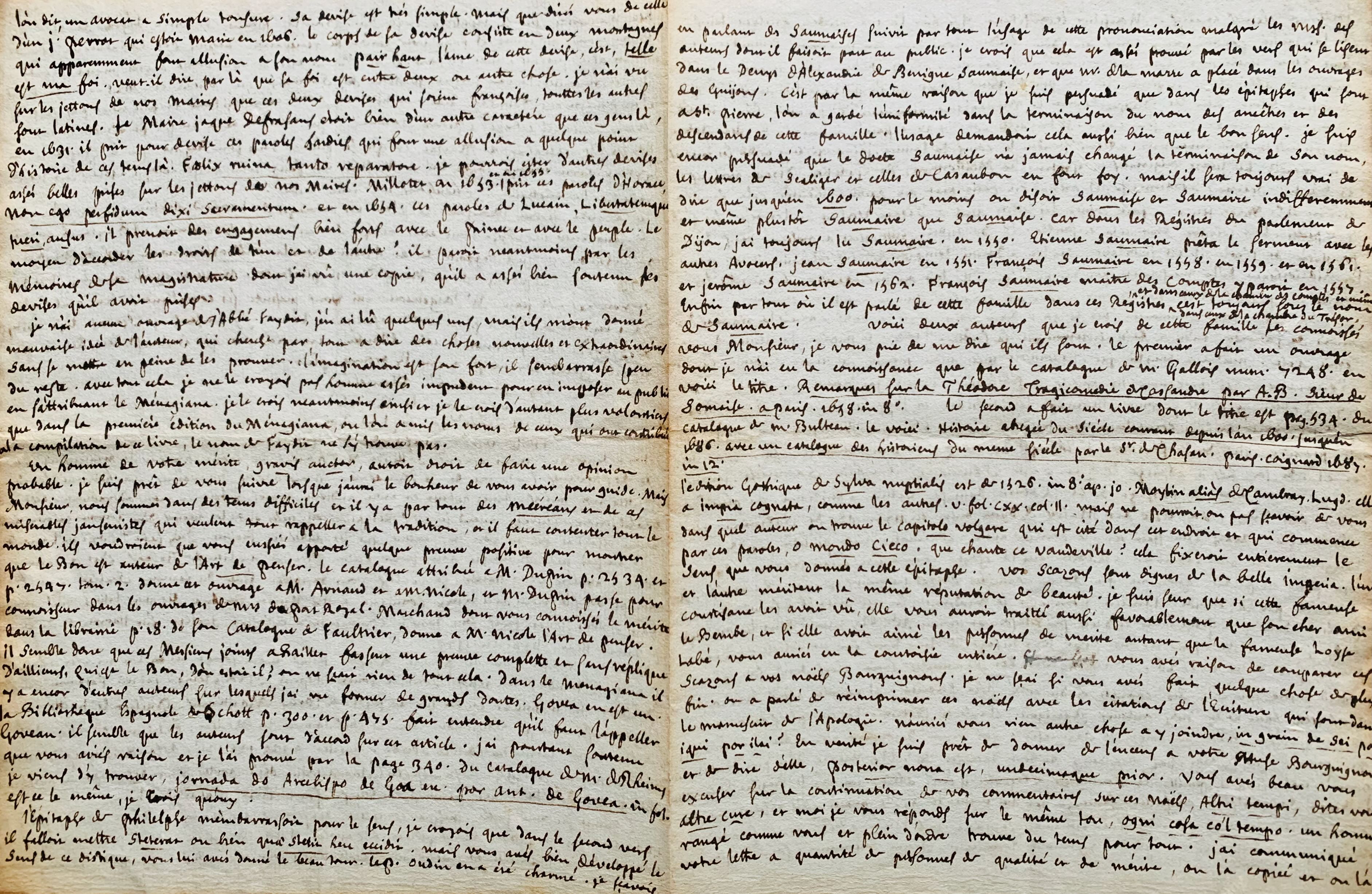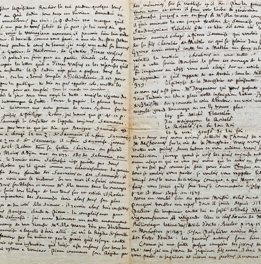 "Il y a bien des choses à dire sur le nom et la famille des Saumaise. J'ai pris garde que Bénigne écrivoit son nom de cette manière Saumaize. C'est ainsi qu'il est imprimé dans Denys d'Alexandrie, et la conversion de la lettre r ou plutôt z (comme tout le monde l'écrivoit en ce tems là et comme quelques uns l'écrivent encor), cette conversion, dis-je, de la lettre r en z ou en s, est la plus facile de touttes [...]". Il termine ainsi sa lettre : "Est-il vrai, Monsieur, que Mr Huet avoit envoyé à M. de La Marre des mémoires sur la vie de Saumaise. Le p. Oudin le croit et voudroit les avoir".