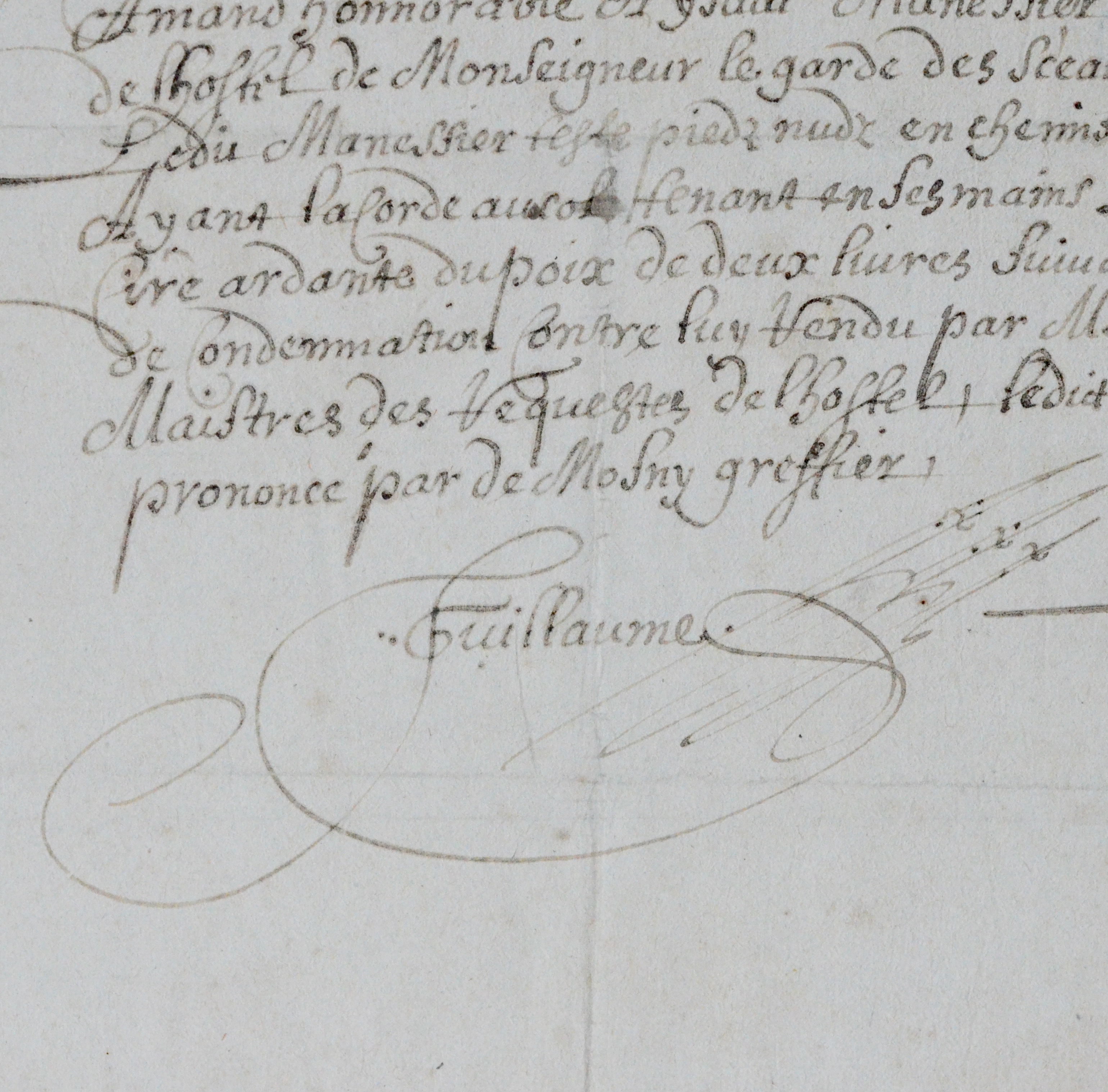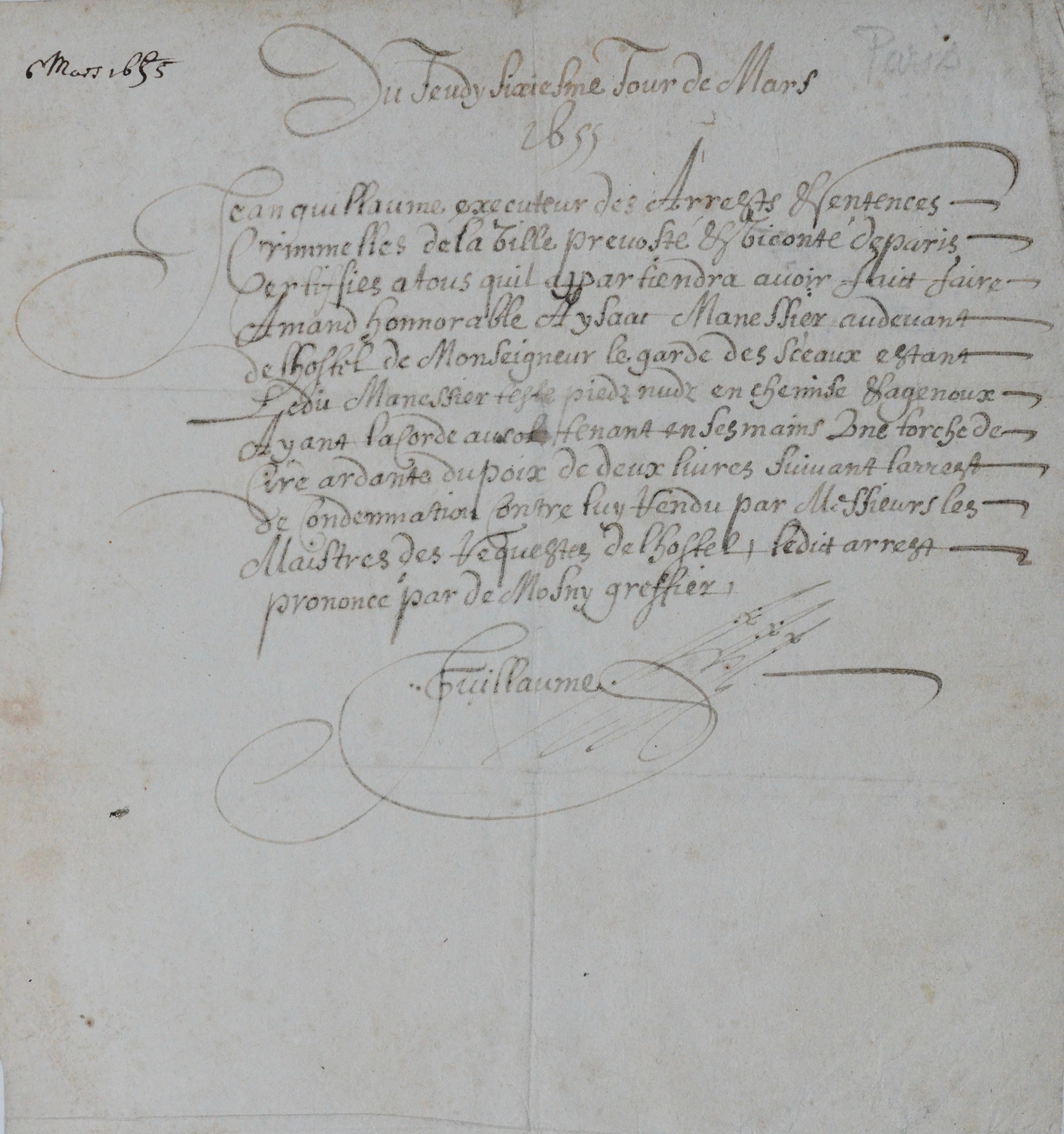« Jean Guillaume exécuteur des Arrests & Sentances criminelles de la ville Prévost et vicomté de Paris certifie à tous qu'il appartiendra avoir faict faire amand honnorable à Isaac Manessier au devant de lhostel de Monseigneur le garde des sceaux estant ledit Manessier resté piedz nudz en chemise & à genoux ayant la corde au col tenant en ses mains une torche de cire ardante du poix de deux livres suivant l’arrest de condamnation contre luy rendu par Messieurs les Maistres des requestes de l’hostel, ledit arrest prononcé par de Mosny greffier. JGuillaume".