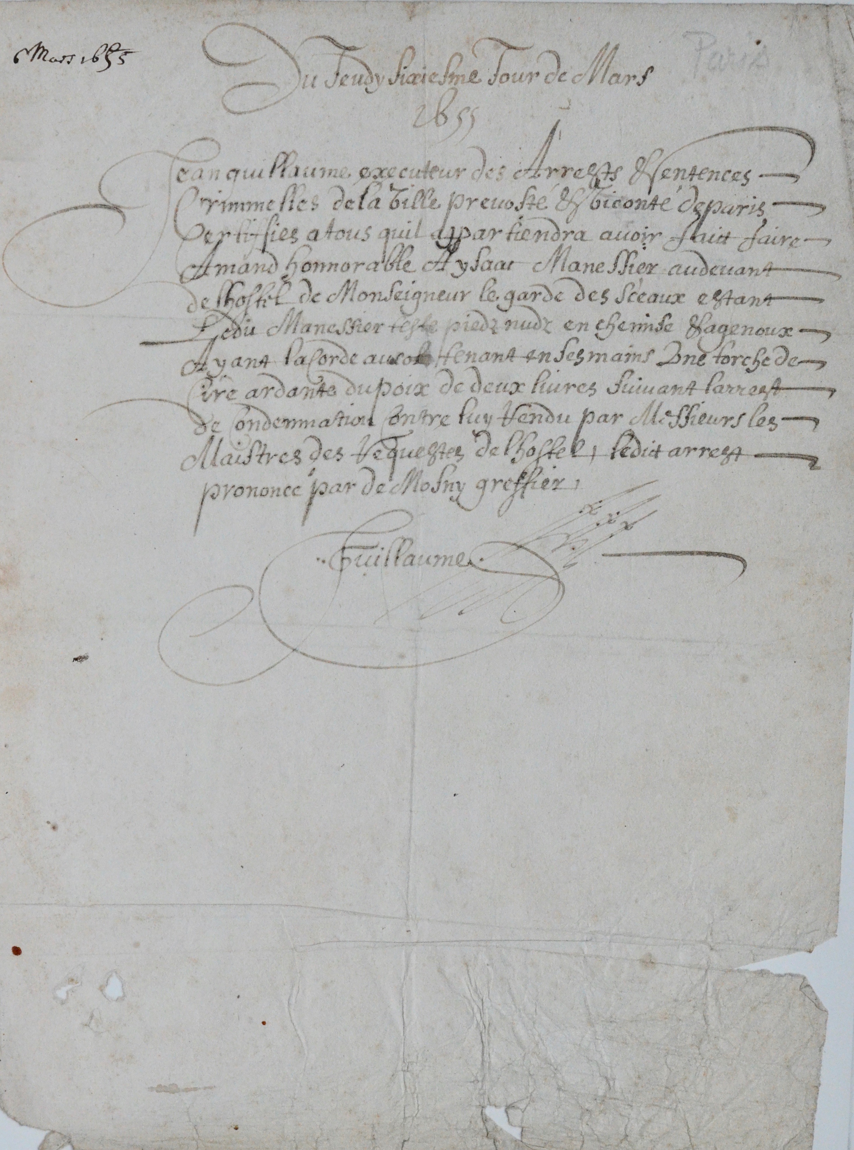 Pièce rédigée et signée par le bourreau de Paris, Jean Guillaume, datée du jeudi 6 mars 1655, certifiant de l'exécution de la peine infligée à un certain Manessier.