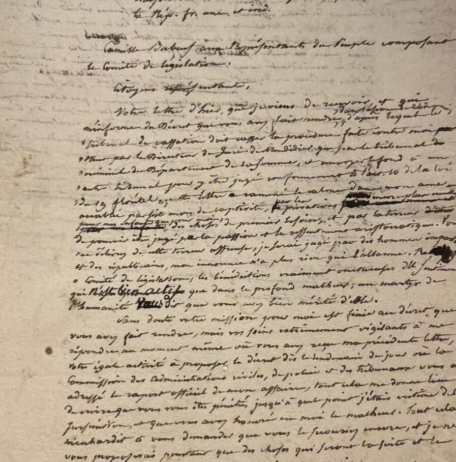Brouillon de lettre de Babeuf, écrite durant la grande Terreur. Il a inscrit son nom en tête "Affaire de Babeuf. Merlin de Douay, rapporteur". Nombreuses ratures, ajouts et corrections.