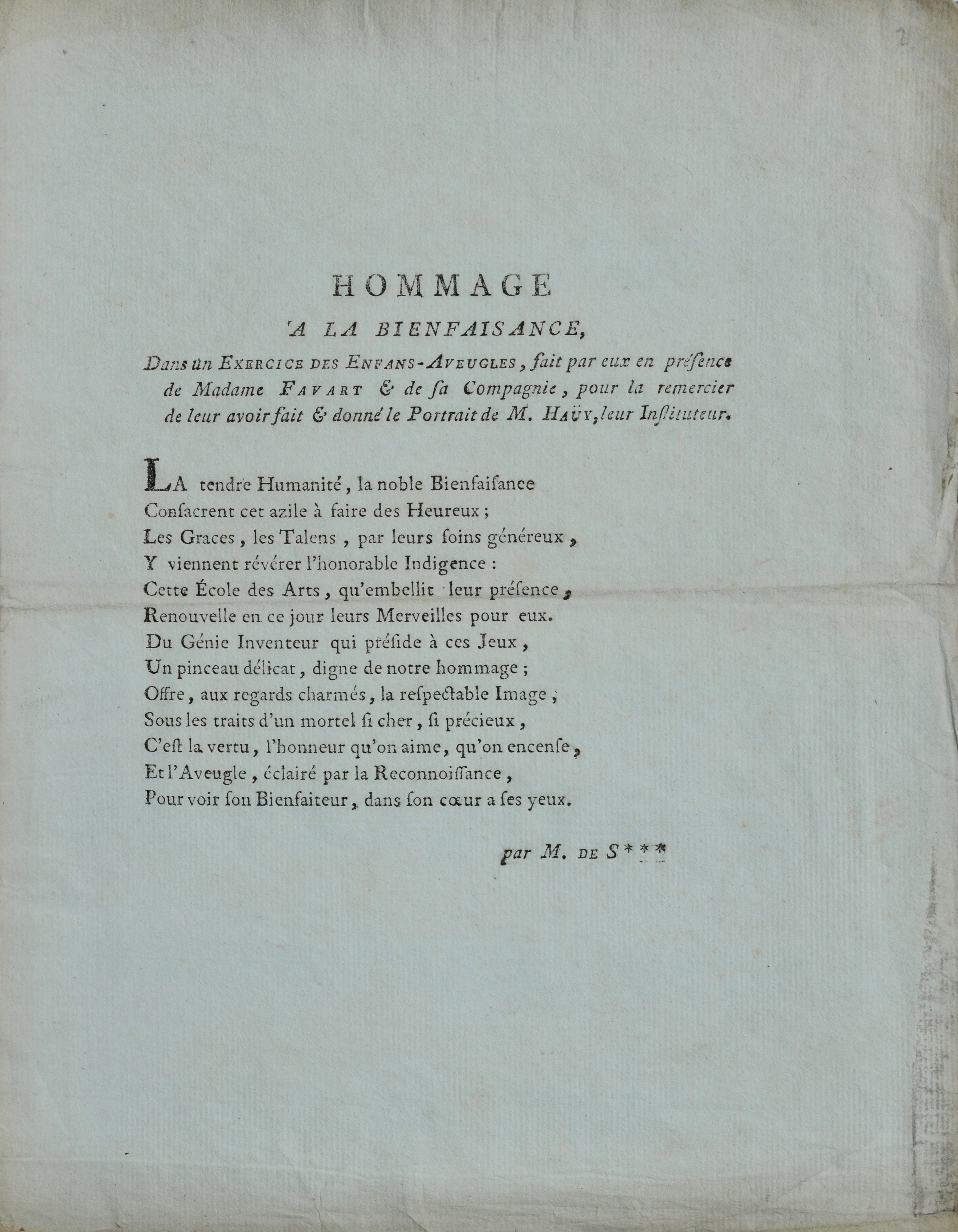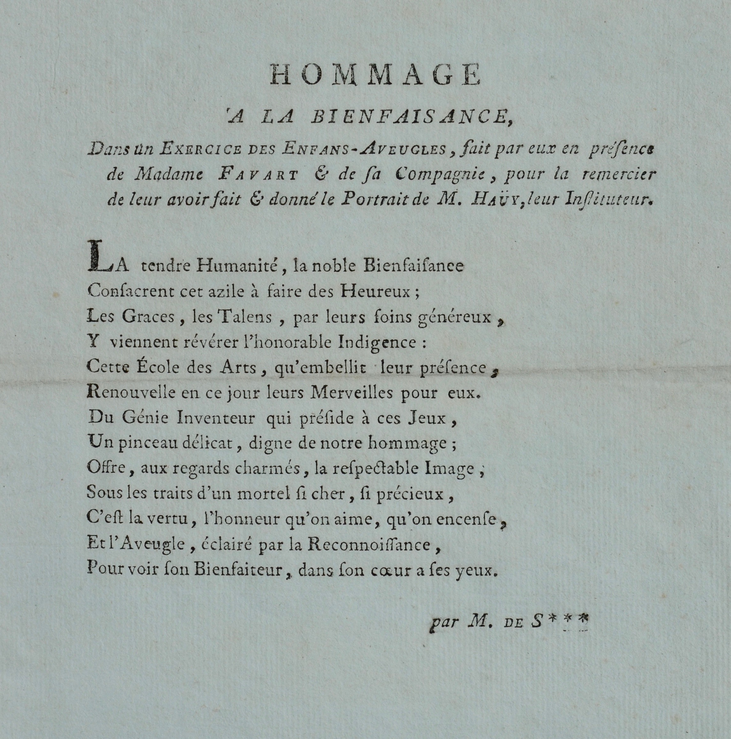 Rarissime imprimé intitulé : "Hommage à la bienfaisance, dans un exercice des Enfants-Aveugles, fait par eux en présence de Madame Favart & de sa compagnie, pour la remercier de leur avoir fait & donné le portrait de M. Haüy, leur instituteur". Suivi de 13 vers signés "M. de S***" : "La tendre Humanité, la noble Bienfaisance / Consacrent cet asile à faire des Heureux; / Les Traces, les Talons, par leurs soins généreux, / Y viennent révérer l'honorable Indigence / [...] / Et l'aveugle, éclairé par le Reconnoissance, / Pour voir son Bienfaiteur, dans son coeur a ses yeux"