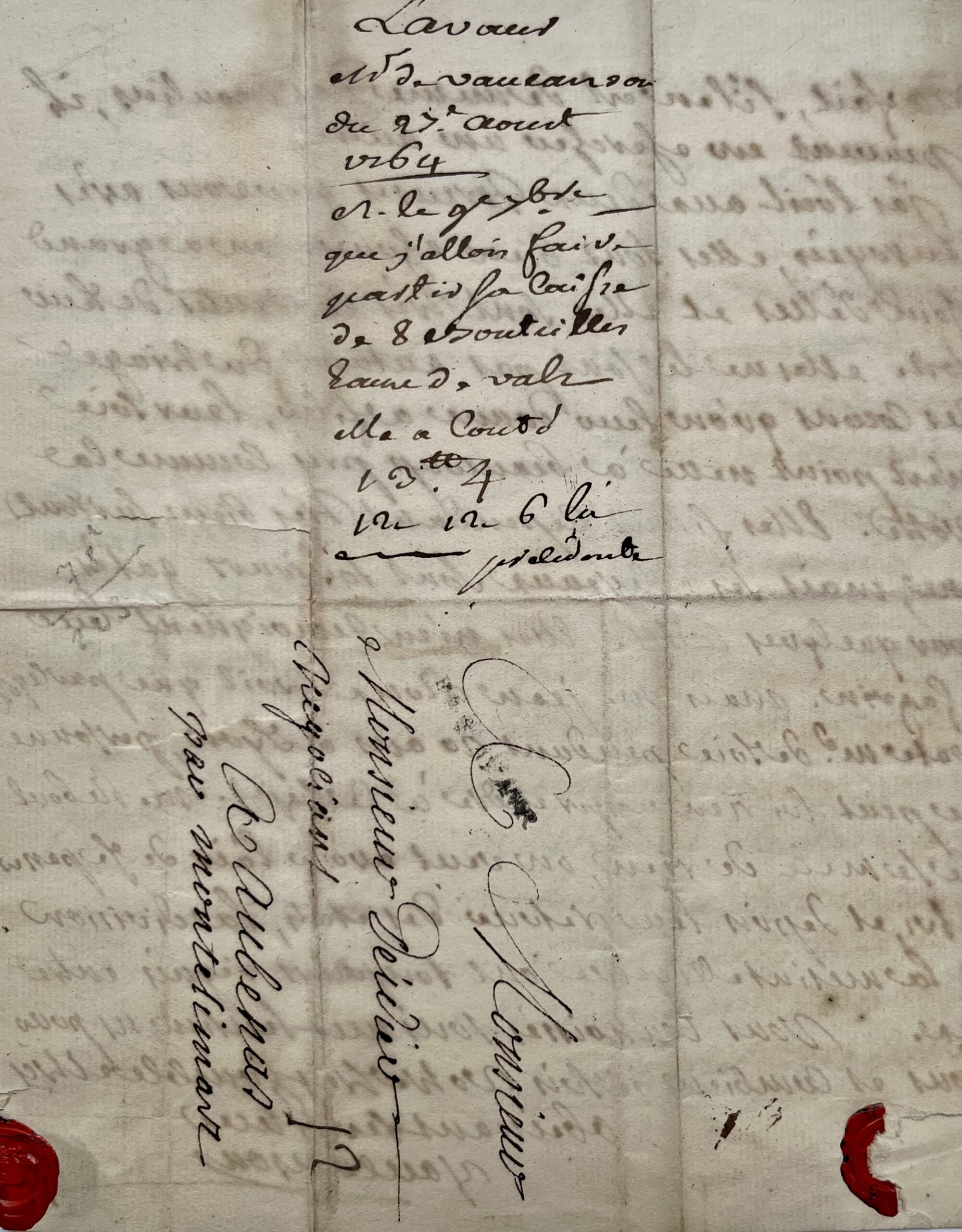 Il a reçu les eaux de Vals qu'il lui avait fait envoyer, mais seulement 8 bouteilles au lieu des 12 attendues. L'évêque lui demande urgemment une autre caisse de 8 bouteilles "pour qu'on puisse prendre les eaux dans le courant de 7bre". Il lui adressera alors le règlement pour les deux commissions.