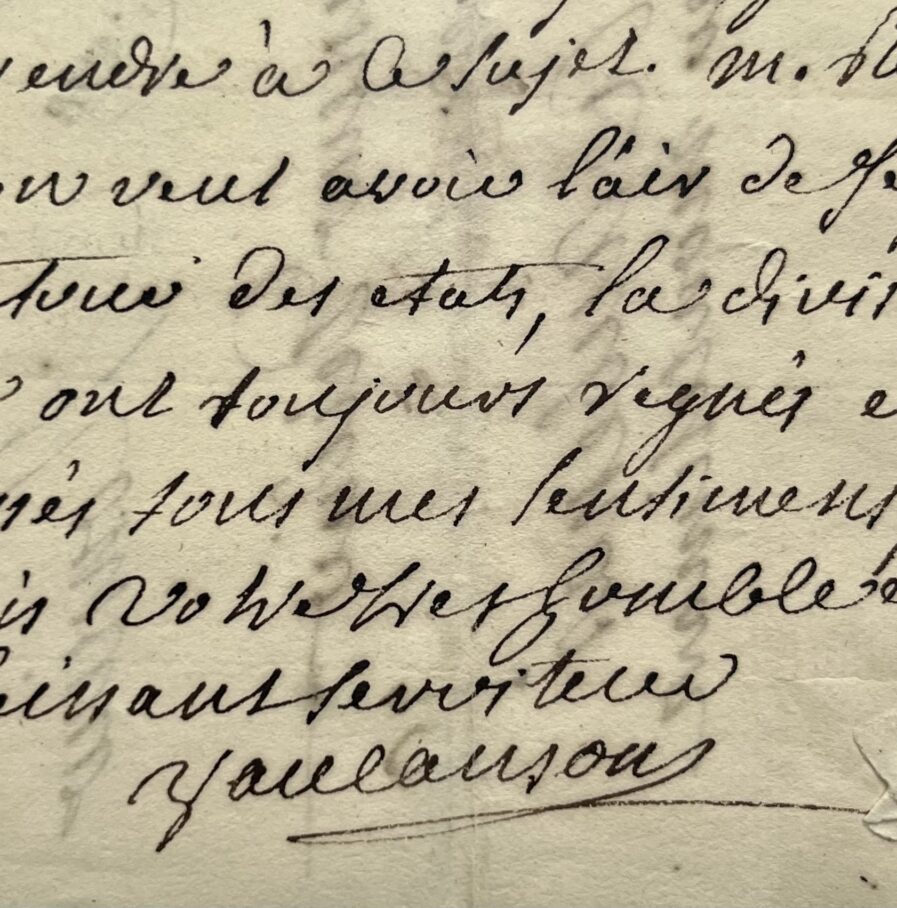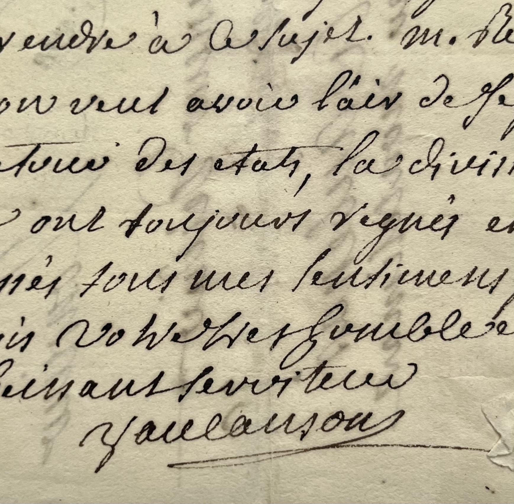 Très rare lettre de l’inventeur Jacques Vaucanson sur les manufactures de soie d’Aubenas et de Lavaur