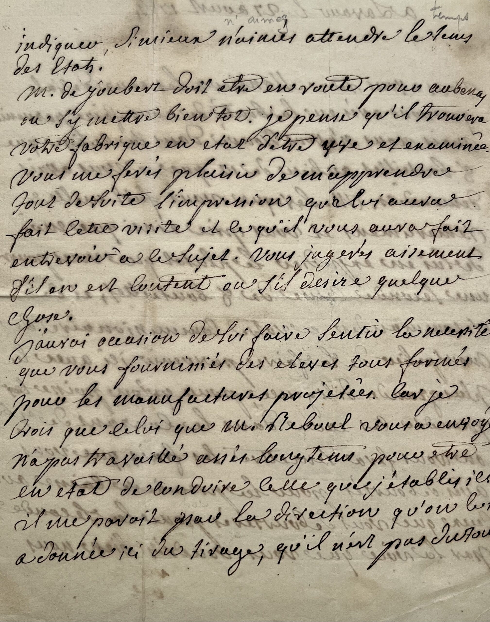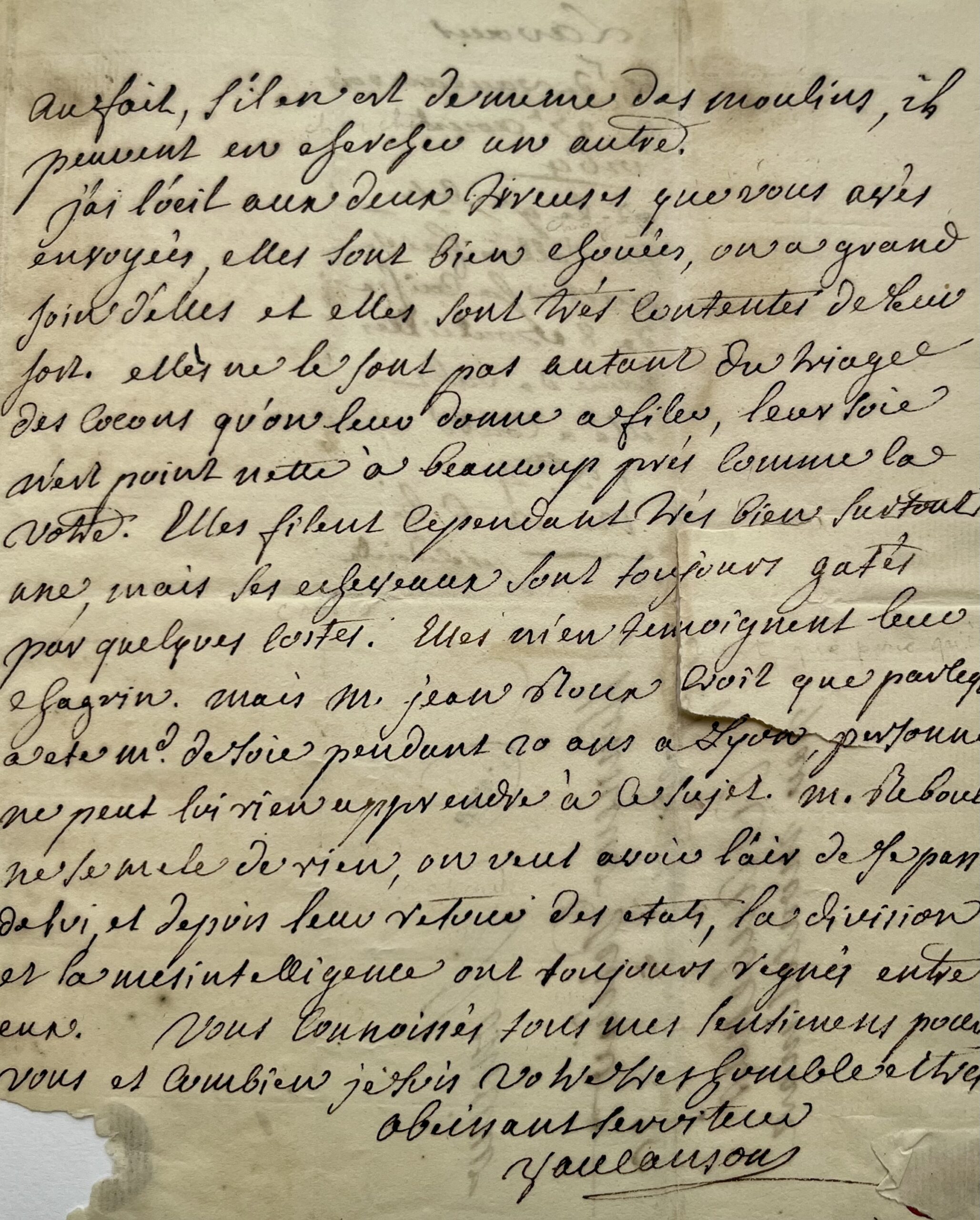"M. de Joubert doit être en route pour Aubenas ou s'y mettre bientôt. Je pense qu'il trouvera votre fabrique en état d'être vue et examinée. Vous me ferés plaisir de m'apprendre tout de suite l'impression que lui aura fait cette visite et ce qu'il vous aura fait entrevoir à ce sujet. Vous jugerés aisément s'il en est content ou s'il désire quelque chose. J'aurai occasion de lui faire sentir la nécessité que vous fournissiez des élèves, tous formés pour les manufactures projetées. Car je crois que celui que M. Reboul vous a envoyé n'a pas travaillé assés longtems pour être en état de conduire celle que j'établis ici... J'ai l'œil aux deux tireuses que vous avés envoyées, elles sont bien choiées, on a grand soin d'elles et elles sont très contentes de leur sort. Elles ne le sont pas autant du triage des cocons qu'on leur donne à filer, leur soie n'est point nette à beaucoup près comme la vôtre. Elles filent cependant très bien. Surtout une, mais ses écheveaux sont toujours gâtés par quelques costés. Elles m'en témoignent leur chagrin. Mais M. Jean Roux croit que parce qu'on a été m[archan]d de soie pendant 20 ans à Lyon, personne ne peut lui rien apprendre à ce sujet. M. Reboul ne se mêle de rien, on veut avoir l'air de se passer de lui, et... la division et la mésintelligence ont toujours régné entre eux [...]".