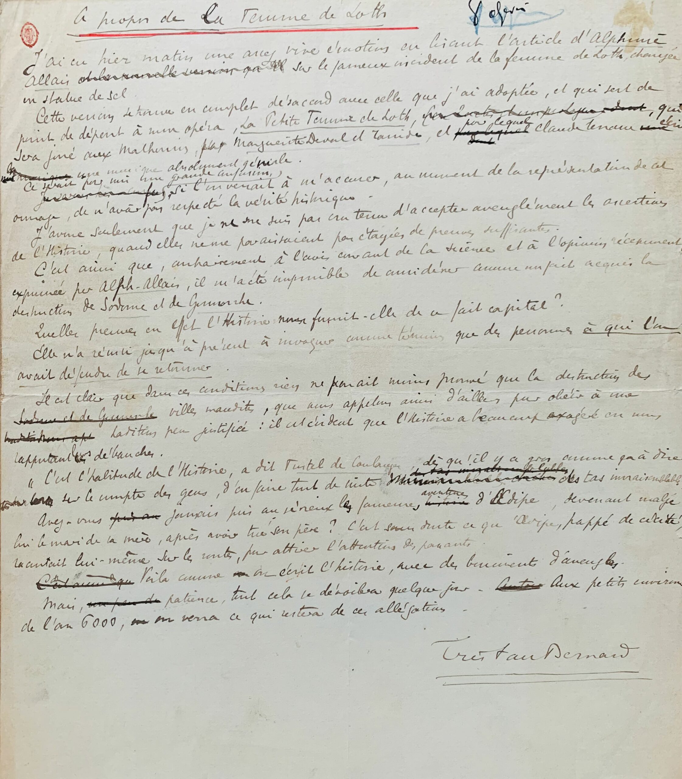 Tristan Bernard (Besançon, 1866/1947)Manuscrit de l'article de Tristan Bernard en réponse à celui d'Alphonse Allais paru la veille et intitulé "A propos de la Femme de Loth", il a été publié dans Le Journal n°2829 du 29 juin 1900. «J'ai eu hier matin une assez vive émotion en lisant l'article d'Alphonse Allais sur le fameux incident de la Femme de Loth, changée en statue de sel. Cette version se trouve en complet désaccord avec celle que j'ai adoptée, et qui sert de point de départ à mon opéra, La Petite Femme de Loth, qui sera joué aux Mathurins [...] et pour lequel Claude Terrasse écrit une musique absolument géniale [...]». Il se défend de n'avoir pas respecté la vérité historique. «J'avoue seulement que je ne me suis pas cru tenu d'accepter aveuglément les assertions de l'Histoire, quand elles ne me paraissaient pas étayées par des preuves suffisantes. C'est ainsi que, contrairement à l'avis courant de la science et de l'opinion récemment exprimée par Alph. Allais, il m'a été impossible de considérer comme un fait acquis la destruction de Sodome et Gomorrhe. Quelles preuves, en effet, l'Histoire nous fournit-elle de ce fait capital? [...] Avez-vous jamais pris au sérieux les fameuses aventures d'Oedipe, devenant, malgré lui, le mari de la mère, après avoir tué son père? C'est sans doute ce qu'Oedipe, frappé de cécité, racontait lui-même sur les routes, pour attirer l'attention des passants. Voilà comme on écrit l'histoire, avec des boniments d'aveugles. Mais, patience, tout cela se dévoilera quelque jour. Aux petits environs de l'an 6000, on verra ce qui restera de ces allégations». Sont joints trois portraits de Tristan Bernard (dont une caricature de Sem), tirés de journaux.