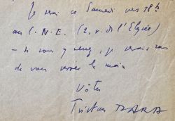 Tristan Tzara le remercie de sa lettre. "Je serais moi-même très content de vous voir. Voulez-vous me téléphoner un de ces jours pour que nous puissions convenir d'un rendez-vous? Je serai ce samedi vers 18h au C.N.E. (2, rue de l'Elysée). Si vous y venez, je serais ravi de vous serrer la main". [Il s'agit du Comité National des Ecrivains, créé en 1941, dans la clandestinité, par Decour et Paulhan].