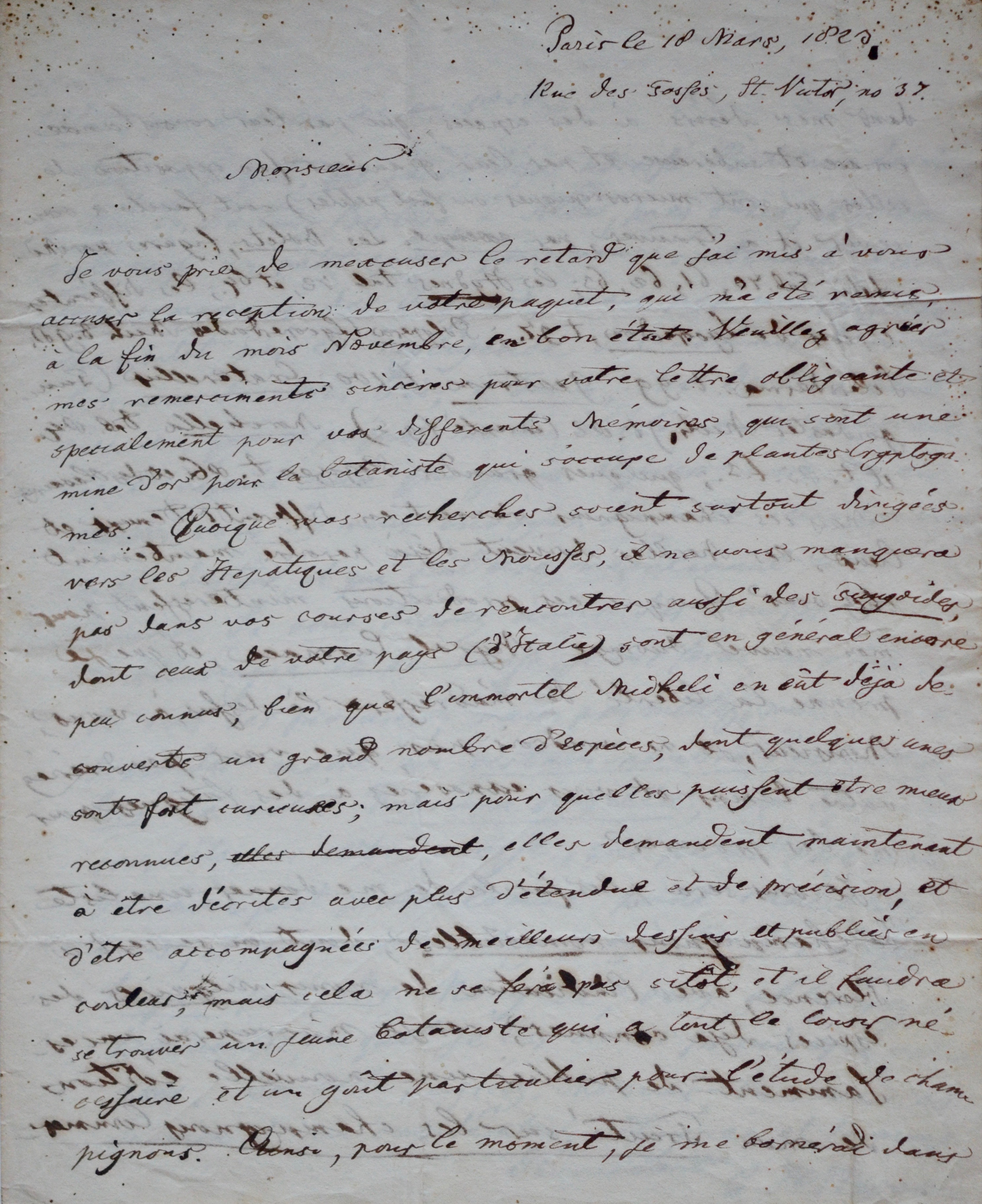 Il accuse réception d'un colis et de "différents mémoires qui sont une mine d'or pour les botanistes qui s'occupe de plantes Cryptogrammes. Quoique nos recherches soient surtout dirigées vers les Hépatiques".