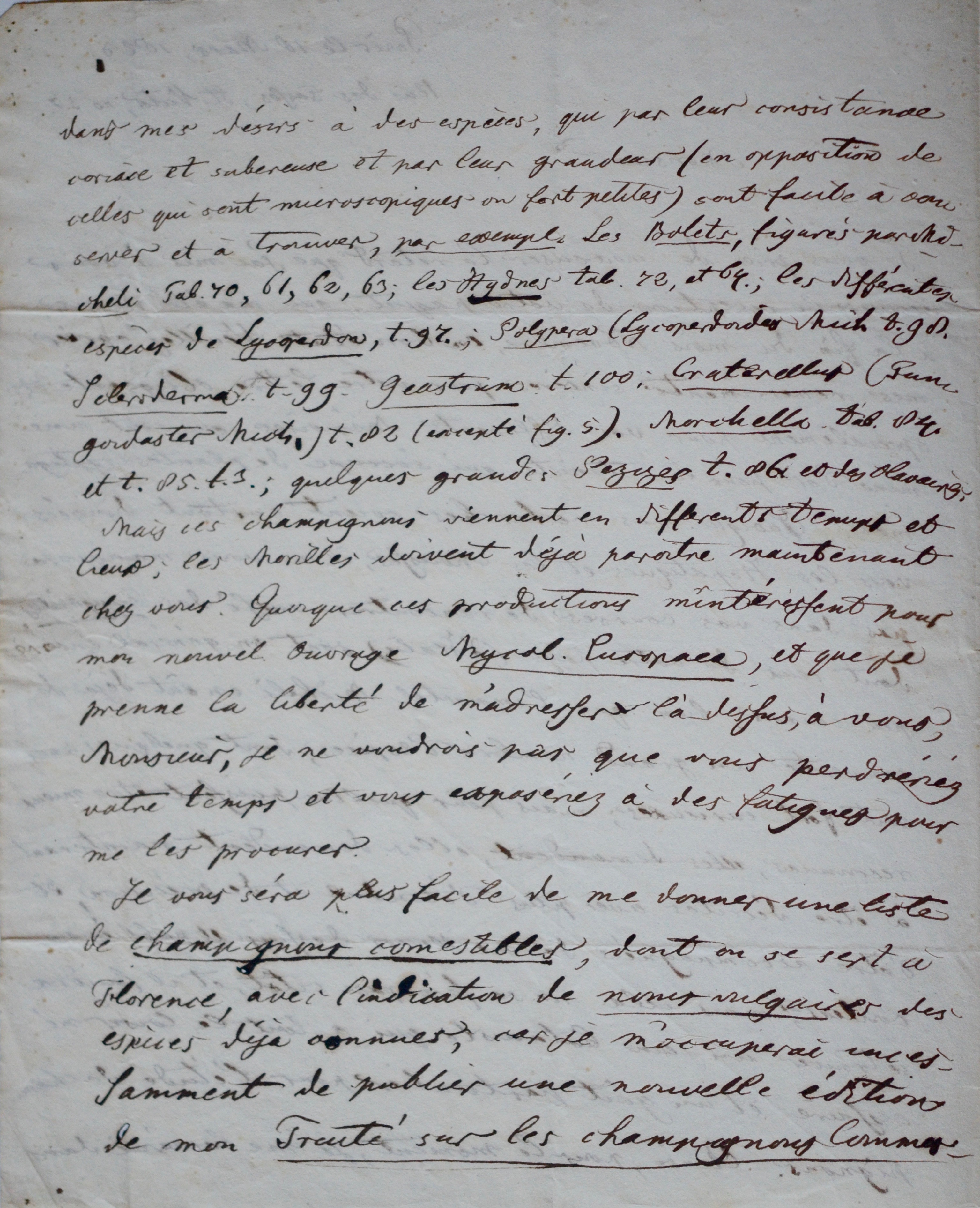 "Il vous sera plus facile de me donner une liste de champignons comestibles, dont on se sert à Florence, avec l'indication de noms vulgaires des espèces déjà connues, car je m'occupe incessamment de publier une nouvelle édition de mon Traité sur les champignons comestibles, qui a paru ici en 1818."