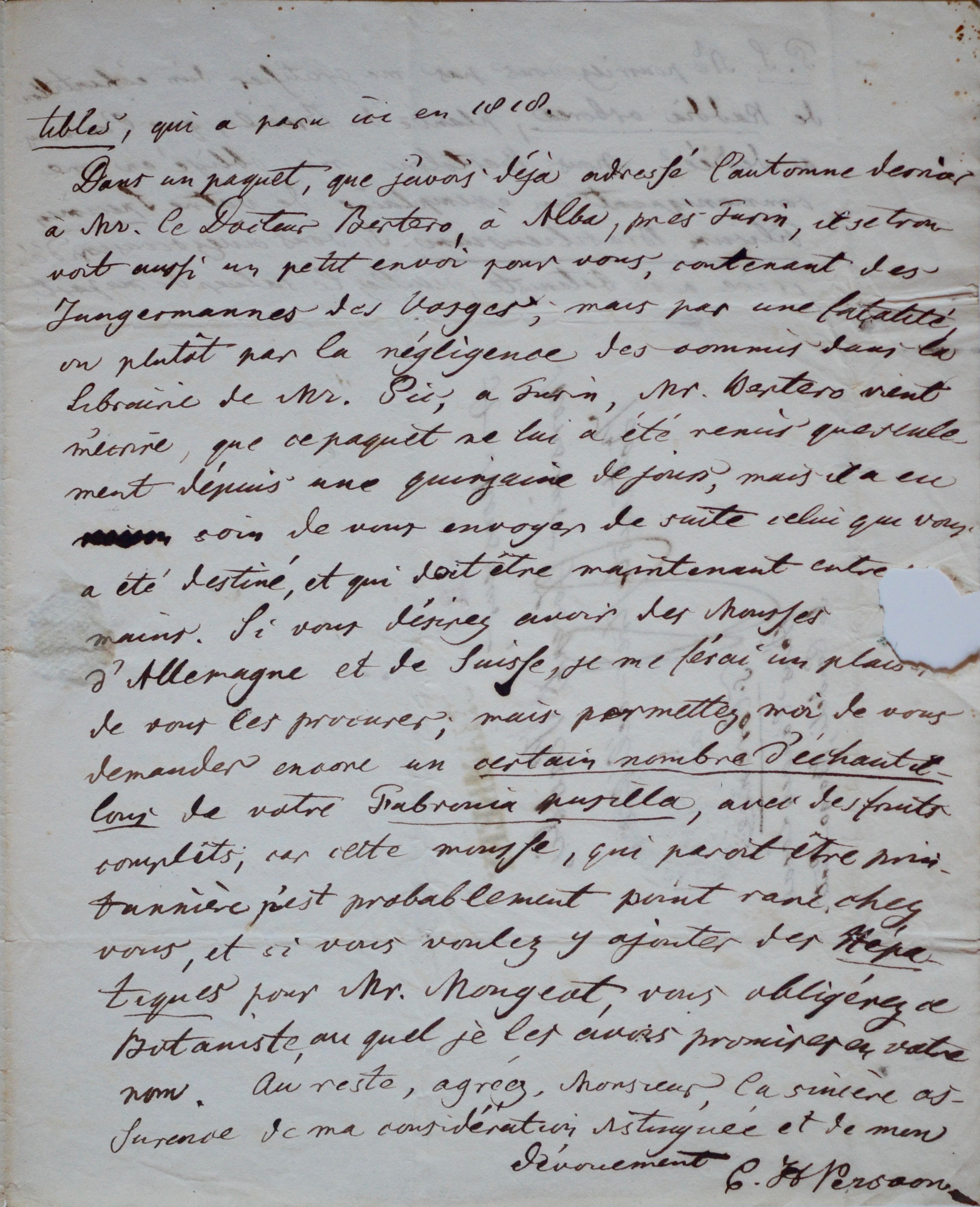 Lettre adressée par Christiaan Hendrik Persoon à son estimé confrère Giuseppe Raddi.