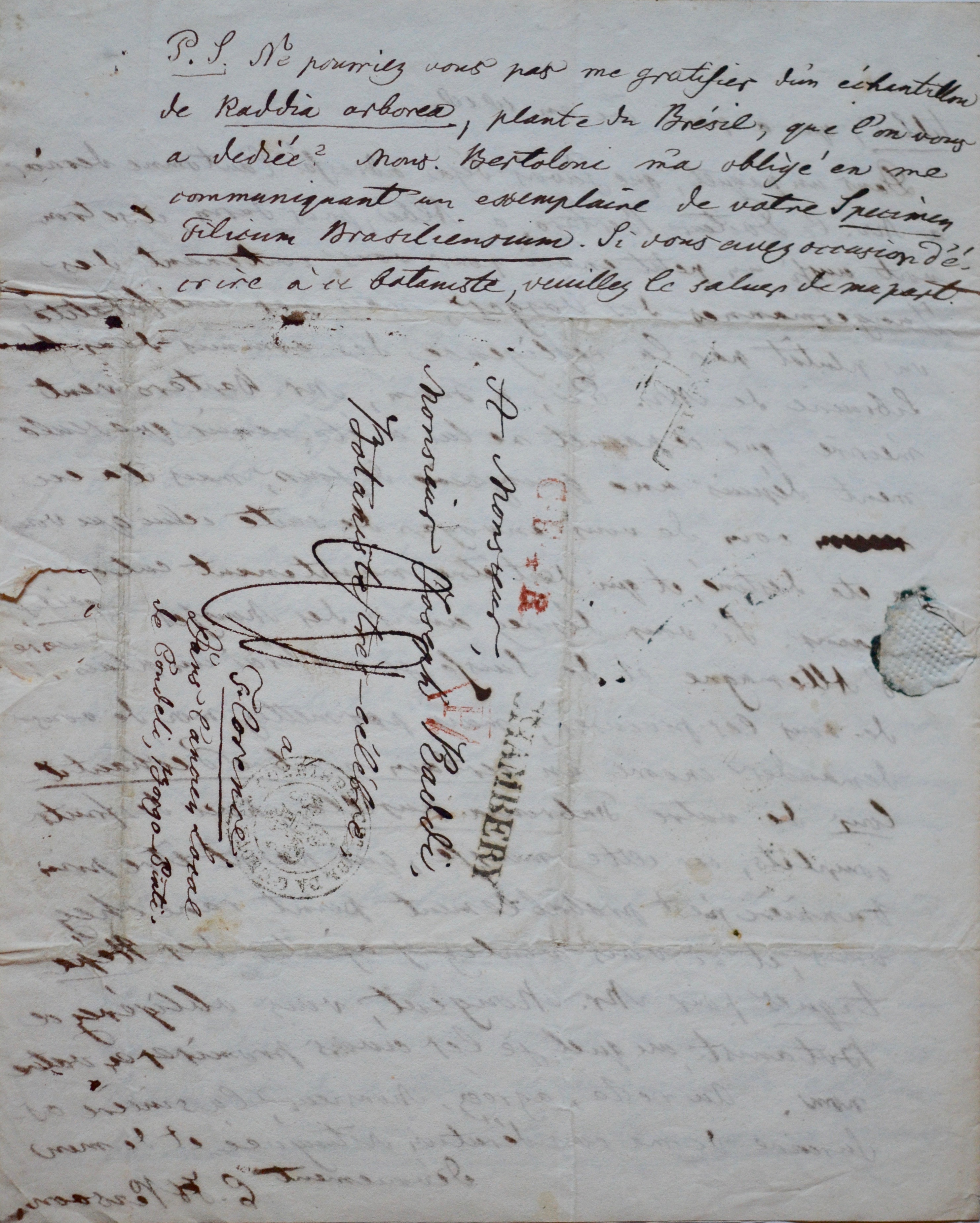 Encre brune sur double feuillet. Adresse au verso du second feuillet "Monsieur Joseph Raddi - Botaniste très-célèbre - Florence", avec Post-scriptum, marques postales de Paris, Chambéry et Gênes.