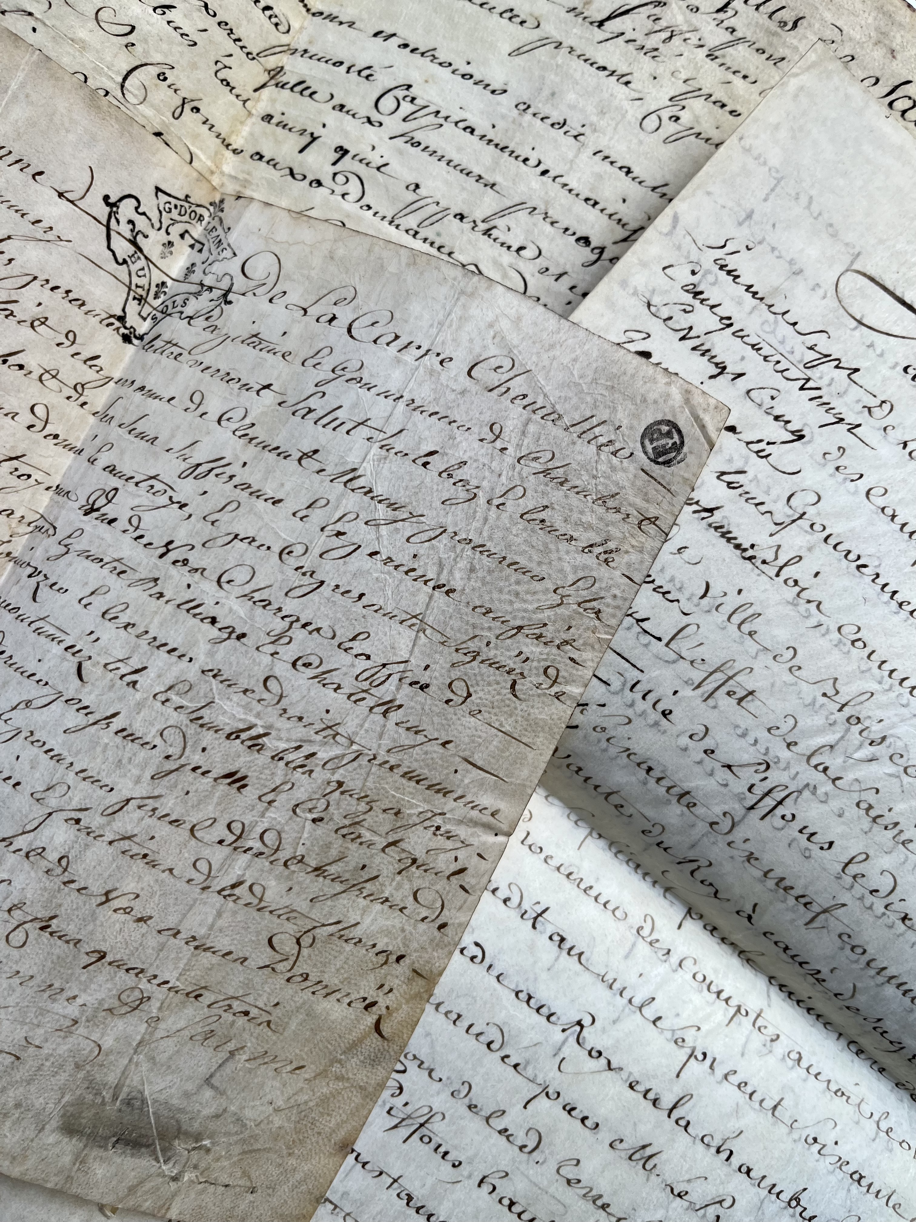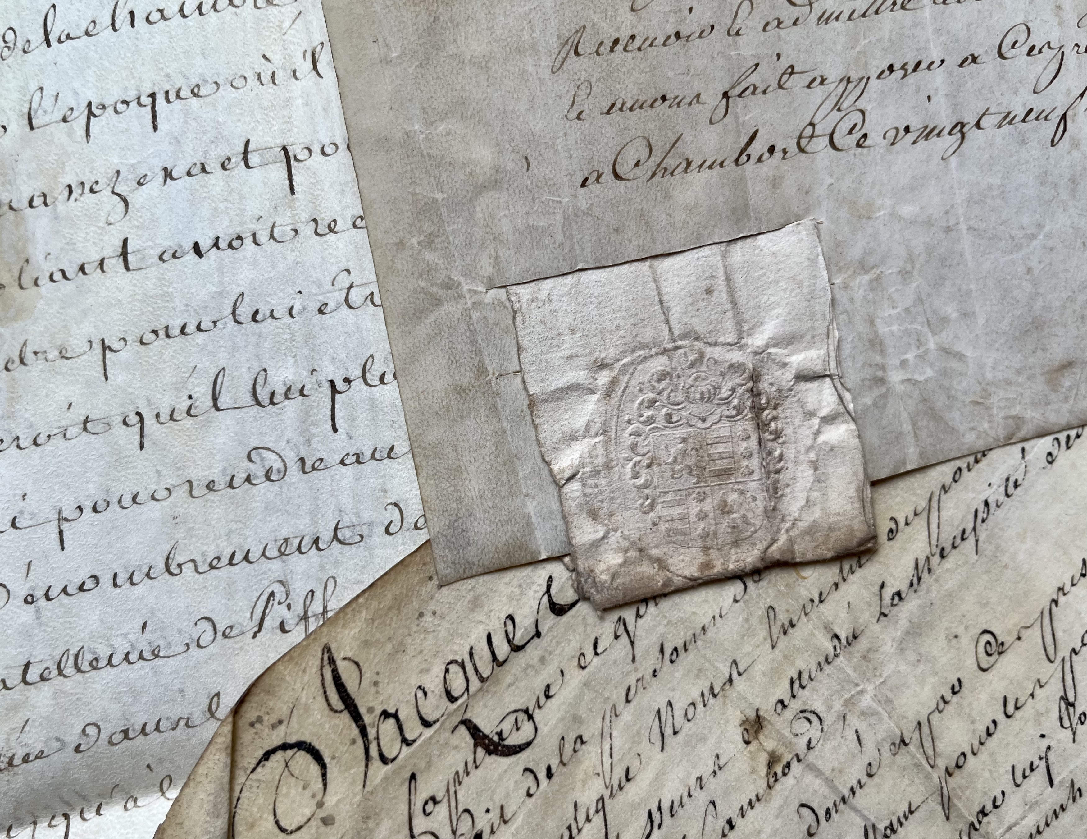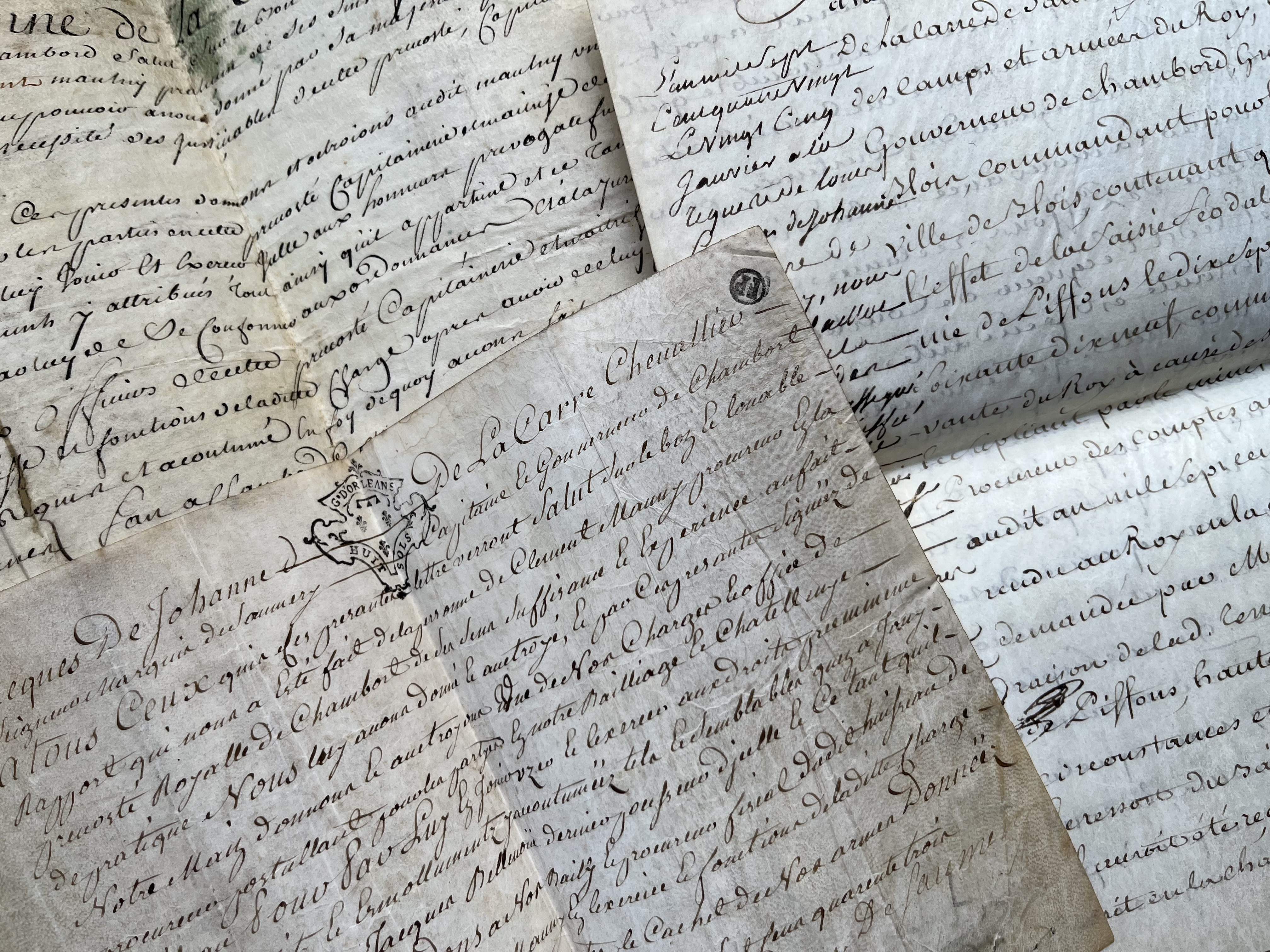 - Jacques de Johanne de La Carre de Saumery «capitaine et gouverneur de Chambord». 2 pièces signées sur parchemin, Chambord, 1740-1743. Octroi d'une charge de procureur «en cette prévosté capitainerie et maitrise des Eaux et forests dudit Chambord» puis en la châtellenie d'Huisreau, en faveur de Clément Maulny.
