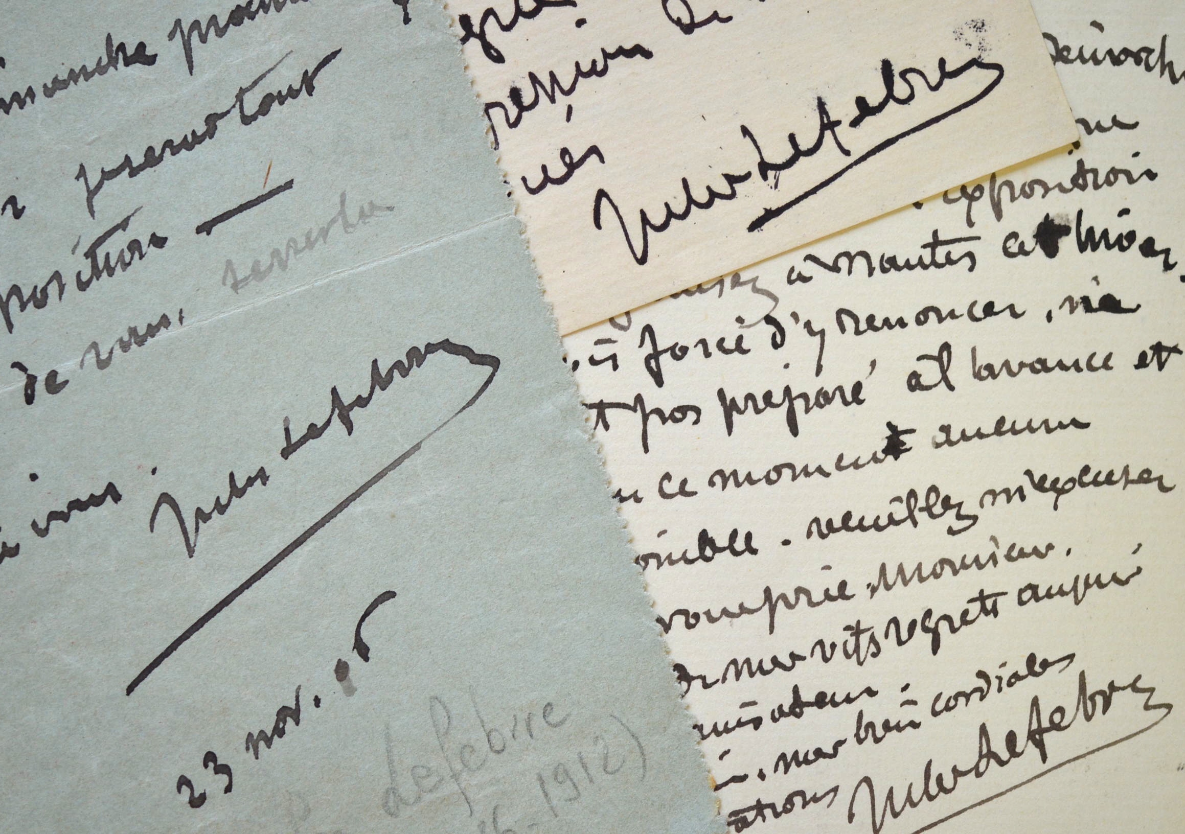 Dans ces lettres, le peintre Jules Lefebvre regrette de ne pouvoir exposer à Nantes « n'y étant pas préparé à l'avance et n'ayant en ce moment aucune toile disponible » - et s'excuse de n'avoir pu honorer une invitation « appelé hier soir auprès d'une parente âgée et très dangereusement malade ».