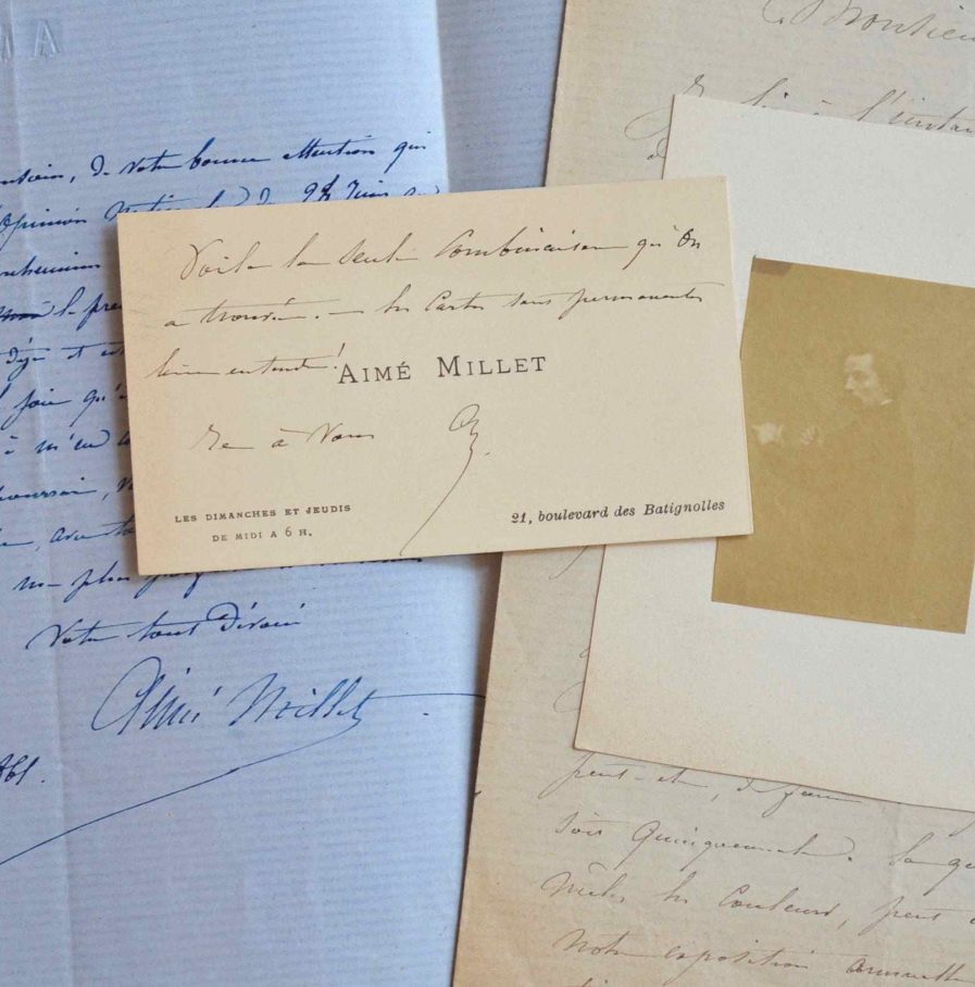 Aimé Millet (Paris, 1819/1891)Par ces trois lettres adressées à un journaliste et formant un remarquable témoignage des relations des artistes avec la presse, le peintre et sculpteur Aimé Millet fait preuve d'une belle honnêteté : «Je ne vous cacherai pas que j'avais été un peu vexé en lisant votre appréciation de la sculpture dans le numéro de la veille [de L'Opinion nationale], de n'y pas trouver au moins mon nom. Et pour un peu, j'allais vous trouver bien mauvais goût. Mais l'article du lendemain est venu me retirer de cette erreur d'un moment pour me remettre dans mon ancienne opinion.» Il lui envoie également une copie du catalogue raisonné qu'il a établi de son oeuvre : «Vous avez bien voulu me consacrer quelques lignes dans votre revue de la sculpture et je m'autorise de celles-ci pour vous envoyer ce catalogue qui vous dira peut-être que je ne suis pas tout à fait indigne de votre aimable attention.» Et même s'il veille constamment à ménager les susceptibilités de son correspondant, il donne son avis, notamment dans un débat opposant certains artistes à l'Administration des Beaux-Arts : «Je reprends le "nous" collectif et puis vous assurer que nous n'avons jamais entendu dénier à l'État le droit, et même le devoir peut-être, de faire son exposition soit triennale soit quinquennale. La question, c'est de ne pas mêler les couleurs, peut dire un sculpteur.» On joint : une carte de visite signée d'Aimé Millet avec trois lignes autographes ainsi qu'une photographie originale (58 x 42 mm environ) représentant l'artiste, contrecollée sur papier.