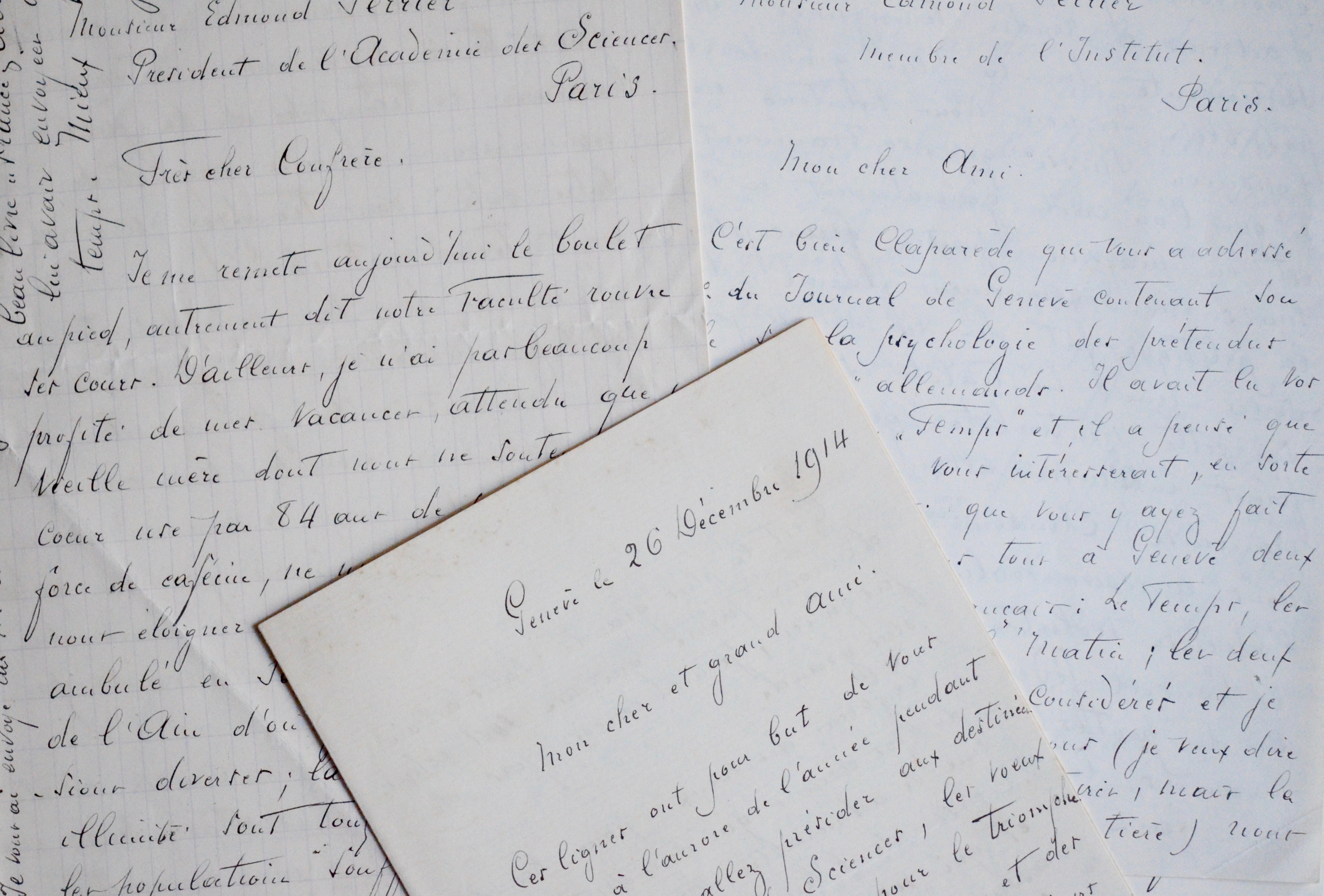 Longues lettres sur la guerre vue de Suisse, le soutien aux troupes françaises, la constitution d’un comité de secours aux étudiants prisonniers, les tensions entre Suisses francophones et germanophones, la reprise des cours à l’Université de Genève, etc. "[...] Ces lignes ont pour but de vous exprimer, à l’aurore de l’année pendant laquelle vous allez présider aux destinées de l’Académie des sciences, les vœux ardents que je forme pour le triomphe définitif des hautes pensées et des sentiments généraux qu’ont toujours défendus les savants français pour lesquels je conserve une inébranlable sympathie. Je n’oublierai jamais la part qui vous revient dans l’insigne honneur que m’a fait l’Académie au mois de mars dernier, en m’attachant à elle comme membre correspondant […]".