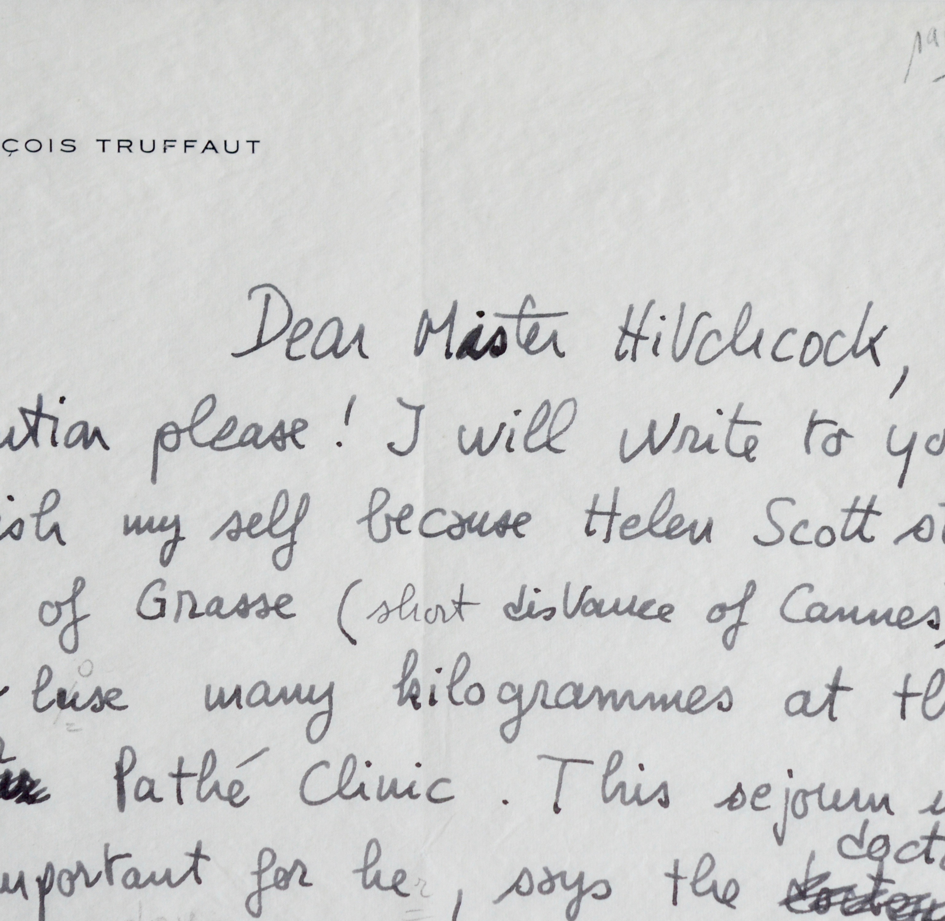 François Truffaut (Paris, 1932/1984)Belle lettre de François Truffaut, adressée à Alfred Hitchcock, dans un anglais balbutiant, relative au Hitchbook. Corrections discrètes au crayon à papier.