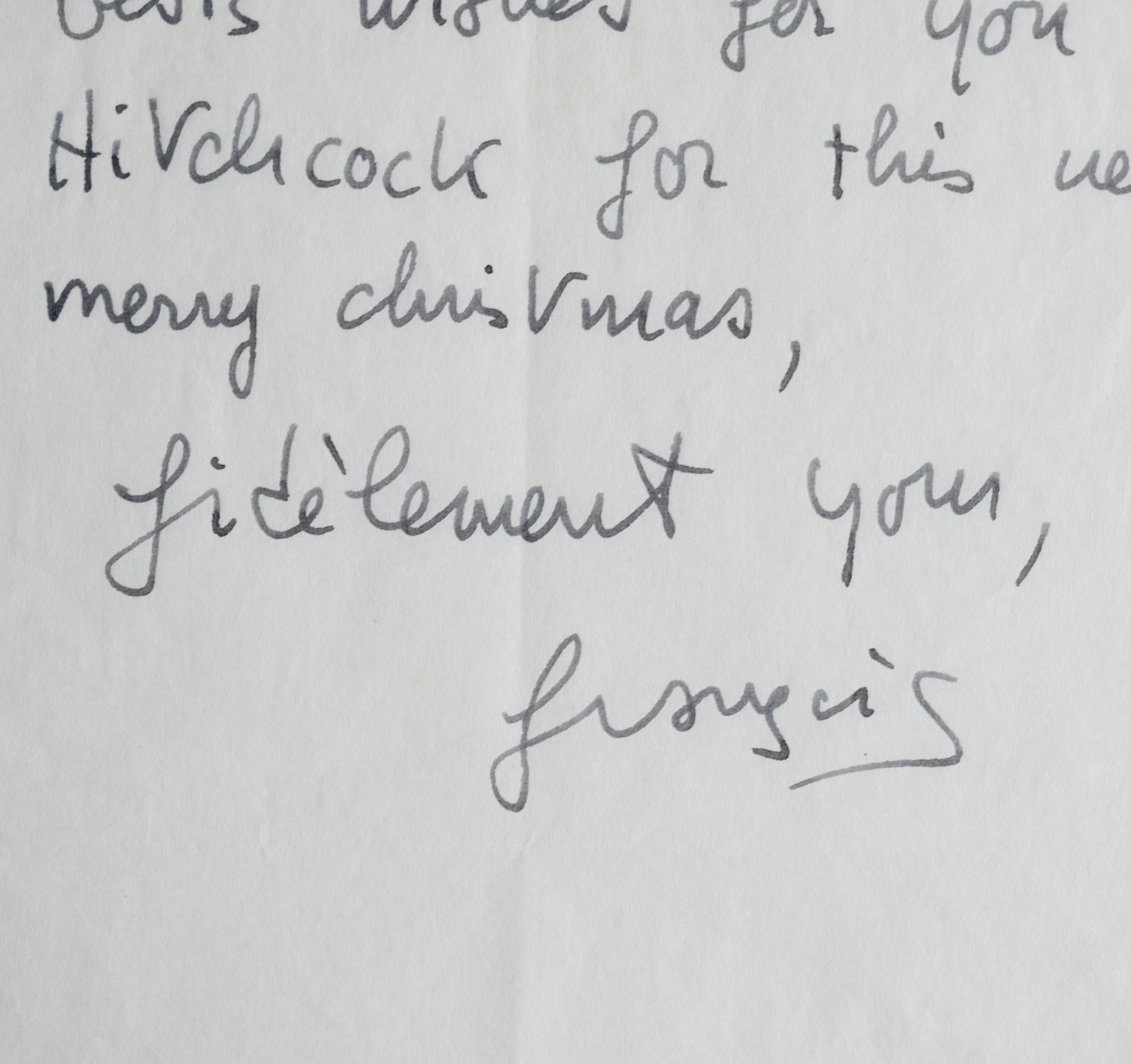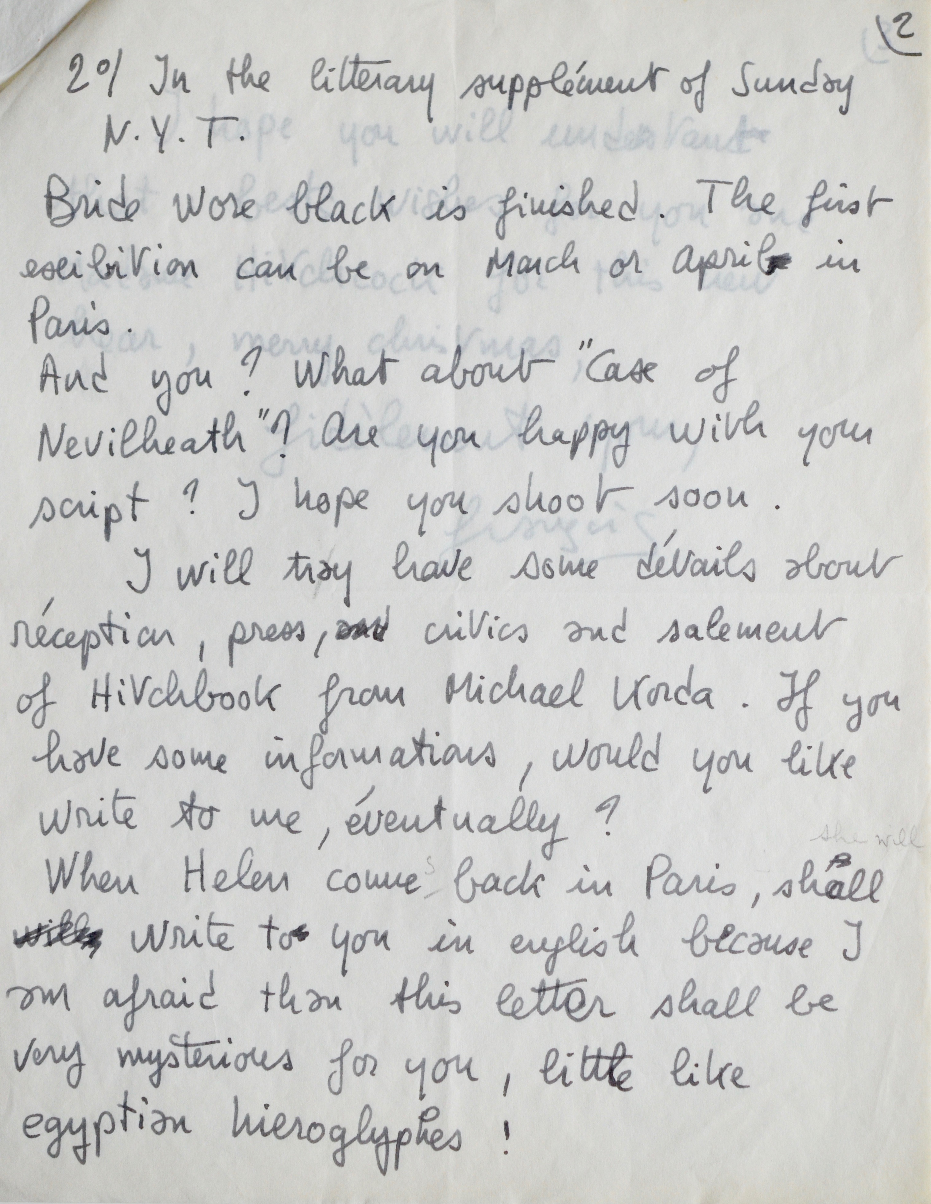 "Dear Mister Hitchcock, attention please ! I will write to you in english my self because Helen Scott stay in city of Grasse (short distance of Cannes) for to loose many kilogrammes at the Doctor Pathé Clinic. This sojourns very important for her, says the doctors. How find the english version of the Hitchbook ? Personnaly I am very happy with it because I think it is better than french version, stills biggers and most beautifuls and so the "mise en page". Do you think so ? I saw a marvellous, two marvellous papers about it. 1° in the N.Y. Times 2° In the literary supplément of Sunday N.Y.T. Bride wore black is finished. The first exhibition can be on march or April in Paris. And you ? What about "Case of Nevilheath" ? Are you happy with your script ? I hope you shoot soon [...]". Il attend plus de renseignements de Michael Korda, sur les ventes du Hitchbook, sa réception médiatique, les critiques, etc. "I am afraid than this letter shall be very mysterious for you, little like egyptian hieroglyphes. I hope you will understand that : bests wishes for this new year, merry christmas, fidèlement yours [...]".