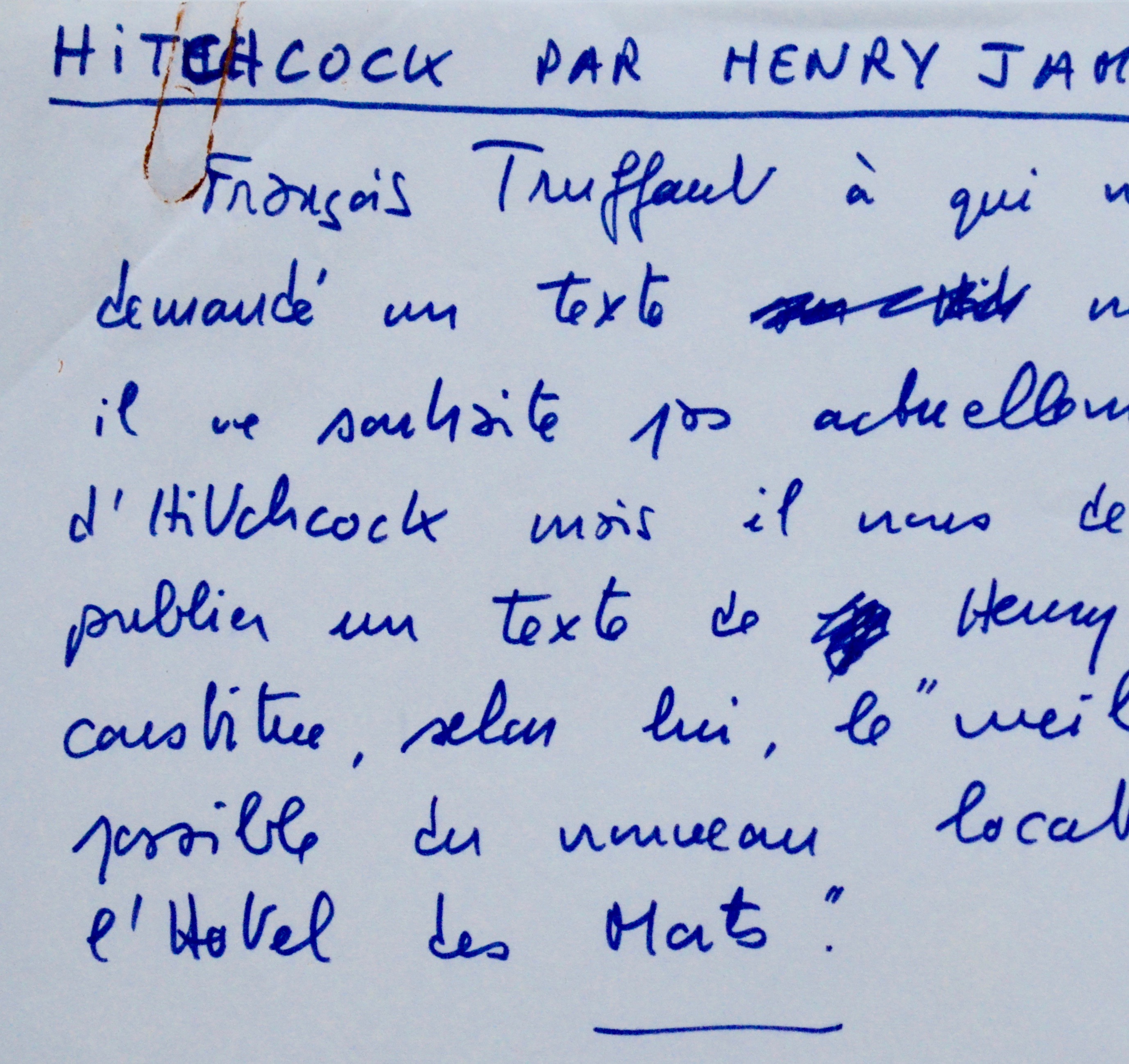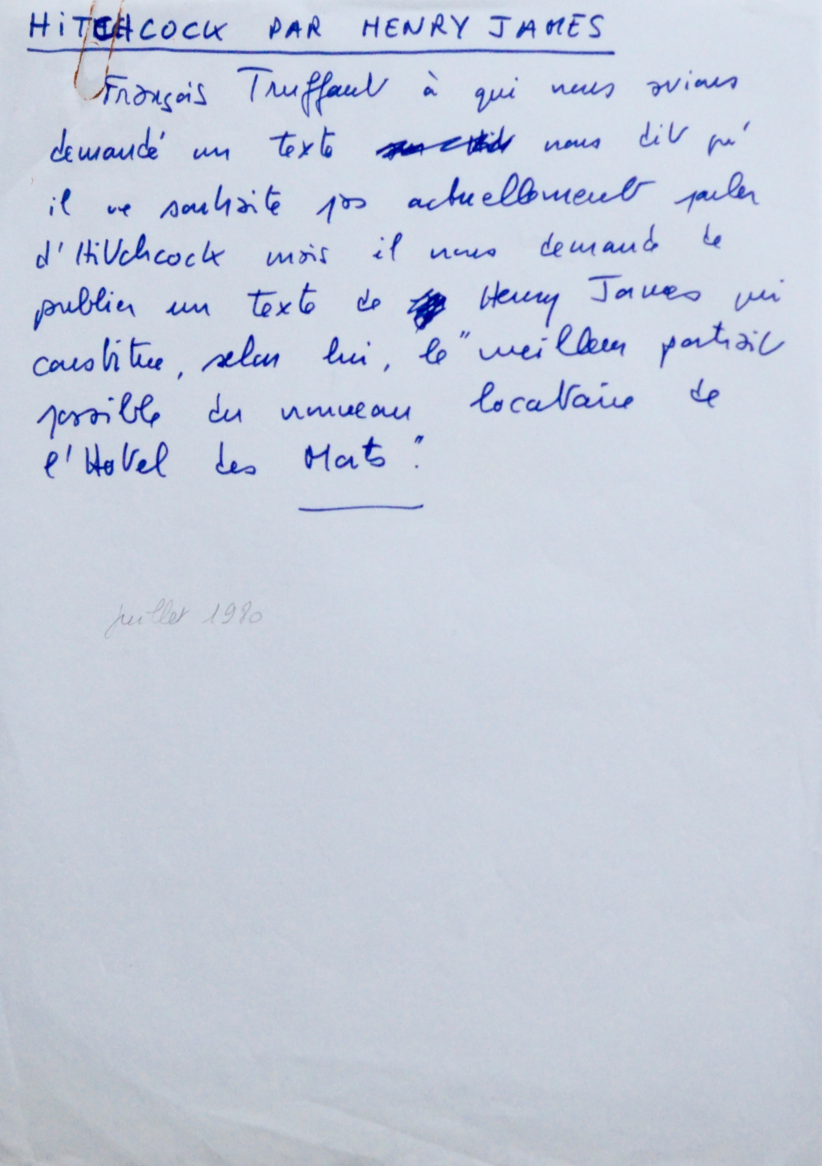 « François Truffaut à qui nous avions demandé un texte nous dit qu’il ne souhaite pas actuellement parler d’Hitchcock mais il nous demande de publier un texte de Henry James qui constitue, selon lui, le « meilleur portrait possible du nouveau locataire de l’Hôtel des Morts ».