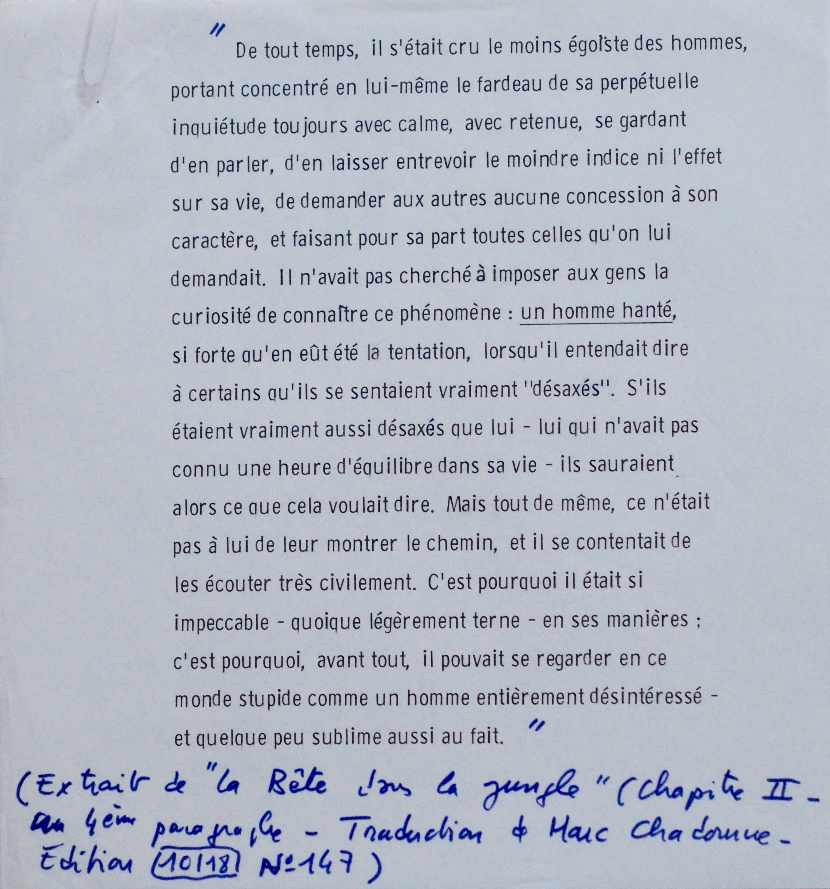 Suit le texte en question, dactylographié, annoté par Truffaut qui en précise l’origine : « Extrait de « la Bête dans la jungle » (chapitre II – 4ème paragraphe – Traduction de Marc Chadourne – Edition 10/10 n°147) ».