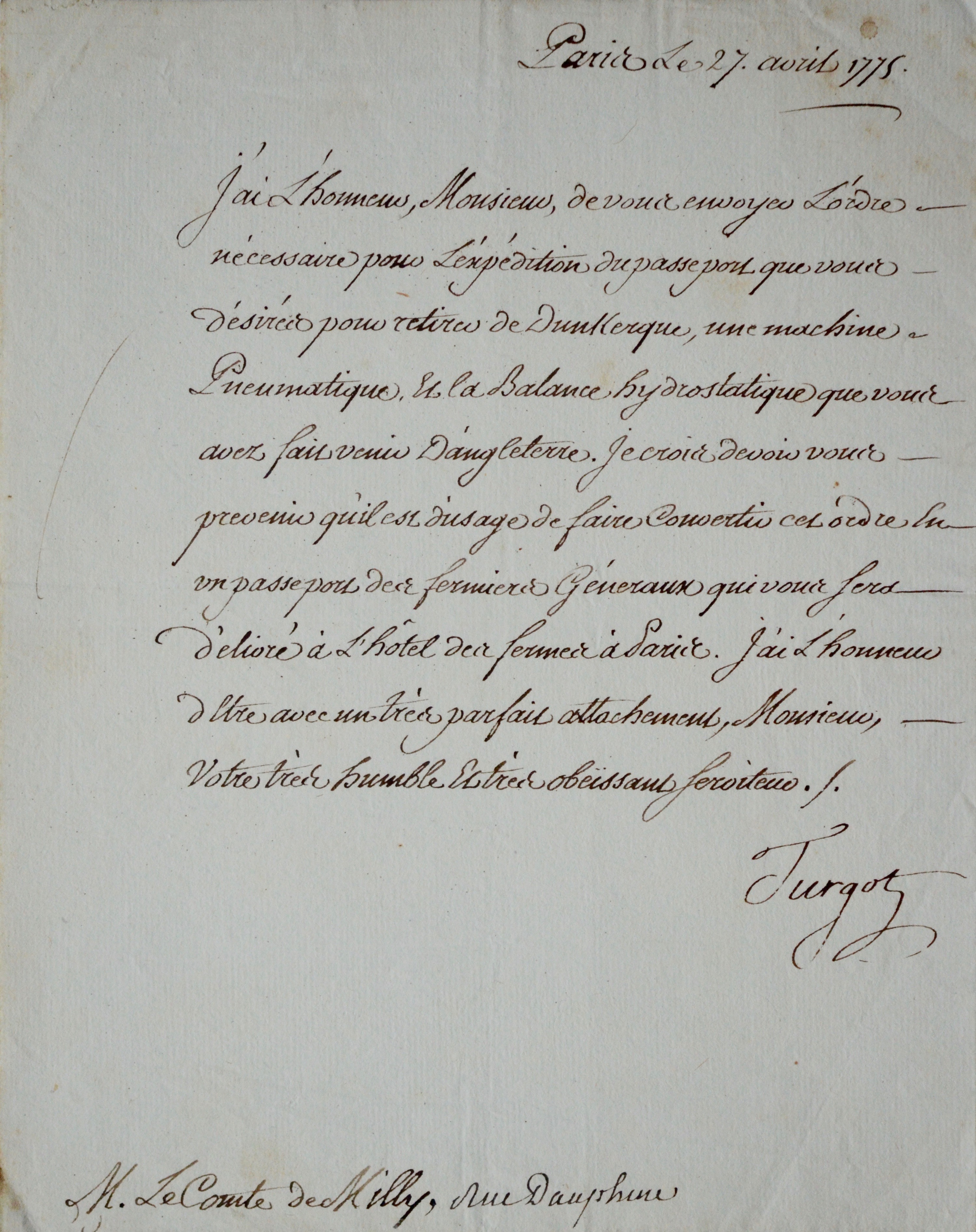 "J'ai l'honneur, Monsieur, de vous envoyer l'ordre nécessaire pour l'expédition du passeport que vous désirés [sic] pour retirer de Dunkerque, une machine Pneumatique, et la Balance hydrostatique que vous avez fait venir d'Angleterre. Je crois devoir vous prévenir qu'il est d'usage de faire convertir cet ordre en un passeport des fermiers Généraux qui vous sera délivré à l'hôtel des fermes à Paris. [...]".