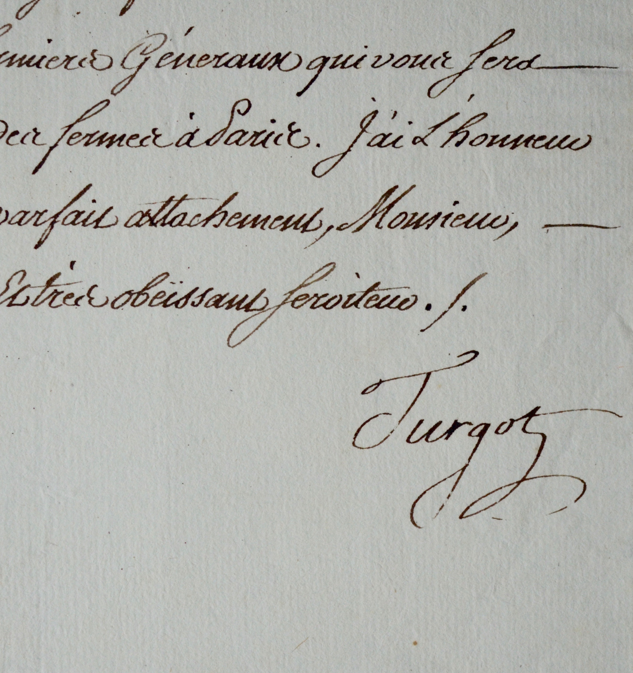 Anne Robert Jacques Turgot (Paris, 1727/1781)Lettre signée de Turgot, dans laquelle il demande un passeport pour des machines scientifiques importées d'Angleterre :