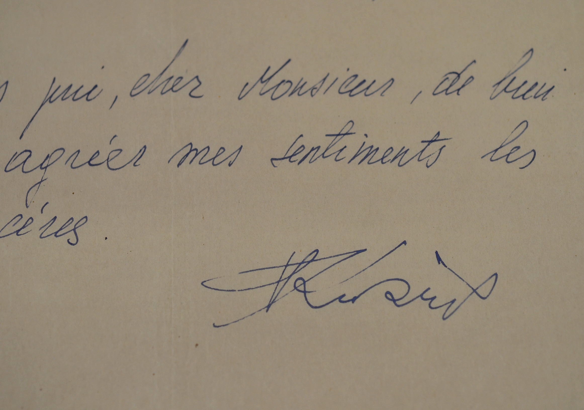 "J'ai l'honneur de vous accuser la réception de votre lettre, datée le 20 juillet 1949, ainsi que du chèque Nr. 122.229 - montant 32.750 frs [...]". [Arrivé à Paris en 1948, sa première exposition y est organisée à la Galerie Raymond Duncan en 1949].
