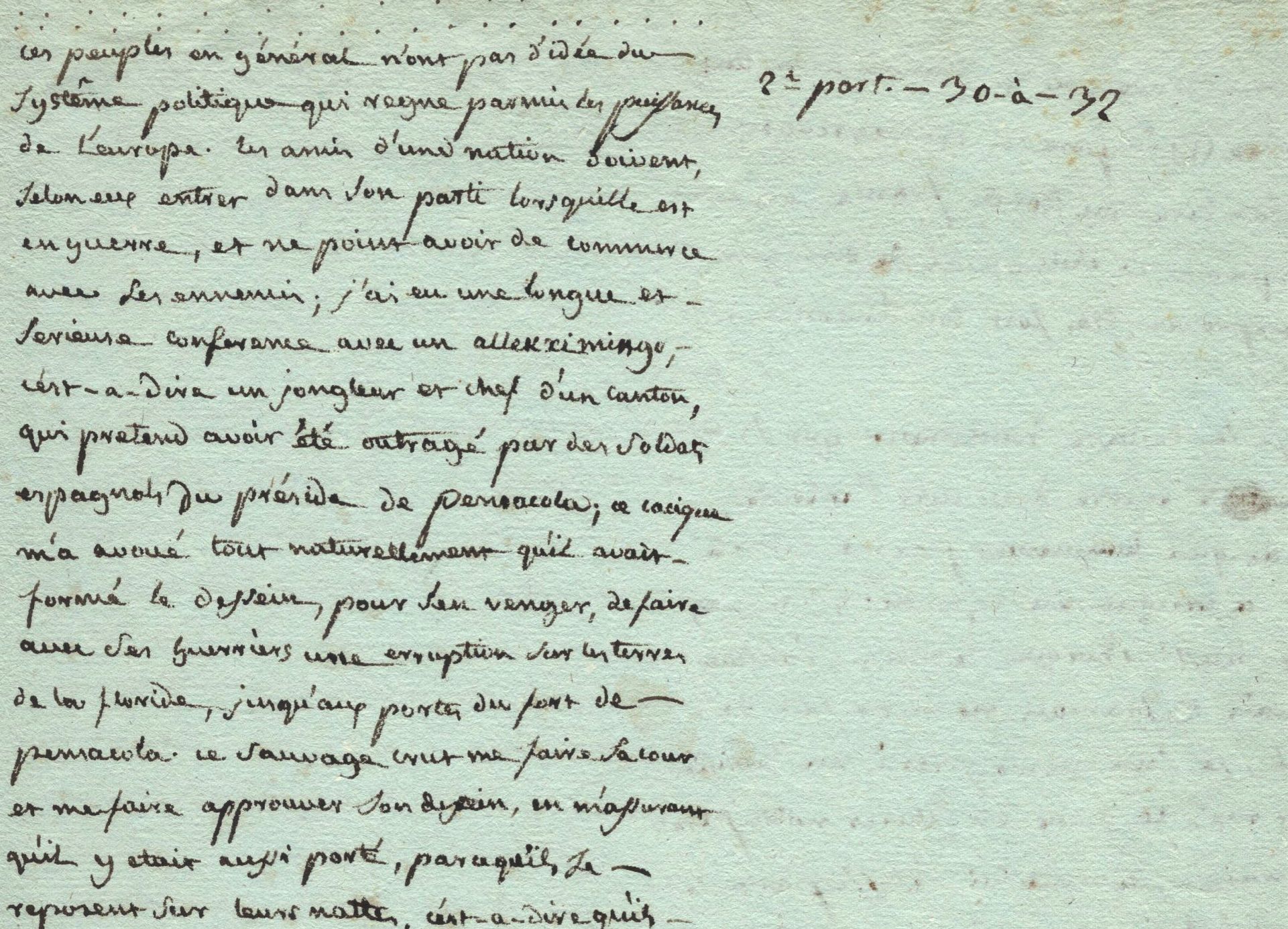 François Just Marie Raynouard (Brignoles, 1761/1836)Notes de la main de Raynouard sur un épisode de la guerre des Indiens de Floride, tiré des "Nouveaux voyages aux Indes Occidentales" de Jean Bernard Bossu (publié en 1768). Cet épisode se déroule en 1759, où le chef d'une tribu indienne, pourtant pacifique, décide de mener une expédition punitive en Floride contre les Espagnols. «[...] Allekximingo, lui dis-je, prépares ton coeur, ouvre tes oreilles, pour entendre la force de ma parole, car elle va te faire revenir l'esprit que tu as perdu aujourd'hui. Je t'apprends donc que le grand chef souverain des Espagnols, qui demeure au delà du grand lac d'eau salée, dans l'ancien monde, où les hommes fourmillent, est frère du père des hommes rouges, c'est à dire du Roi de France, en conséquence je suis obligé de dire que je désapprouve très fort ton téméraire dessein. Je te déclare hautement que si tu persistes encore à vouloir l'exécuter, tu n'a qu'à commencer par me casser la tête [...]». A la fin du texte, une note de Ferdinand Denis : «Cette note m'a été donnée par monsieur Raynouard et elle est écrite de sa main».