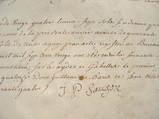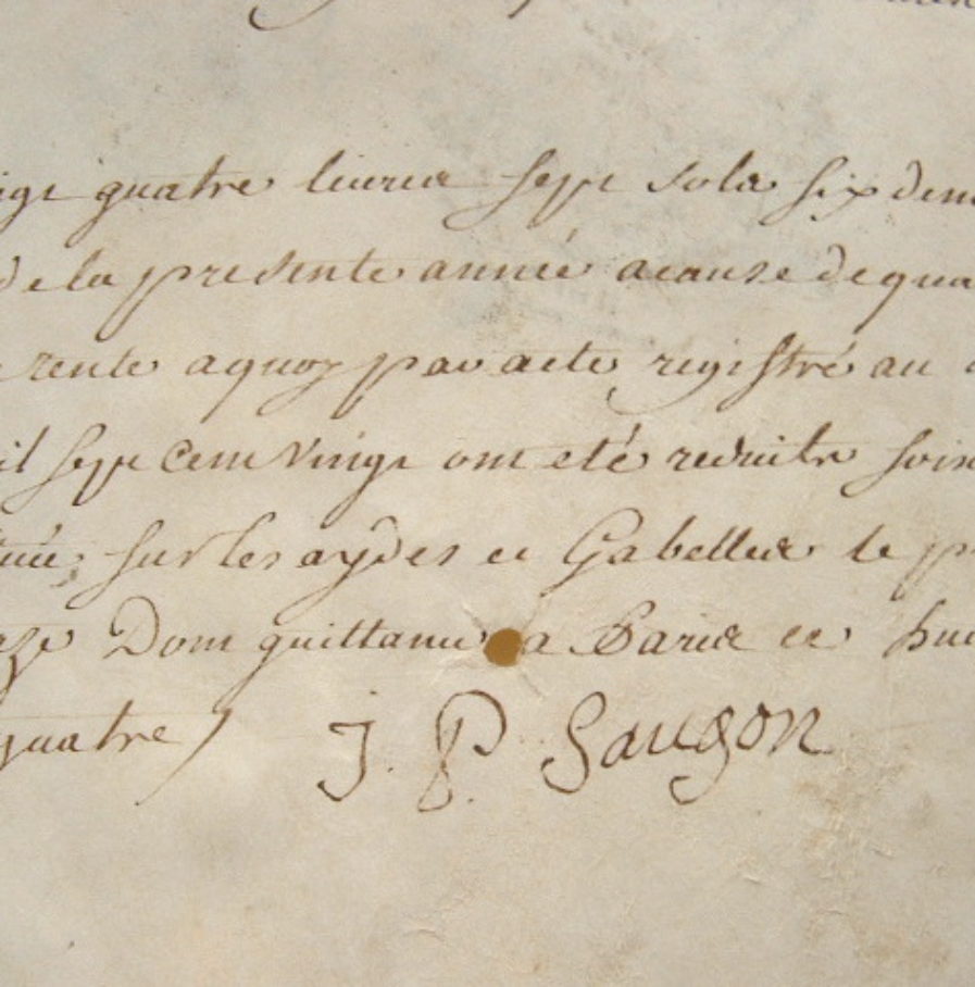 Quittance signée par Jean-Pierre Saugon "imprimeur en lettres" ; il reçoit une rémunération de 24 livres, 7 sols et 6 deniers pour une rente constituée sur les aides et gabelles.