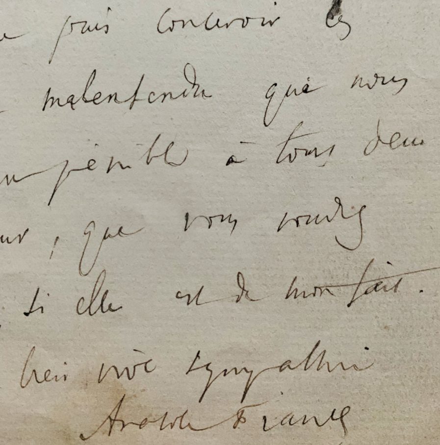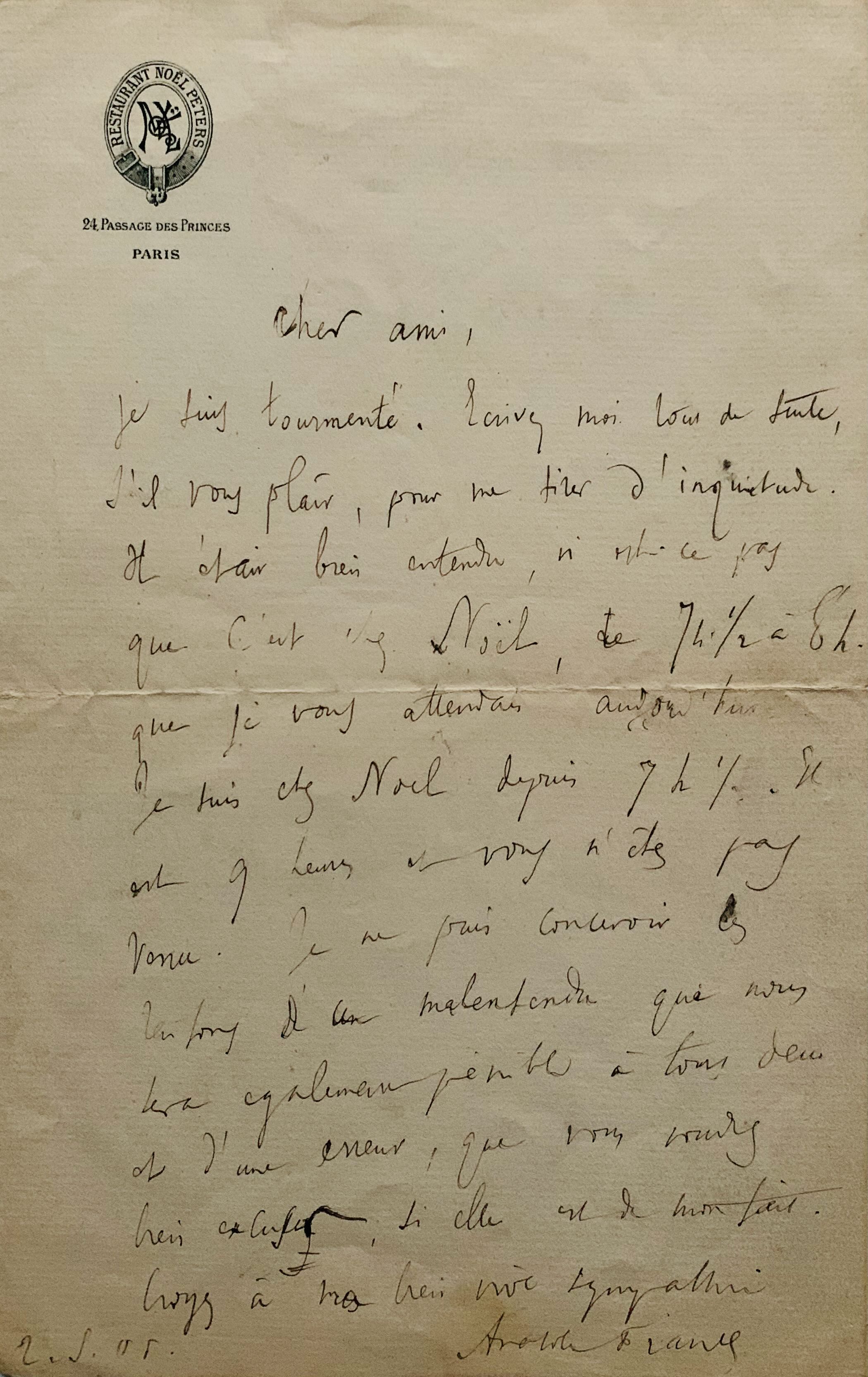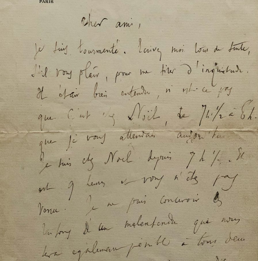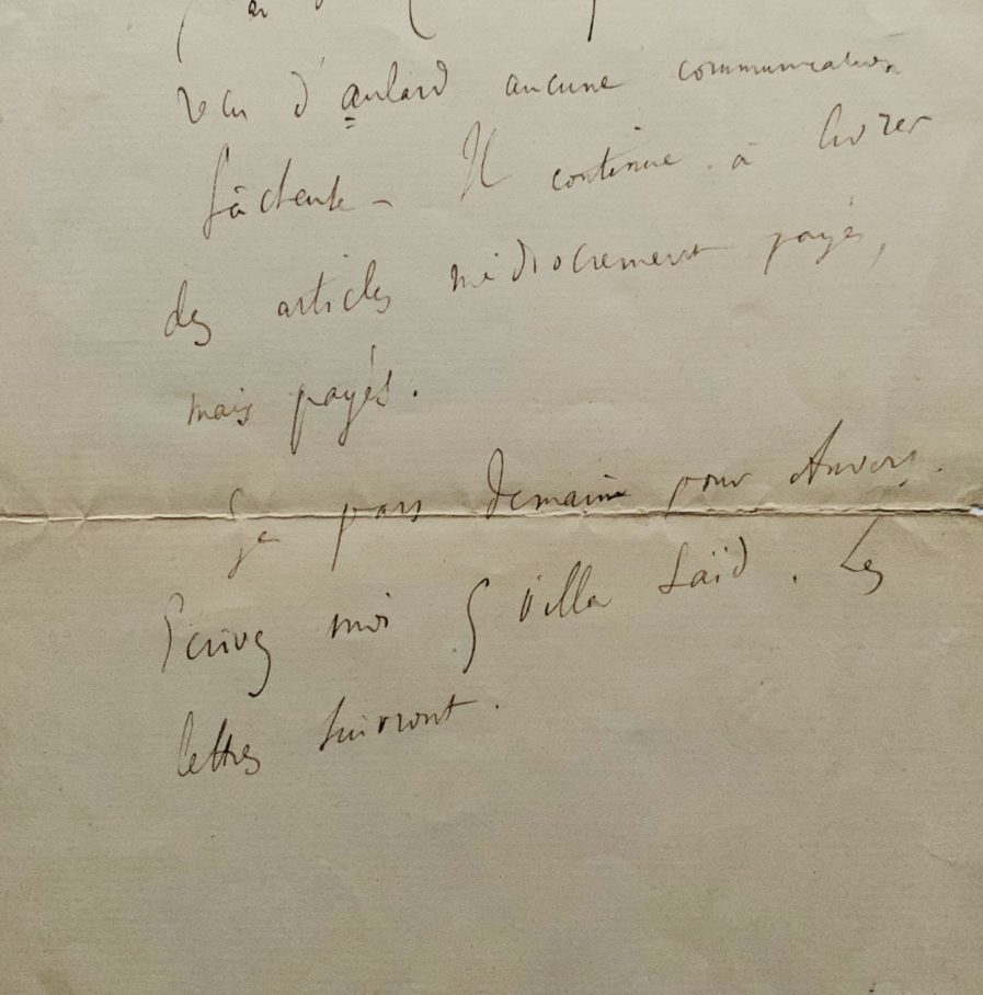 "Je suis tourmenté. Ecrivez-moi tout de suite, s'il vous plait, pour me tirer d'inquiétude. Il était bien entendu, n'est-ce pas, que c'est chez Noël, de 7h 1/2 à 8h, que je vous attendais aujourd'hui. Je suis chez Noël depuis 7h 1/2. Il est 9h heures et vous n'êtes pas venu. Je ne puis concevoir les raisons d'un malentendu qui nous sera pénible également à tout deux [...]". Il ajoute en post scriptum : "J'ai vu Charavay. Il n'a reçu d'Allard aucune communication fâcheuse. Il continue à livrer des articles médiocrement payés mais payés. Je pars demain pour Anvers. Ecrivez-moi 5 villa Saïd. Les lettres suivront".