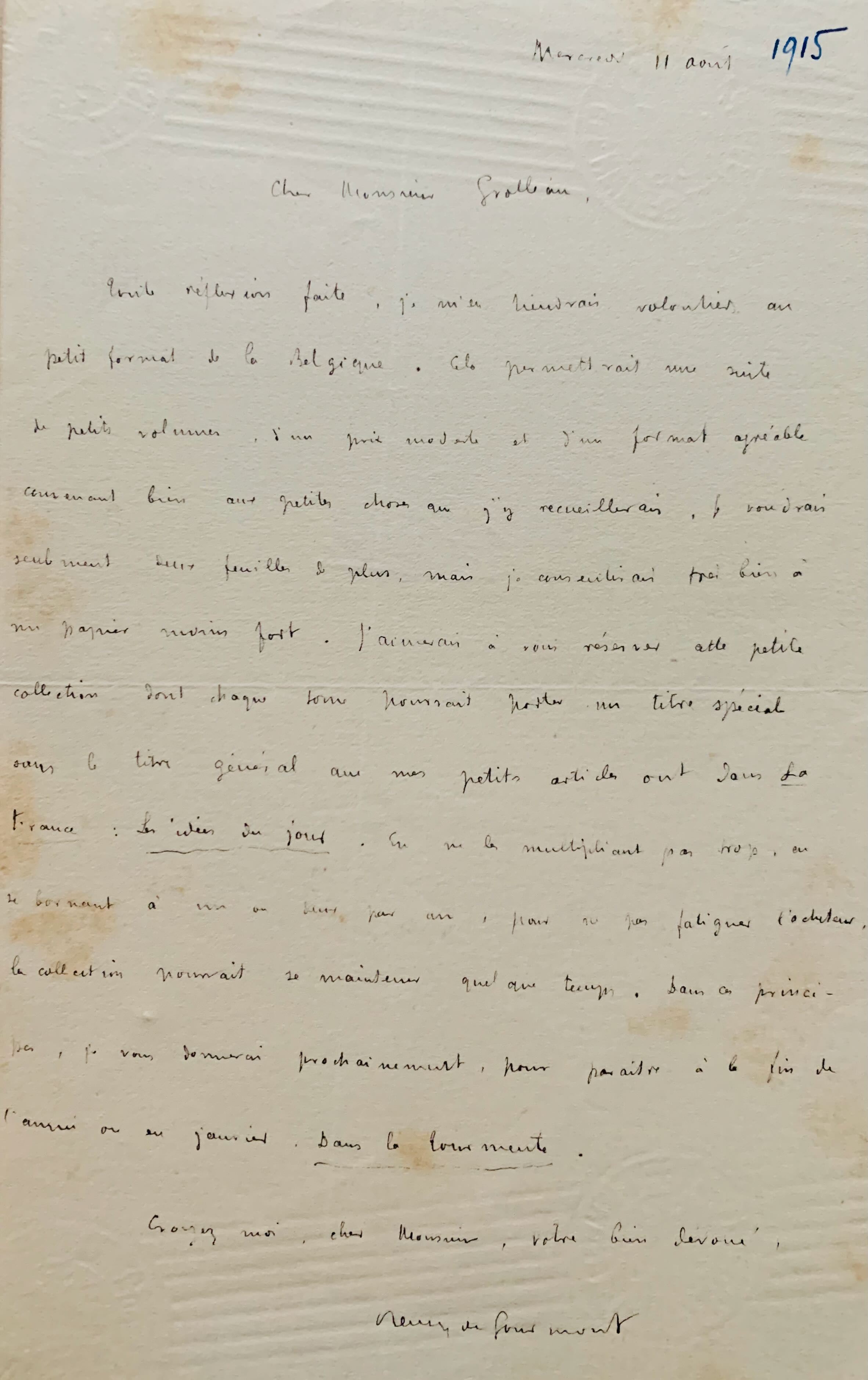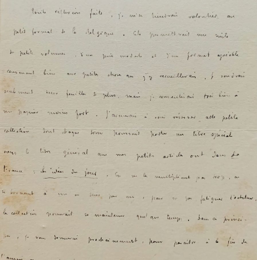 "Toute réflexion faite, je m'en tiendrais volontiers au petit format de la Belgique. Cela permettrait une suite de petits volumes, d'un prix modeste et d'un format agréable convenant bien aux petites choses que j'y recueillerais. Je voudrais seulement deux feuilles de plus, mais je consentirais très bien à un papier moins fort. J'aimerais à vous réserver cette petite collection dont chaque tome pourrait porter un titre spécial sans le titre général que mes petits articles ont dans La France : Les idées du jour. En ne les multipliant pas trop, en se bornant à un ou deux par an, pour ne pas fatiguer l'acheteur, la collection pourrait se maintenir quelque temps. Dans ces principes, je vous donnerai prochainement, pour paraître à la fin de l'année ou en janvier Dans la tourmente".