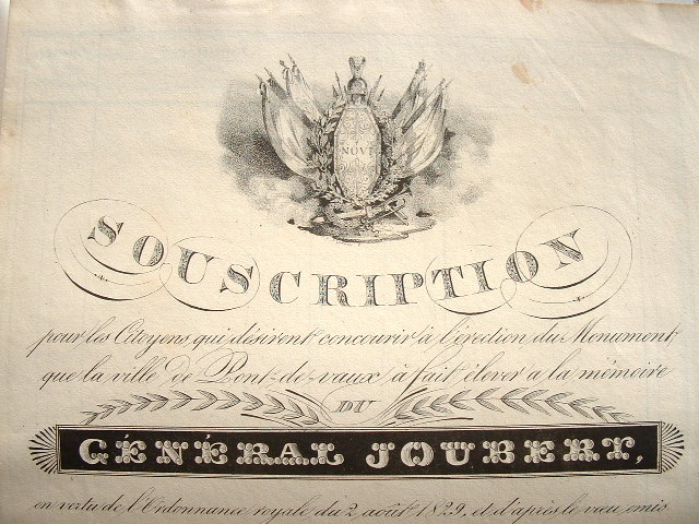 Très décoratif bordereau vierge de souscription "pour les citoyens qui désirent concourir à l'érection du monument que la ville de Pont-de-Vaux a fait élever à la mémoire du Général Joubert, en vertu de l'ordonnance royale du 2 août 1829, et d'après le voeu émis par un grand nombre de compagnons d'armes de cet illustre guerrier". [Le général Barthélemy Joubert (Pont-de-Vaux 1769/1799) fut tué à l'âge de 30 ans à la bataille de Novi].
