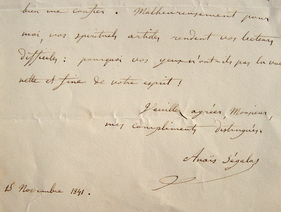 «J'attends l'arrivée de quelque nouvelle pièce pour commencer la tâche que vous voulez bien me confier. Malheureusement pour moi, vos spirituels articles rendent vos lecteurs difficiles : pourquoi vos yeux n'ont-ils pas la vue nette et fine de votre esprit !»