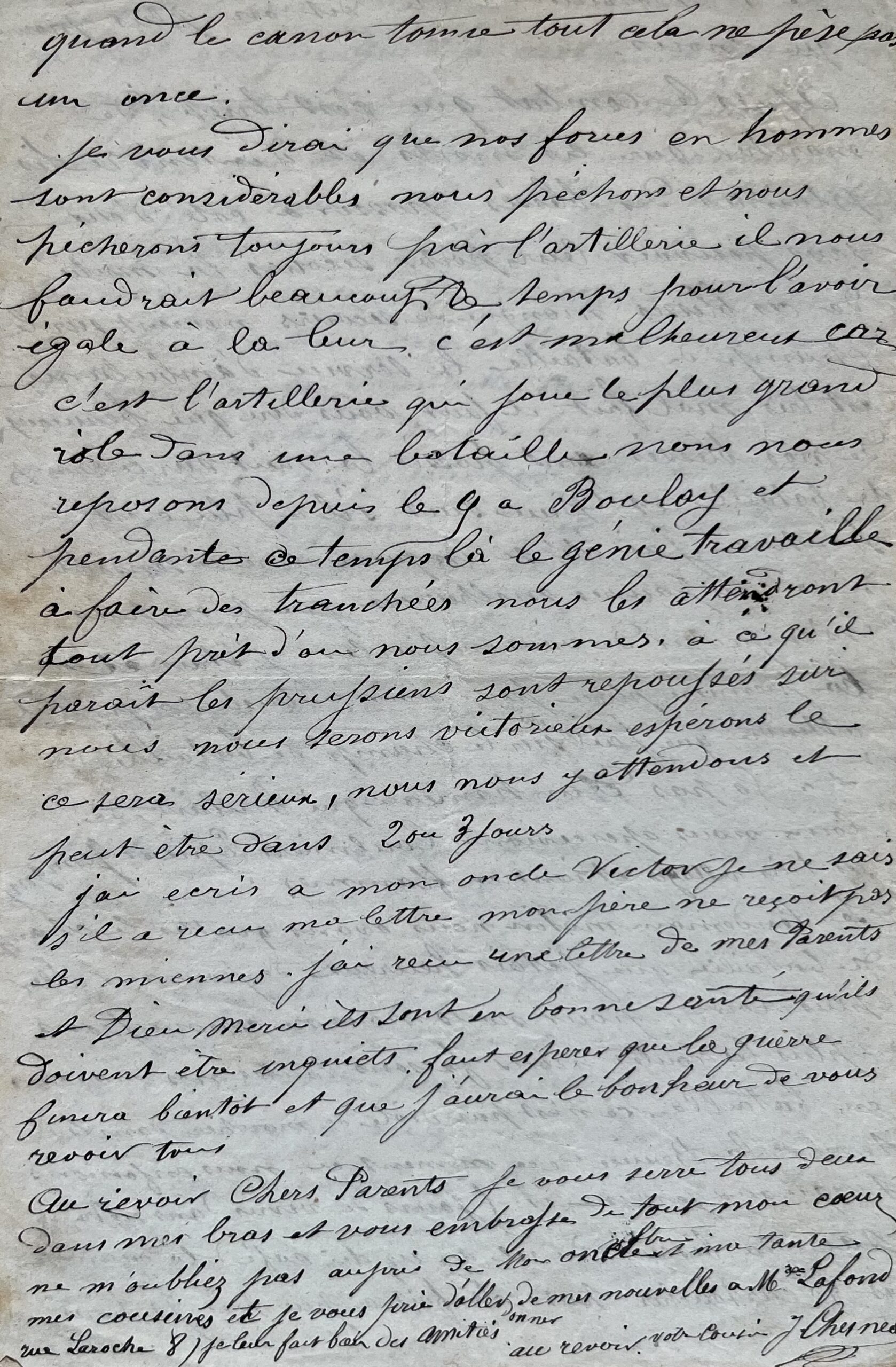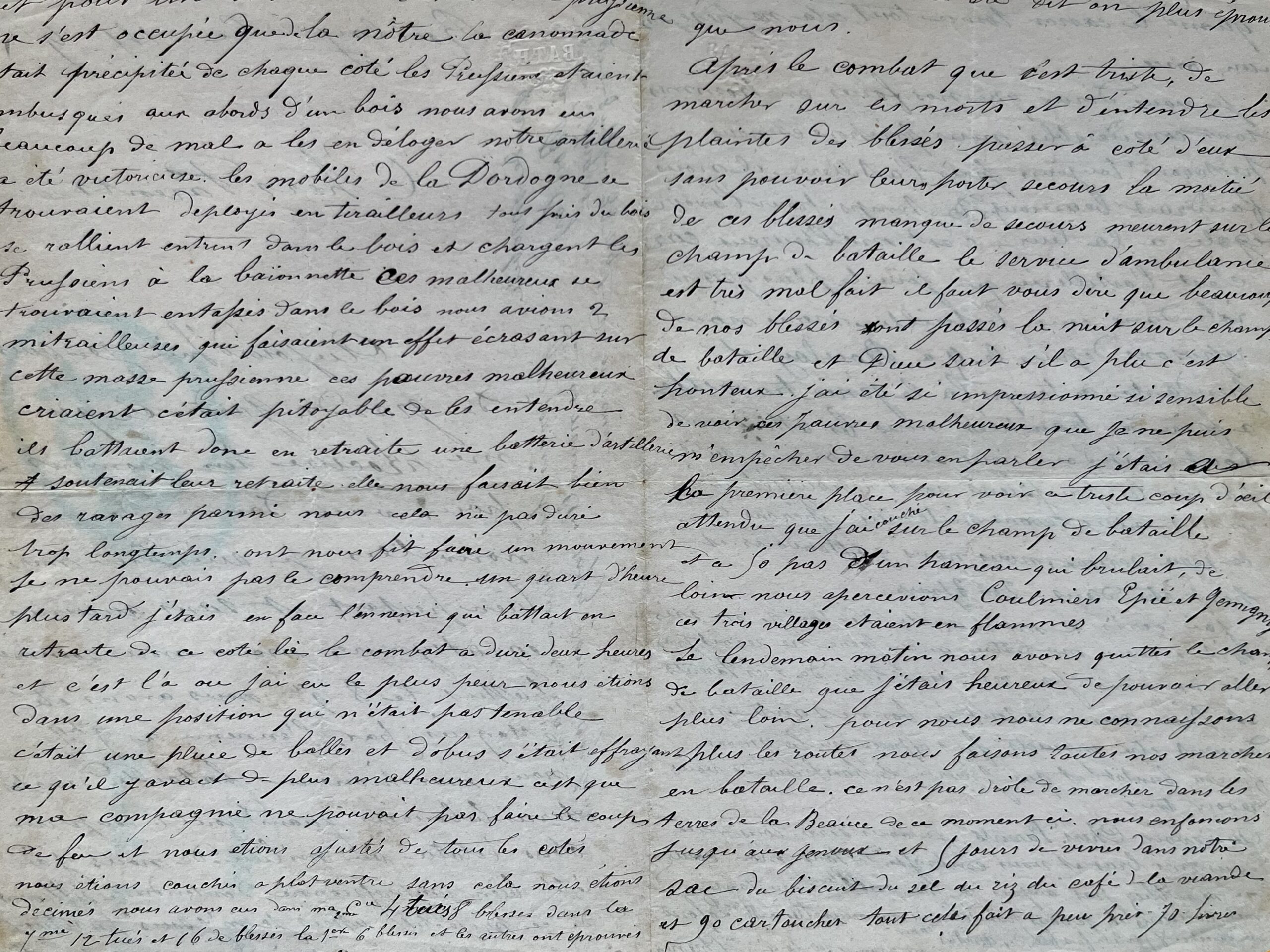 « […] la canonnade était précipitée de chaque côté, les Prussiens étaient embusqués aux abords d'un bois ; nous avons eu beaucoup de mal à les en déloger, notre artillerie a été victorieuse. Les mobiles de la Dordogne se trouvaient déployés en tirailleurs tout près du bois, se rallient, entrent dans le bois et chargent les Prussiens à la baïonnette. Ces malheureux se trouvaient entassés dans ce bois, nous avions 2 mitrailleuses qui faisaient un effet écrasant sur cette masse prussienne ; ces pauvres malheureux criaient, c'était pitoyable de les entendre ; ils battaient donc en retraite, une batterie d'artillerie soutenait leur retraite, elle nous faisait bien des ravages parmi nous […]. C'est là où j'ai eu le plus peur. Nous étions dans une position qui n'était pas tenable, c'était une pluie de balles et d'obus, c'était effrayant. Ce qu'il y avait de plus malheureux c'est que ma compagnie ne pouvait pas faire le coup de feu et nous étions ajustés de tous les côtés. Nous étions couchés à plat ventre sans cela nous étions décimés. Nous avons eu dans ma compagnie 4 tués 8 blessés […] Après le combat, que c'est triste de marcher sur les morts et d'entendre les plaintes des blessés, passer à côté d'eux sans pouvoir leur porter secours, la moitié de ces blessés manque de secours, meurent sur le champ de bataille, le service d'ambulance est très mal fait, il faut dire que beaucoup de nos blessés ont passé la nuit sur le champ de bataille et Dieu sait s'il a plu, c'est honteux. J'ai été si impressionné si sensible de voir ces malheureux que je ne puis m'empêcher de vous en parler […] ».